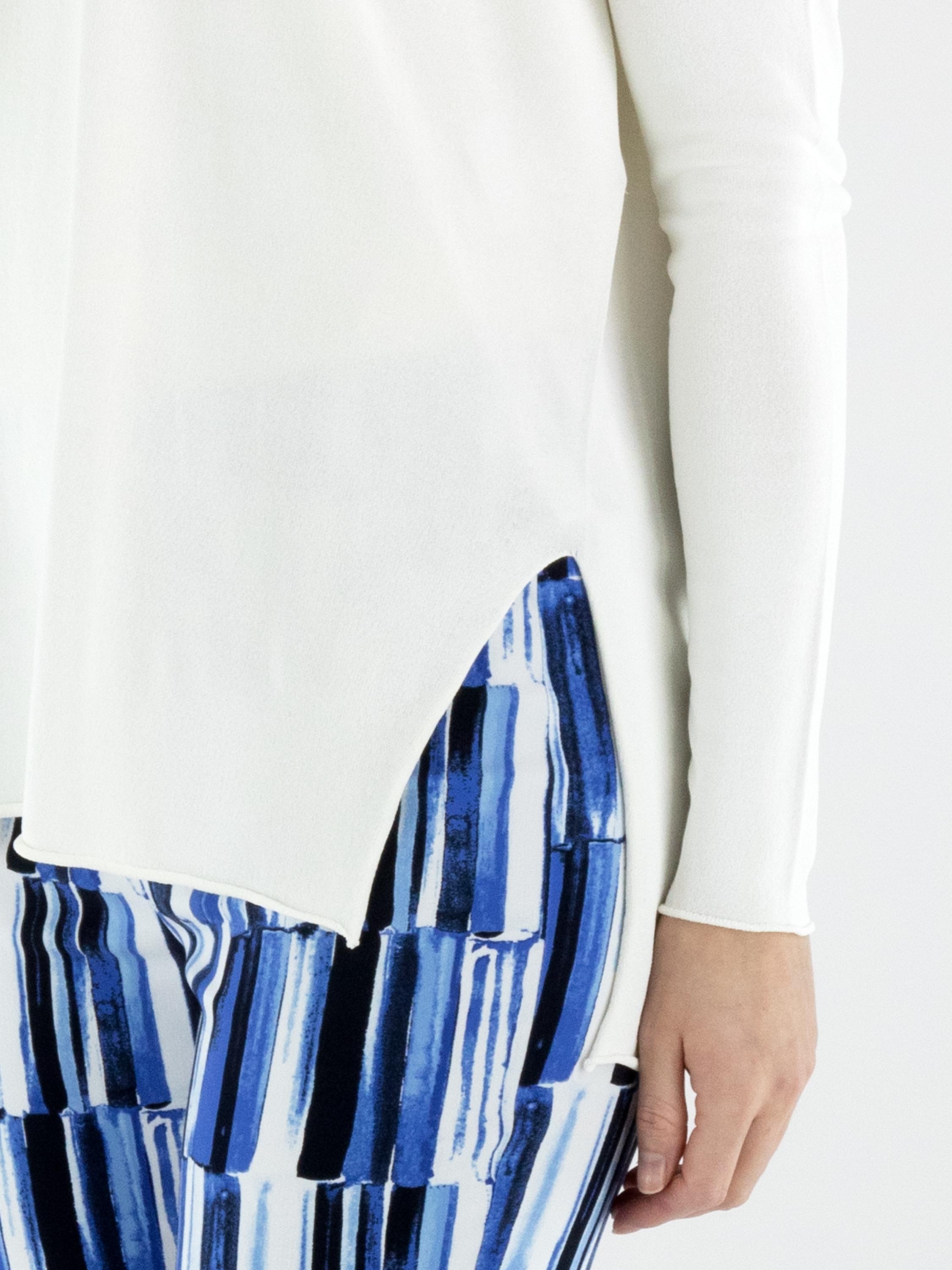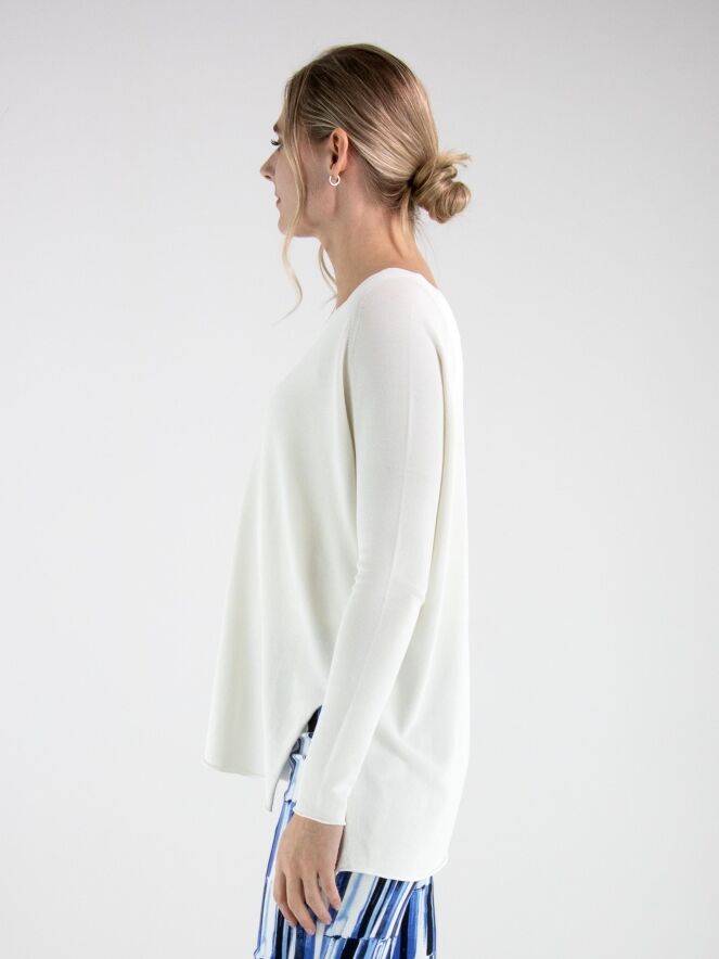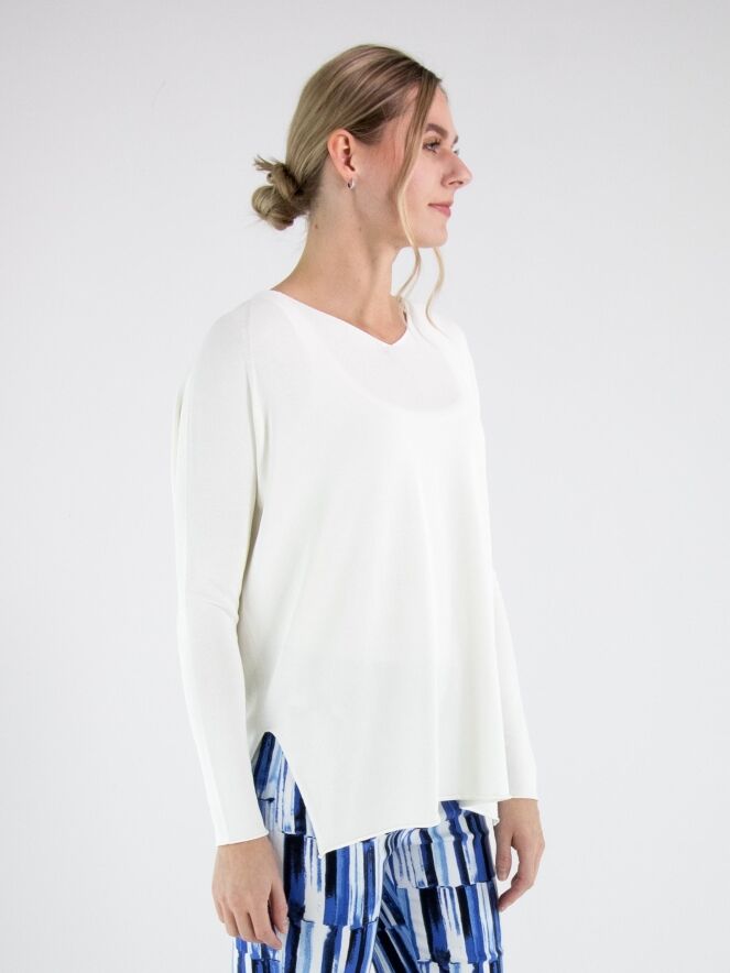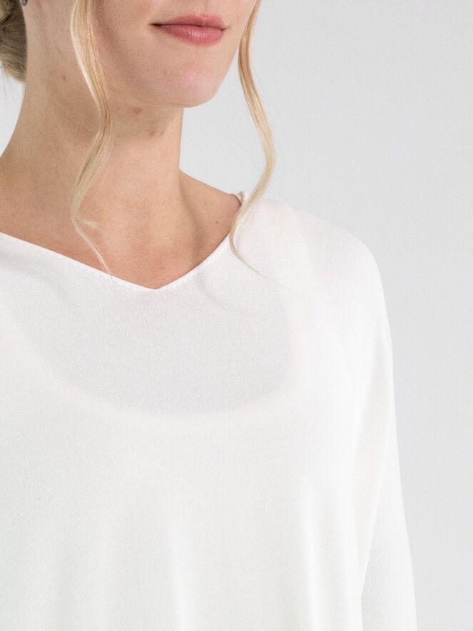 A pullover by Annette Görtz in cream white. The pullover features a V-neckline and long sleeves. Side slits are placed at the hem on both sides. The hem and the ends of the sleeves are finished with a ruffled edge. This pullover can be washed at 30 degrees.