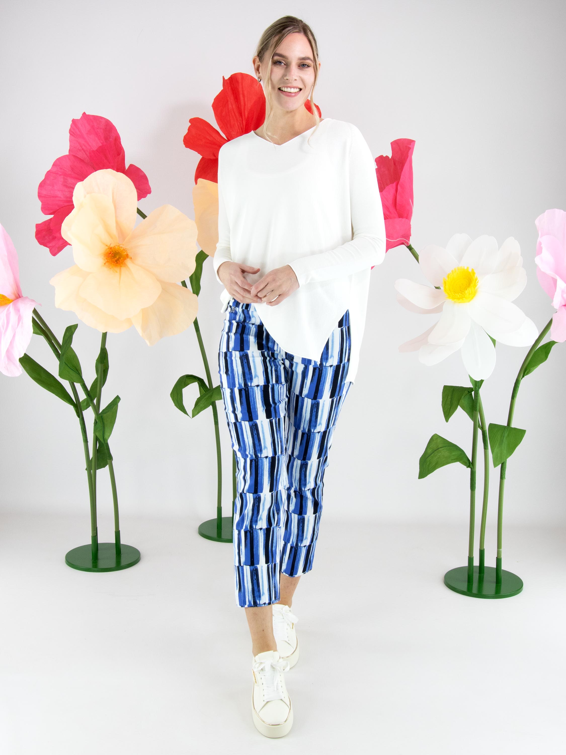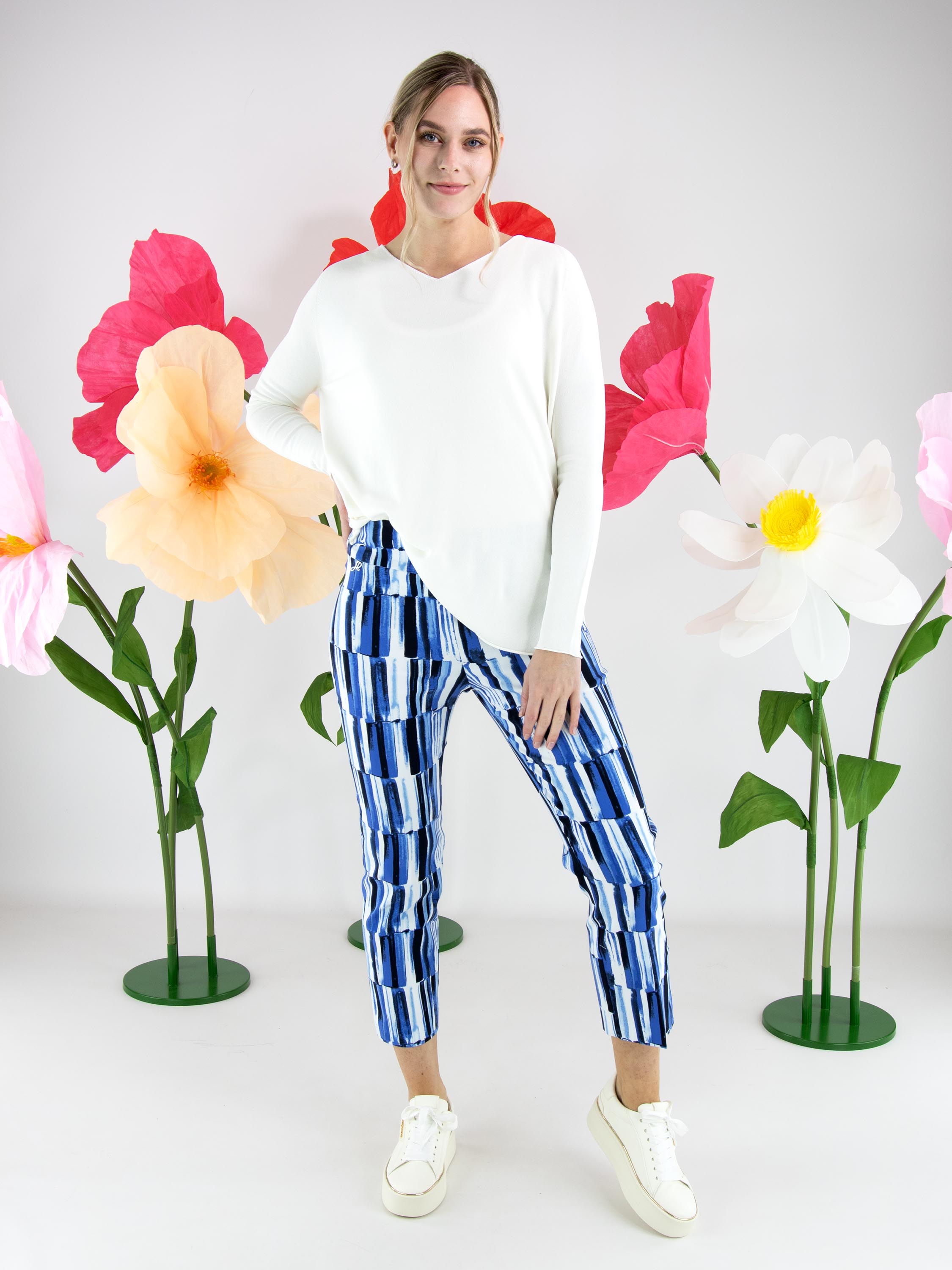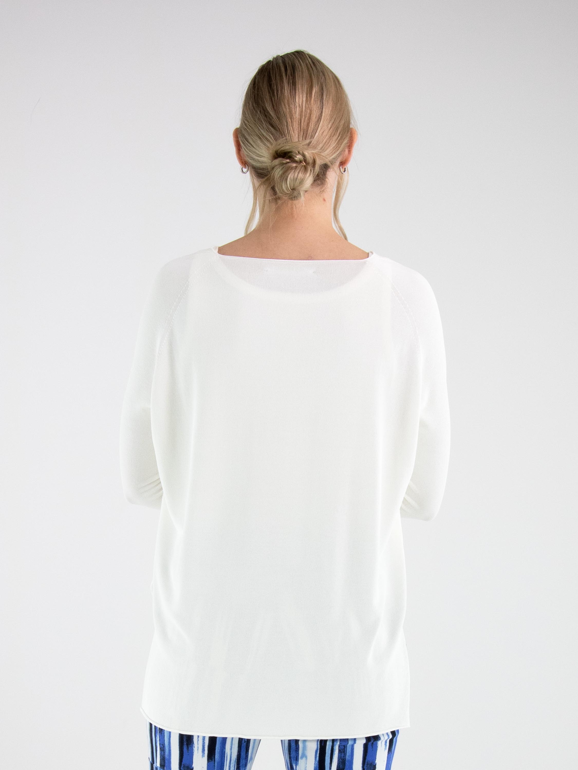 A pullover by Annette Görtz in cream white. The pullover features a V-neckline and long sleeves. Side slits are placed at the hem on both sides. The hem and the ends of the sleeves are finished with a ruffled edge. This pullover can be washed at 30 degrees.