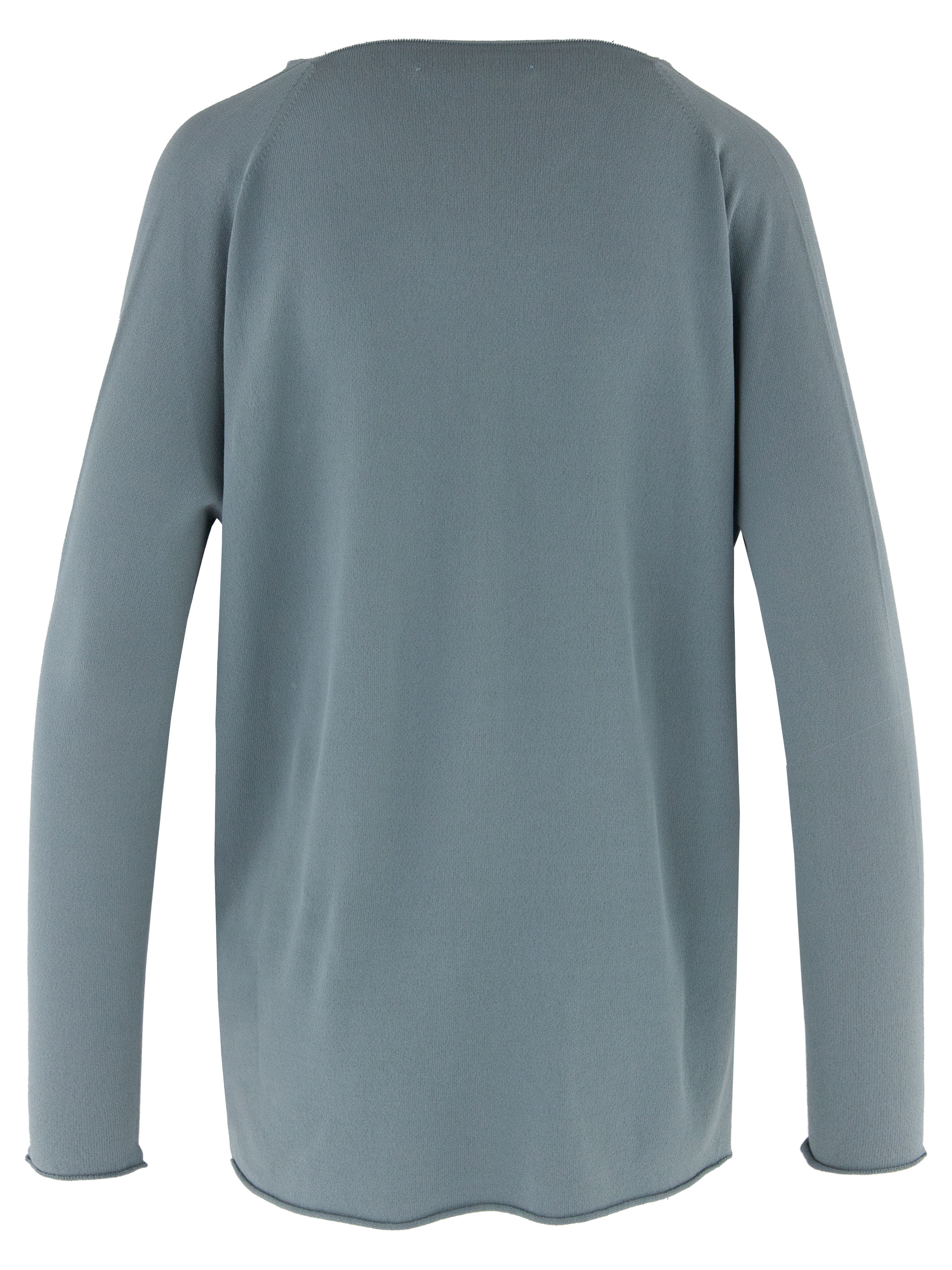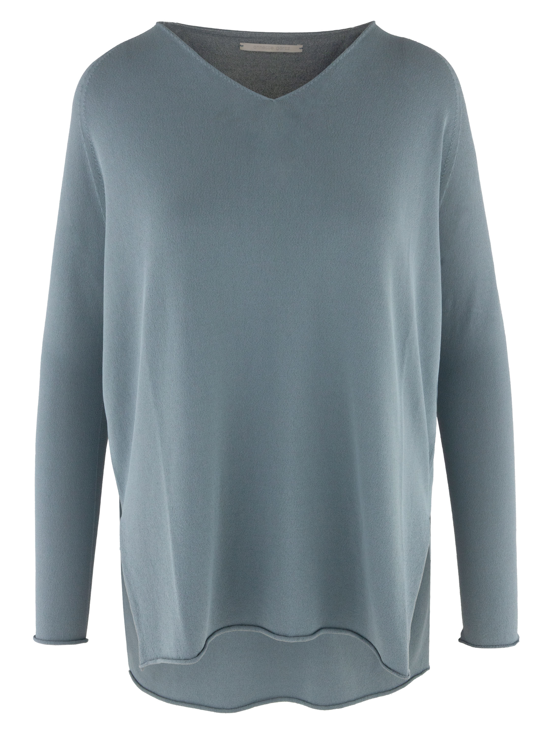 A pullover by Annette Görtz in blue. The pullover features a V-neckline and long sleeves. Side slits are applied at the hem on both sides. The hem and the ends of the sleeves are finished with a softly ruffled edge. This pullover can be washed at 30 degrees.