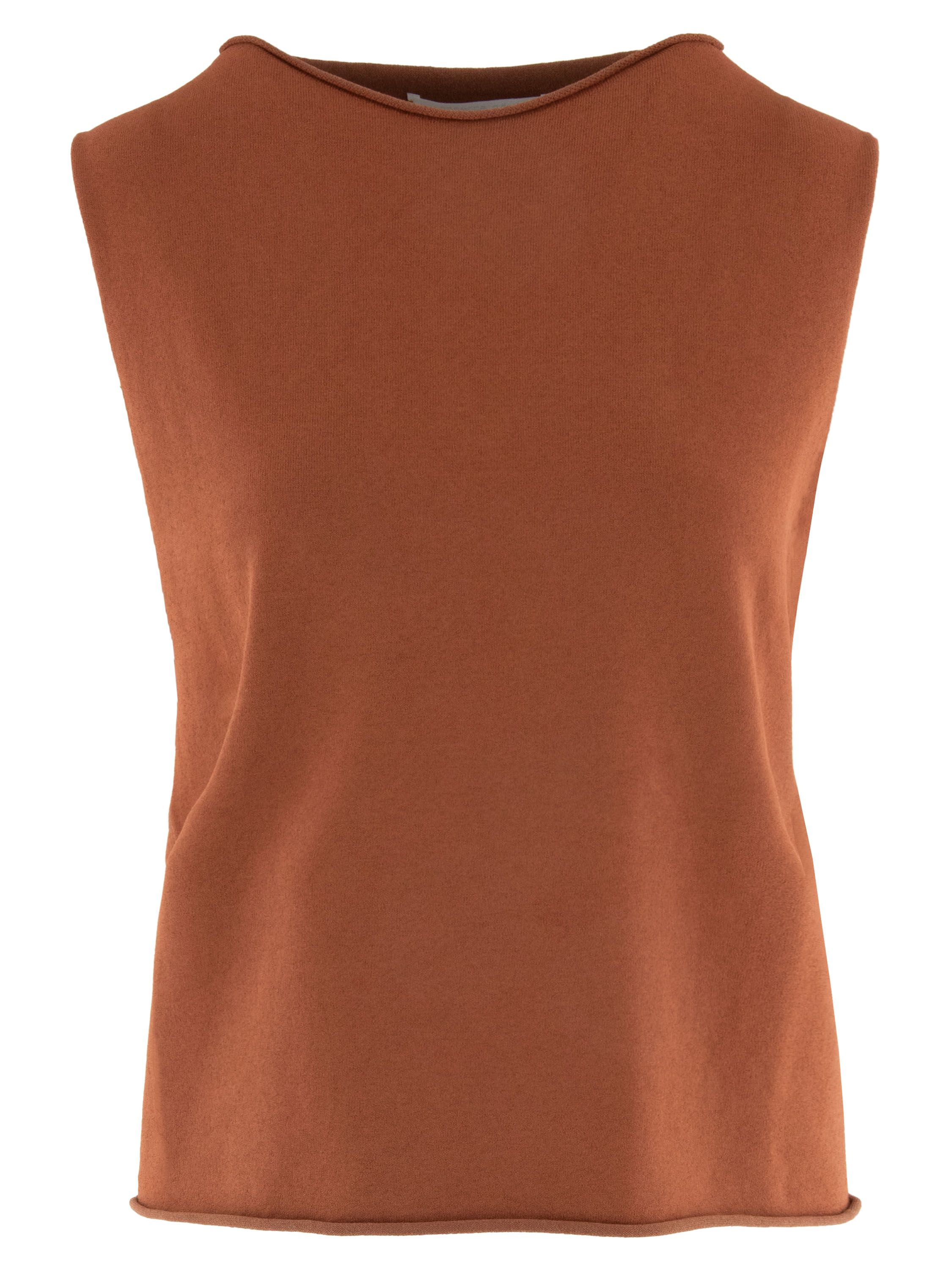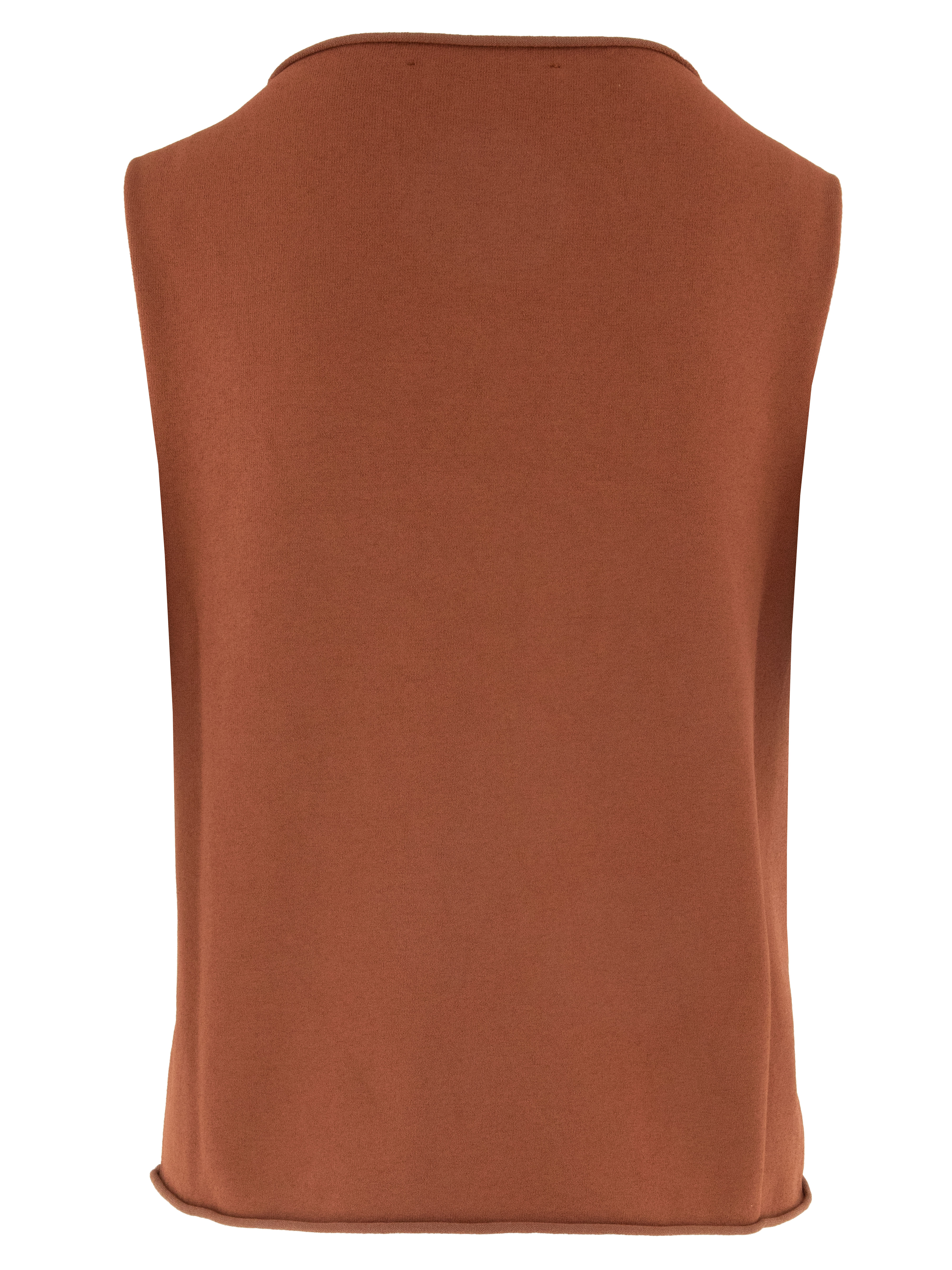 A top by Annette Görtz in a rust brown shade. The edges of the round neckline, the armholes and the hem are finished with a ruffled effect. This top can be washed at 30 degrees.