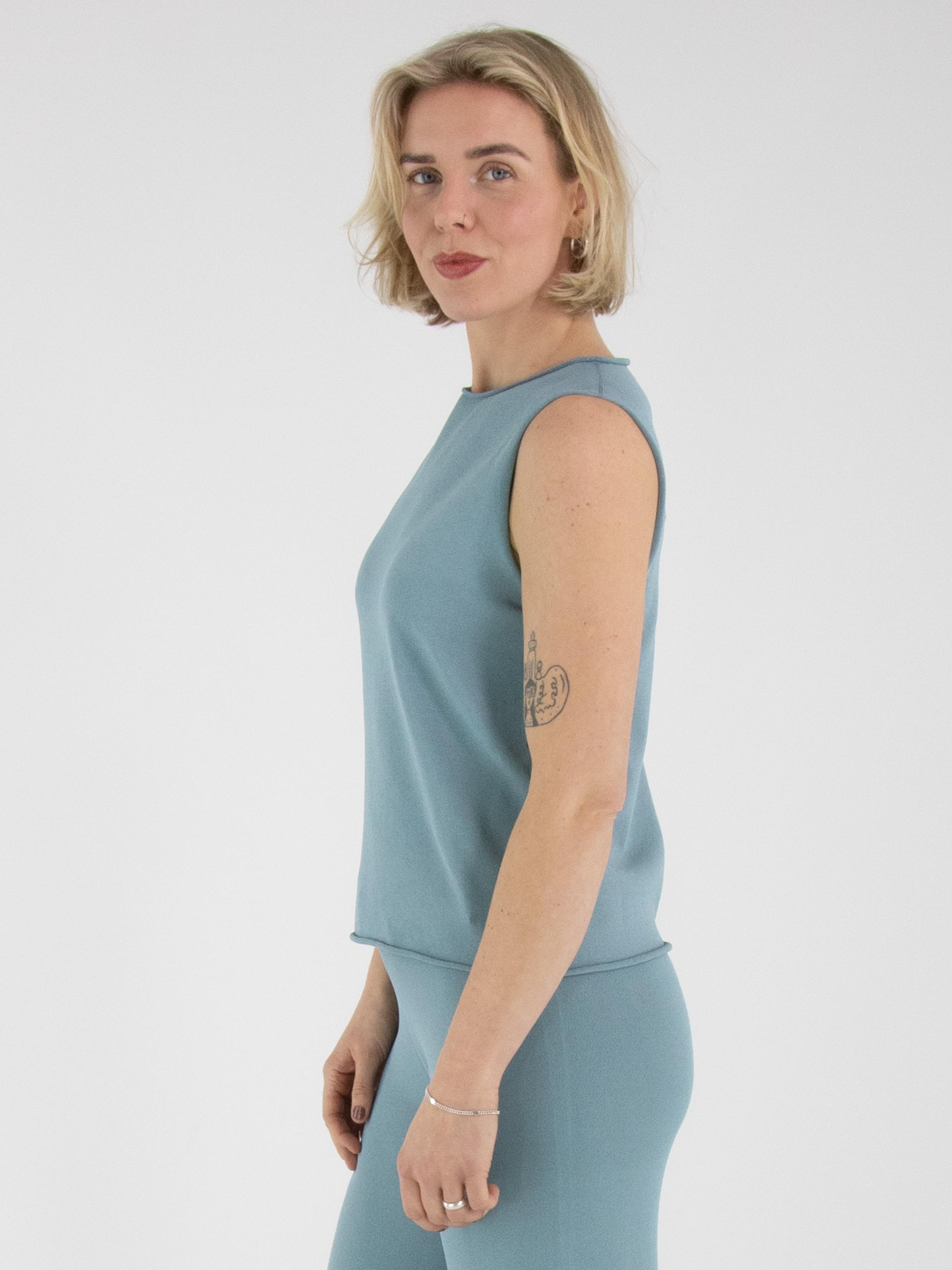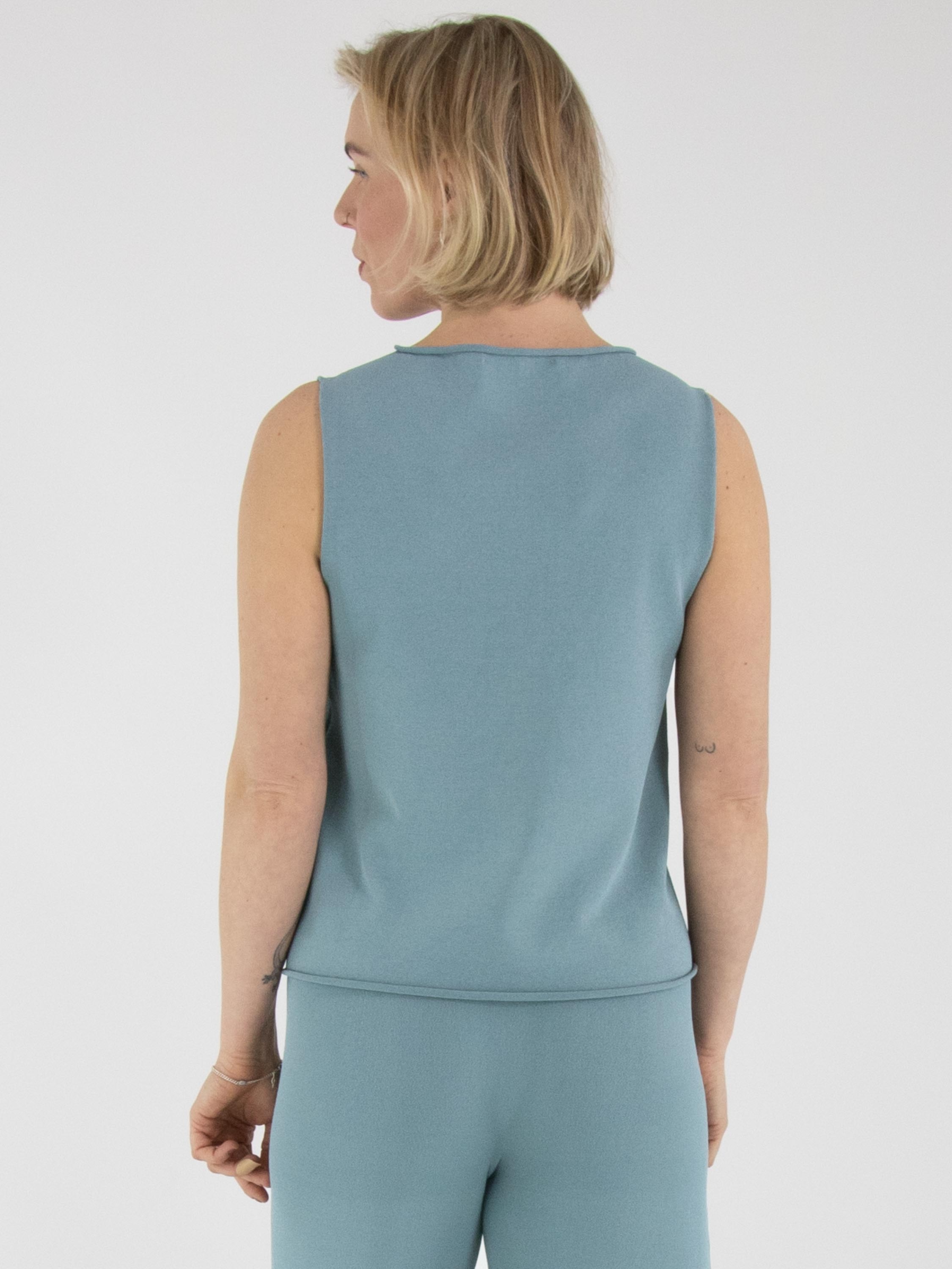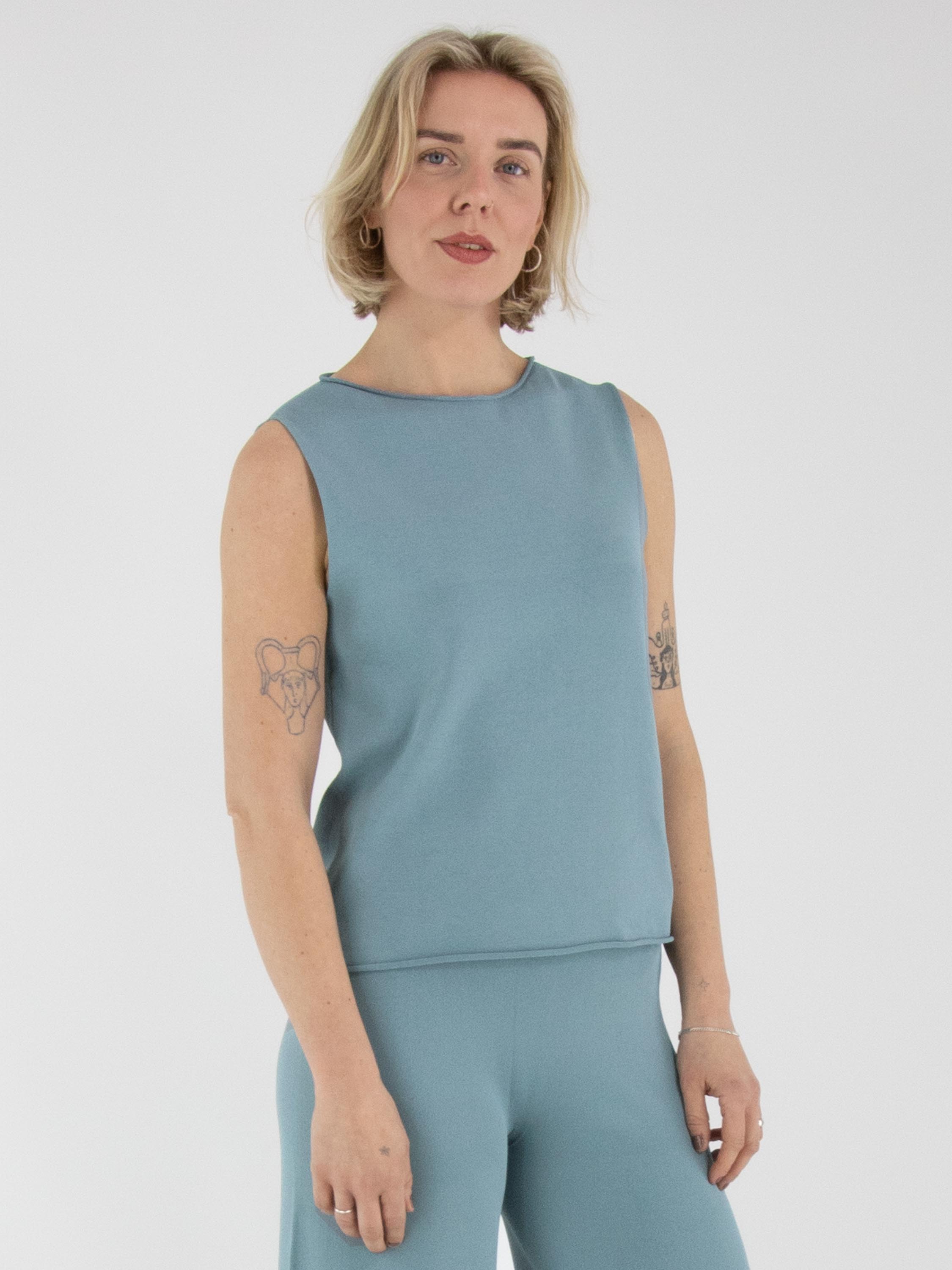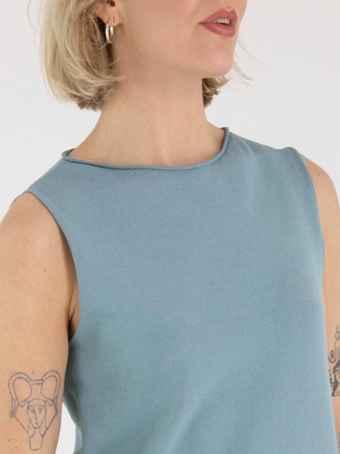 A top by Annette Görtz in a petrol blue shade. The edges of the round neckline, the armholes and the hem are finished with a ruffled effect. This top can be washed at 30 degrees.