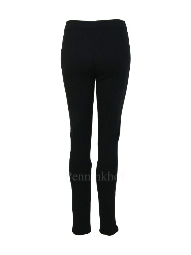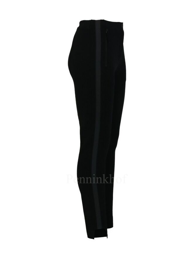 An elastic pants by Annette Görtz in the color black. The pockets have a vertical zipper. Along the sides is a wide matte black trim. There is a notch on the bottom of the pipes on the outside. These pants can be hand washed.