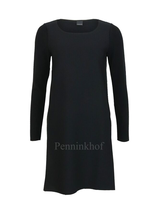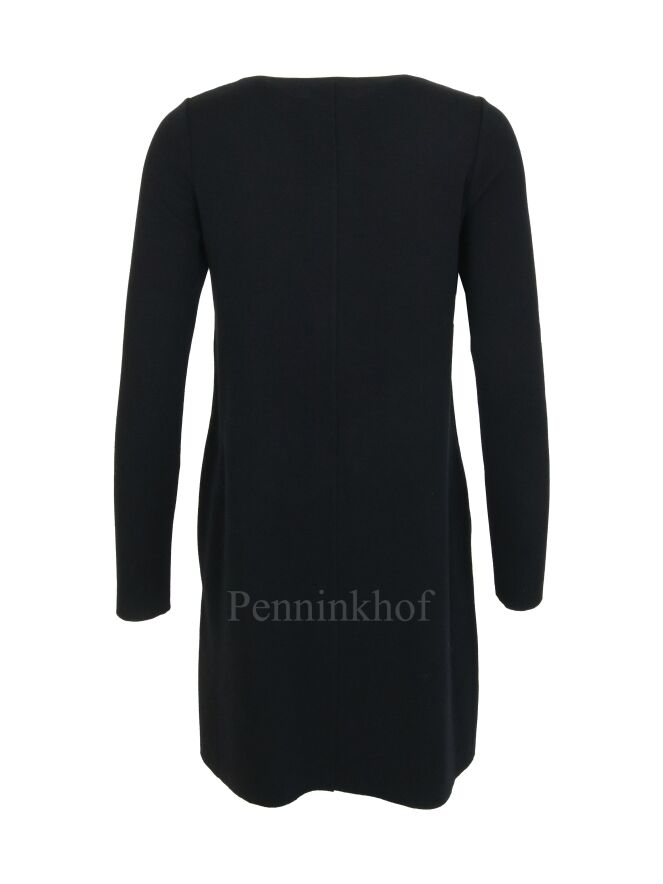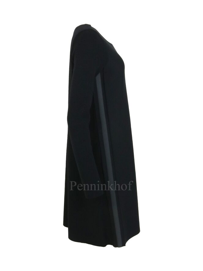A dress by Annette Görtz in the color black. There are reverse stitching on both sides of the dress with a matte black trim in between. The dress has a round neck, long sleeves and can be washed by hand.