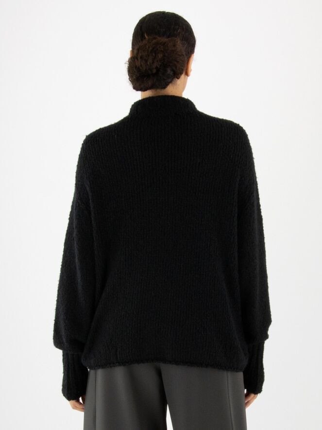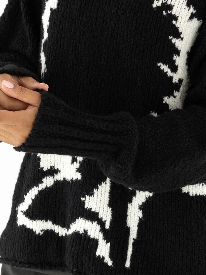 A luxurious pullover by Annette Görtz featuring a black and white graphic print. The pullover has a turtleneck and long sleeves. This pullover should be hand-washed.