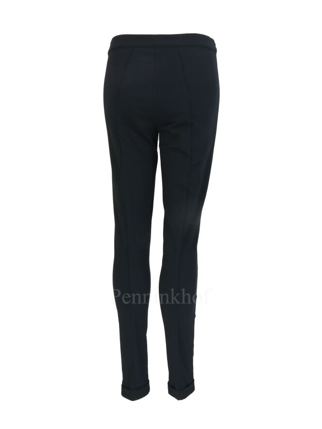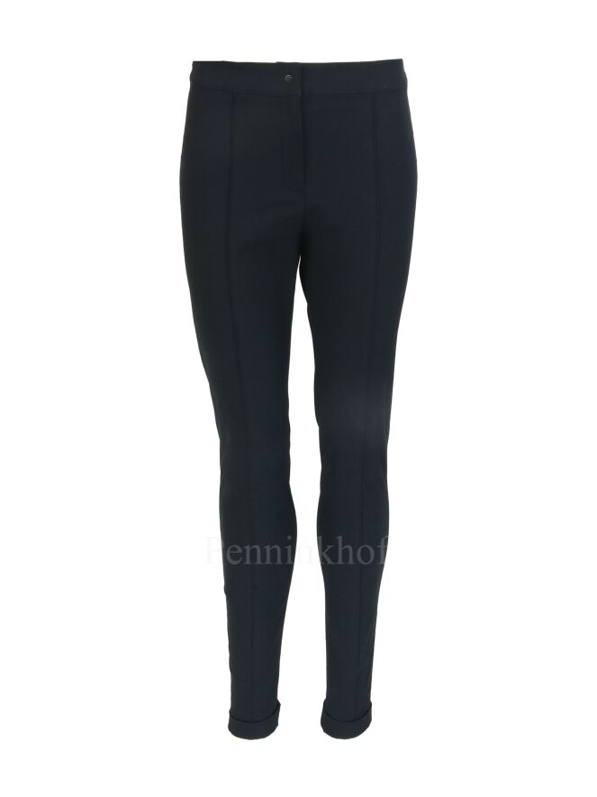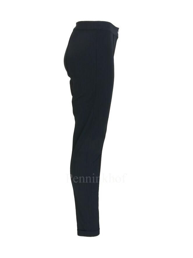 Trousers by Annette Görtz in the color black. The fabric is in a crêpe embossed structure. There is a stitched seam in the middle of the legs. There is a short cover at the bottom. These pants can be washed at 30 degrees.