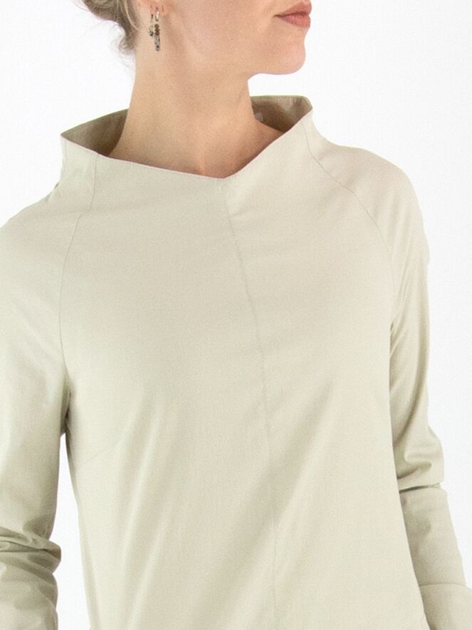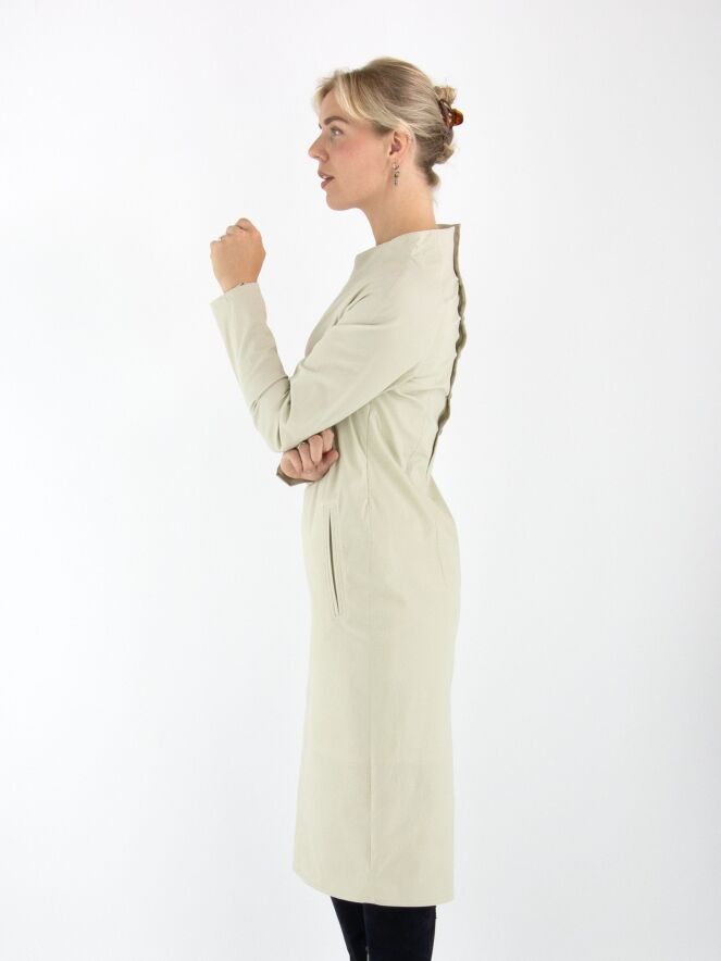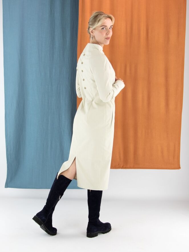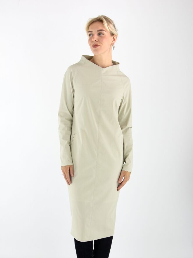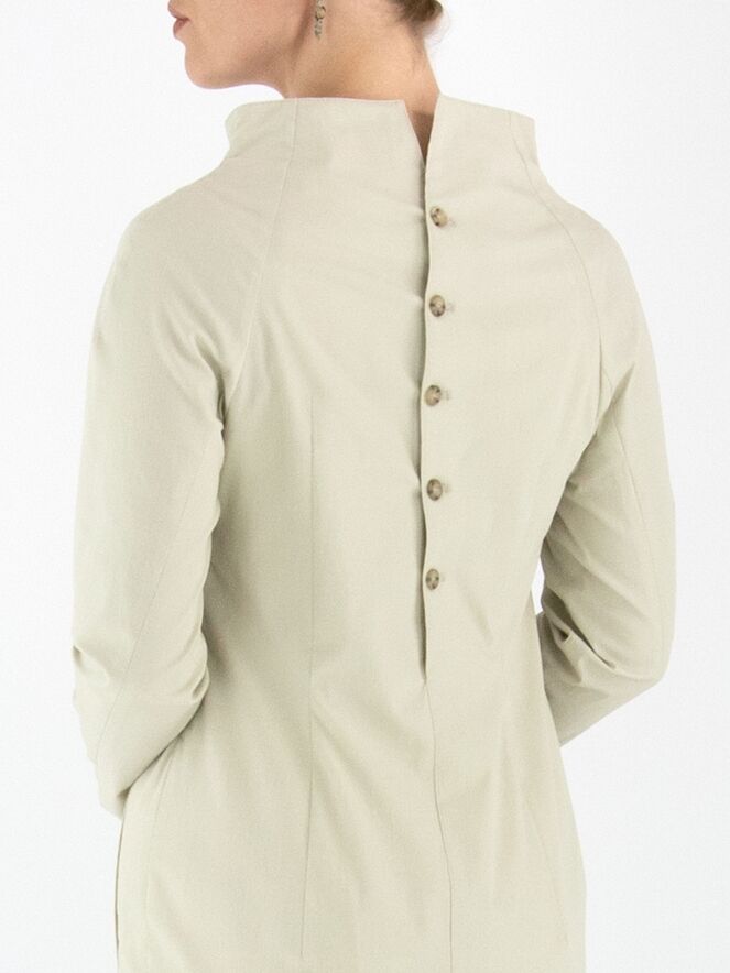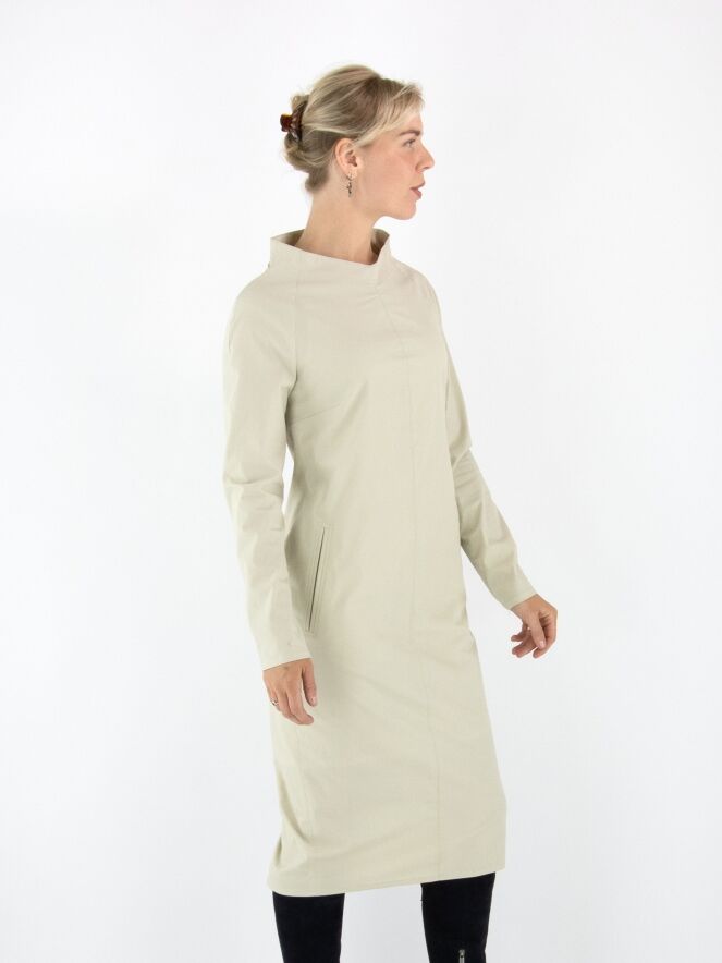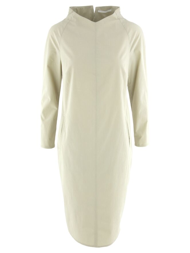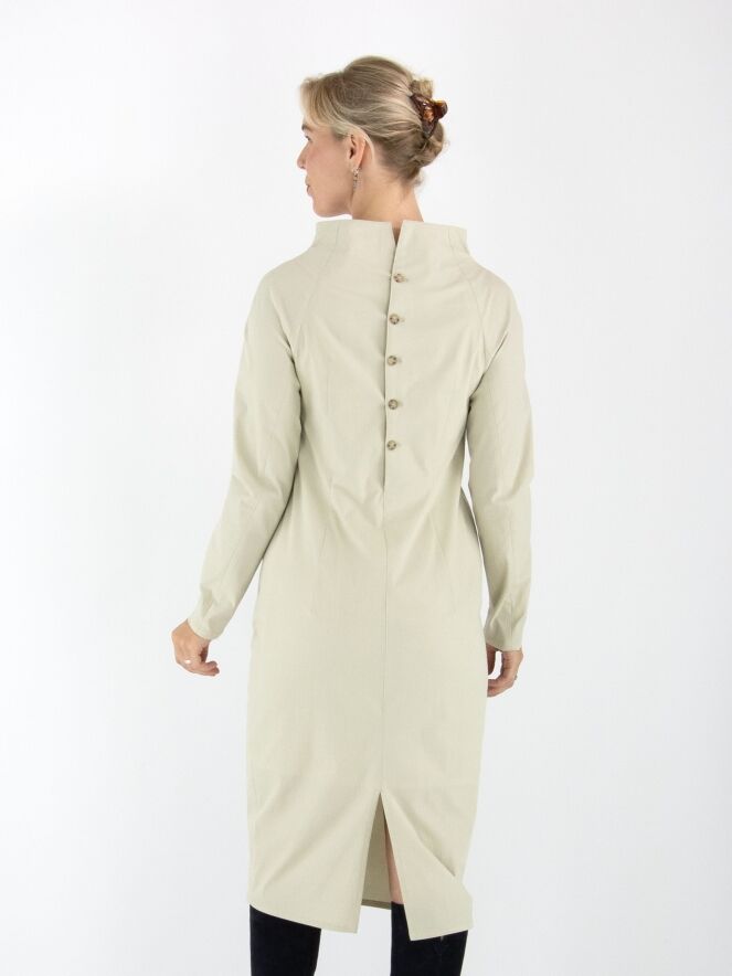 A dress by Annette Görtz in a sand colour. The dress features a high V-neckline and slit pockets at the waist. At the back, a button fastening runs from the neckline to the waistline. The dress is lined and should be hand-washed.