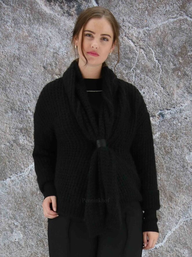 An open knitted cardigan by Annette Görtz in a black color. The closure is with a press stud with a decorative leather trim. The vest has a hanging turtleneck and can be washed by hand.