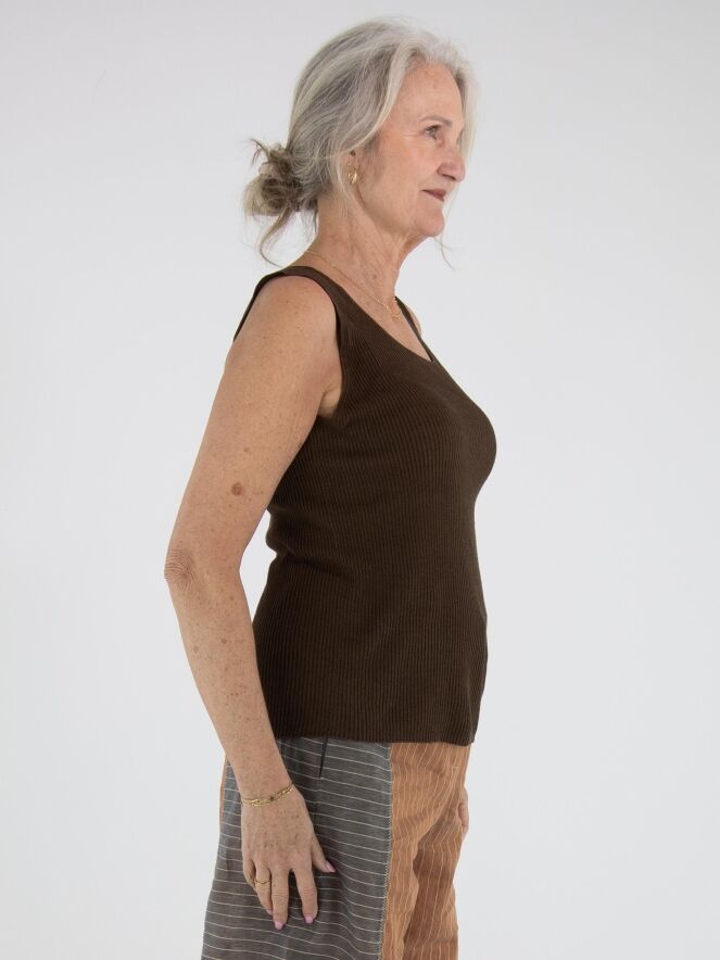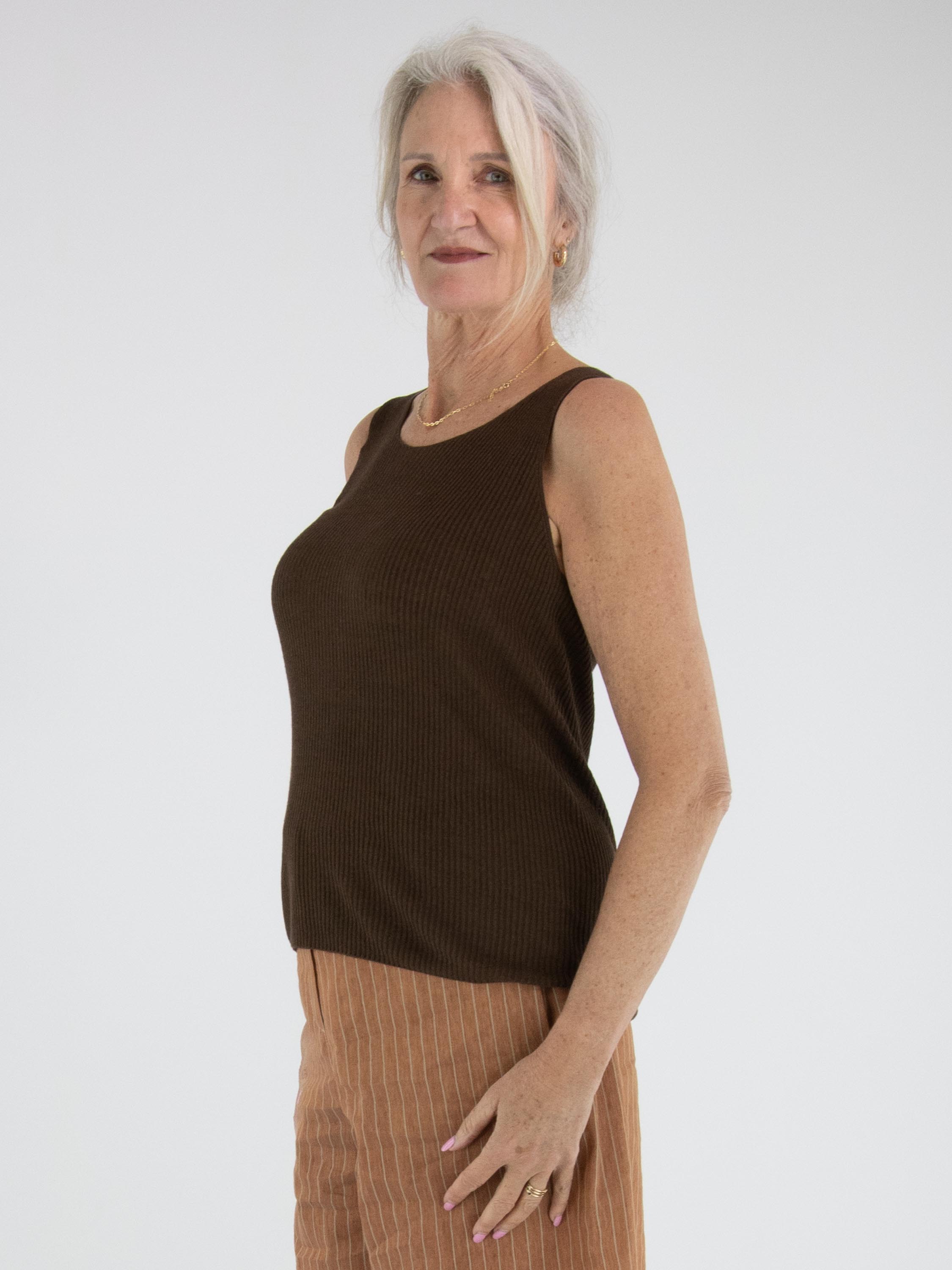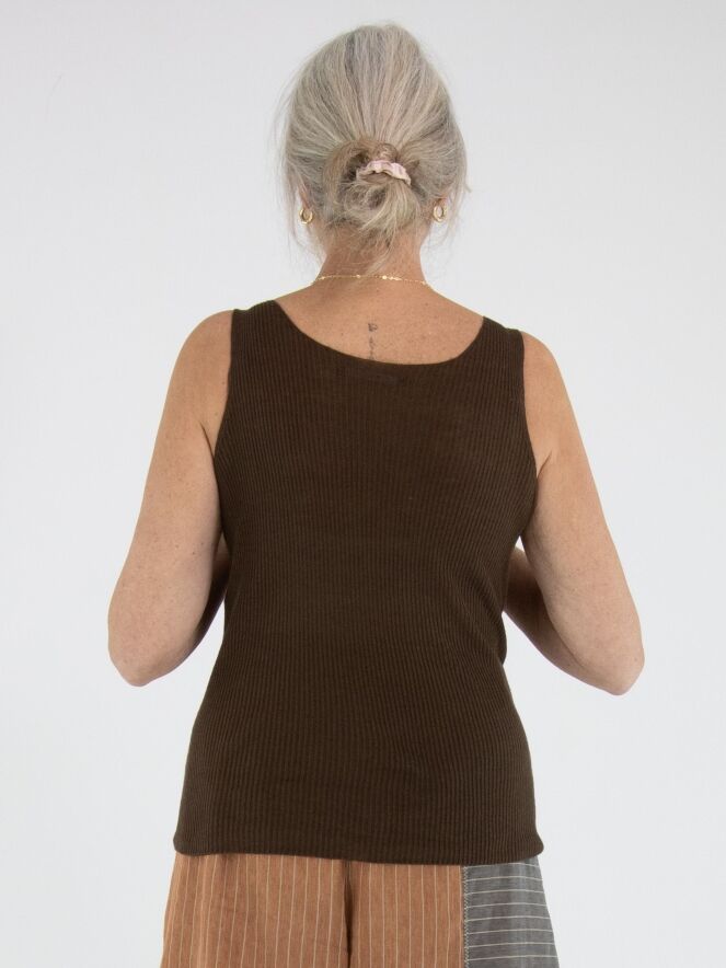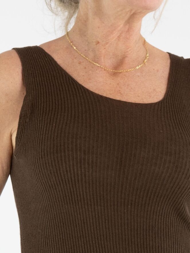 Top by Annette Görtz in a warm mocha brown shade. The fabric features a subtle ribbed texture, adding a refined and contemporary touch. Designed with a round neckline and shoulder straps approximately 3 cm wide. This top should be hand-washed.