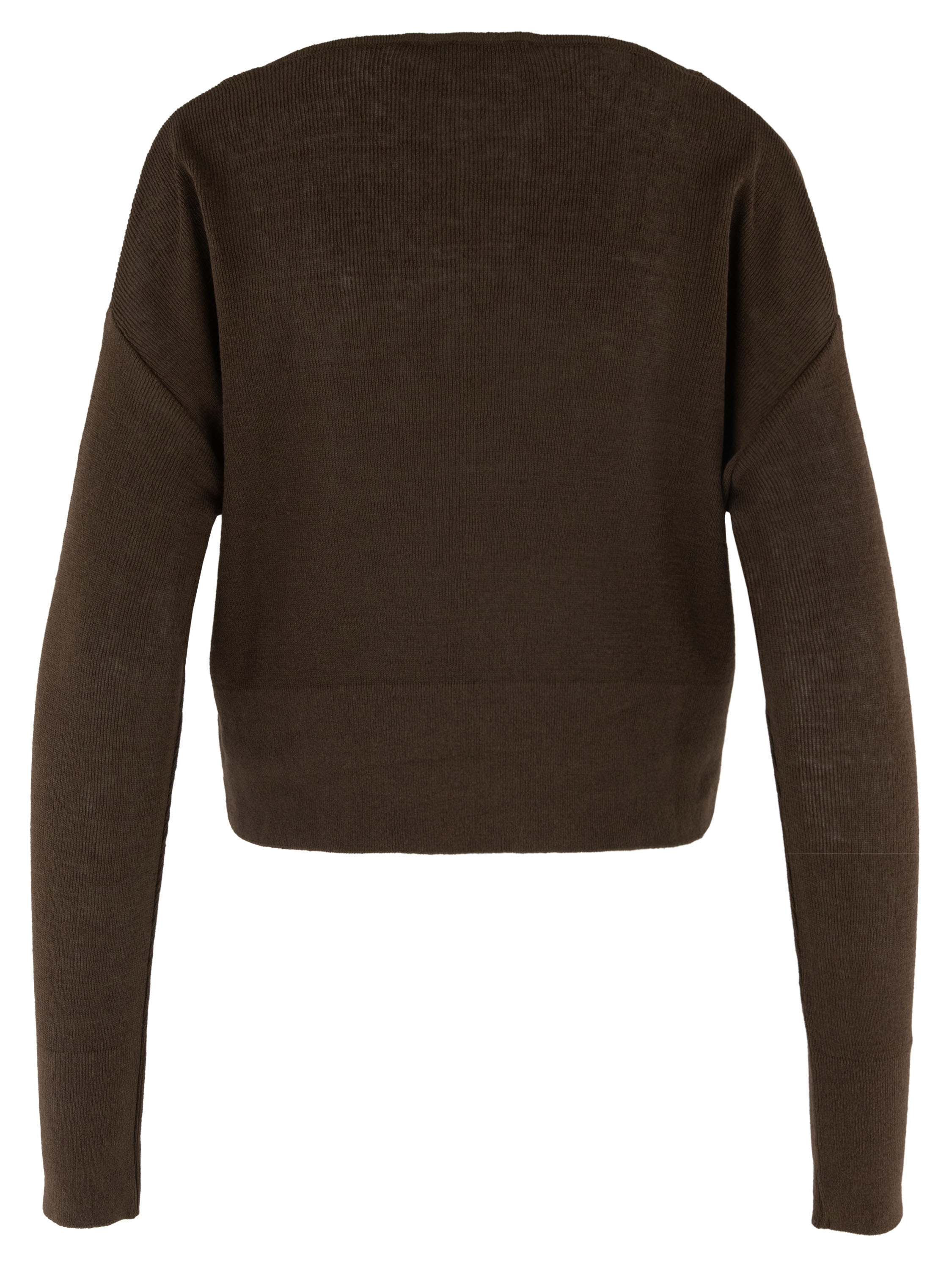 A short luxury pullover by Annette Görtz in a mocha brown shade. The pullover features a draped neckline. Along the neckline, a thin adjustable tie made from the same fabric is attached at the front of both shoulders. The hem and the ends of the long sleeves are finished with a wide, finely ribbed trim. This pullover can be hand-washed.