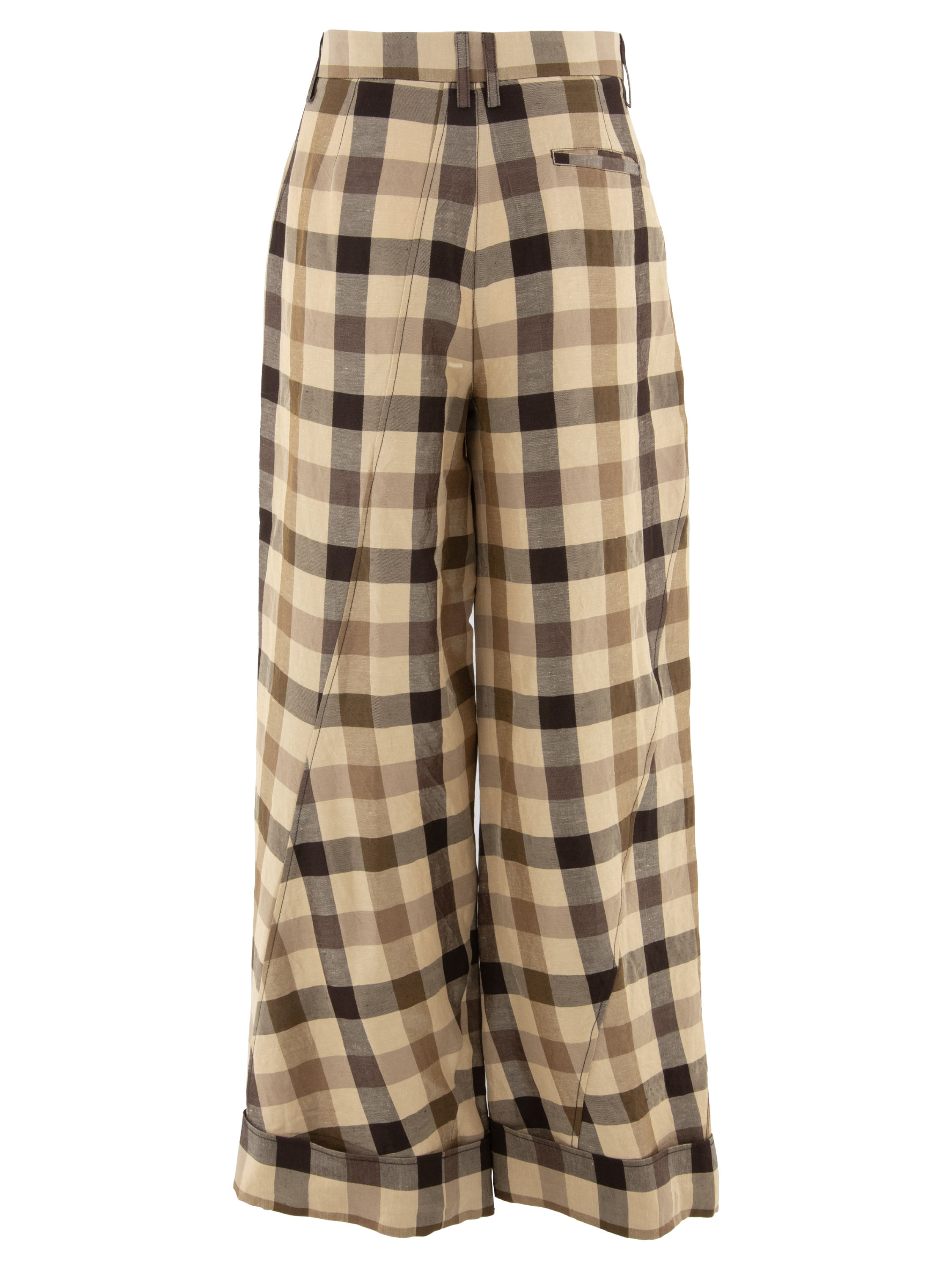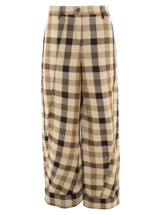 A wide-leg trouser by Annette Görtz featuring a block pattern in multiple shades of camel and dark brown. From the center front, a diagonal seam runs towards the left leg, while another diagonal seam extends from the right side towards the center of the right leg, creating a distinctive architectural design. The trousers are finished with wide turn-ups at the hems. Side pockets are placed below the waistband. This piece should be hand washed.