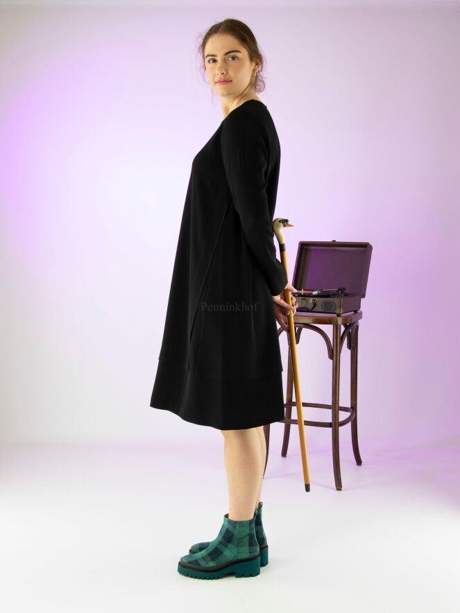 A dress by Annette Görtz in black. Along the sides, the fabric is open with a deep black fabric underneath that also appears at the bottom of the dress. The dress has a round neck and may be washed by hand.