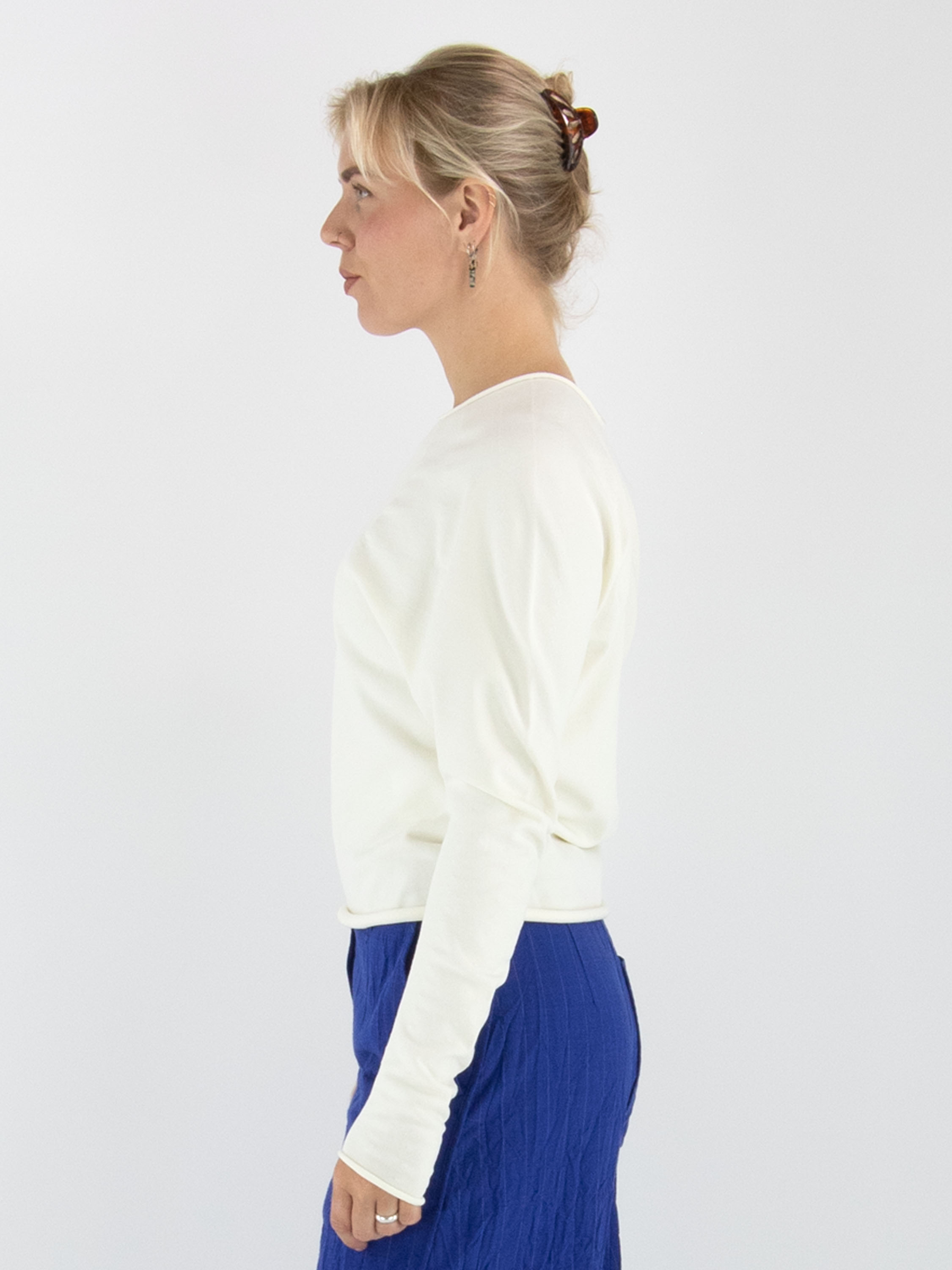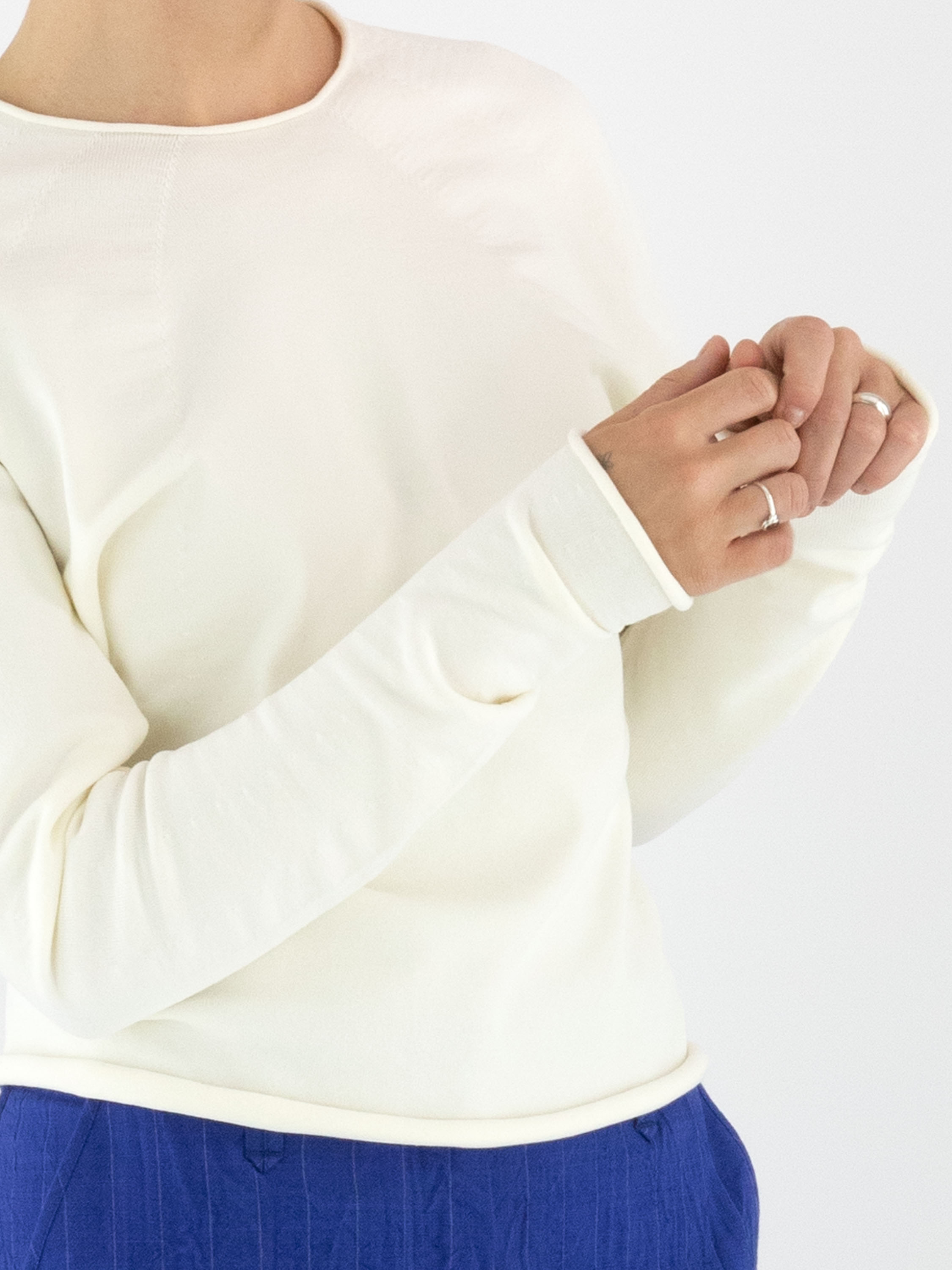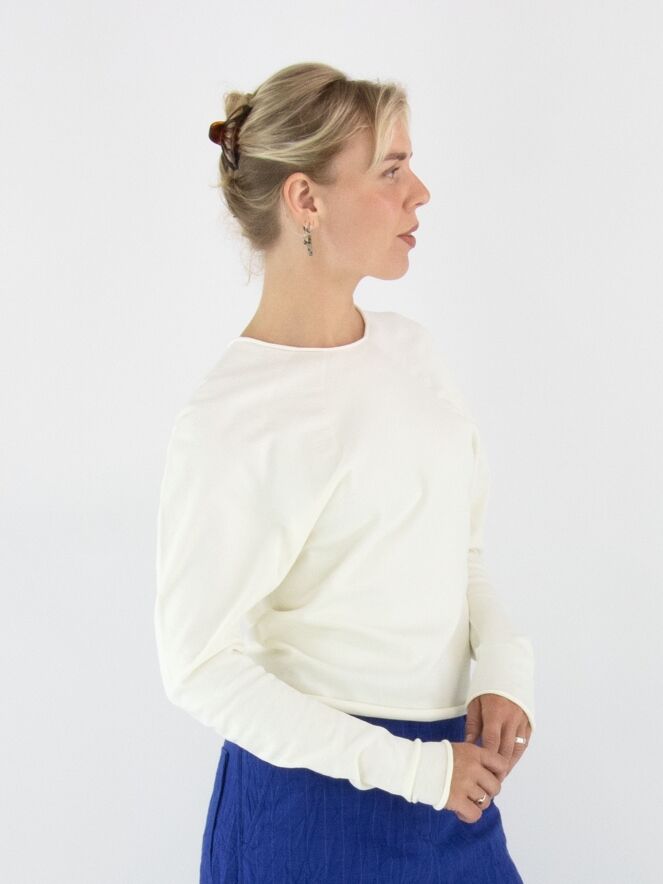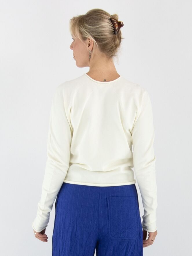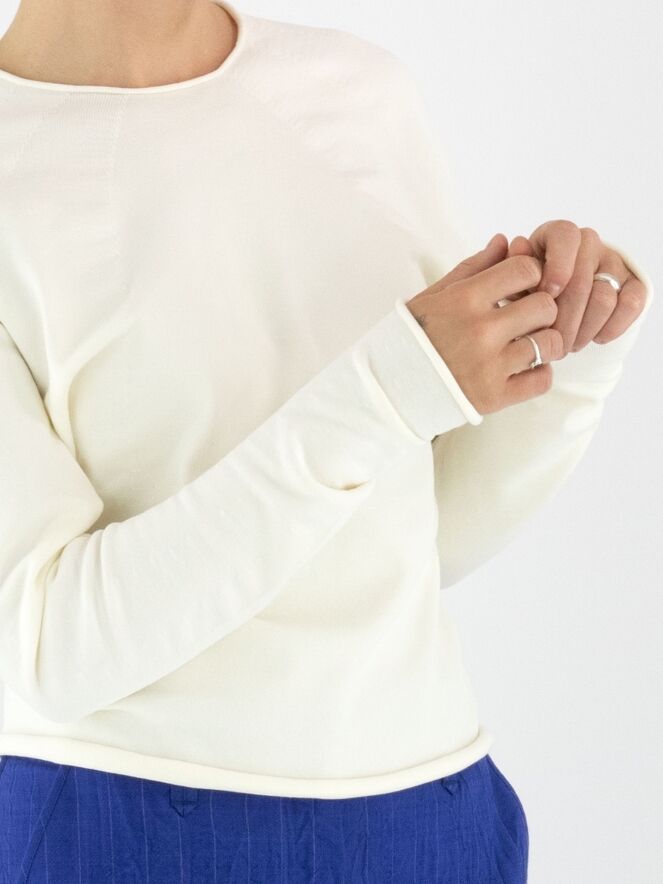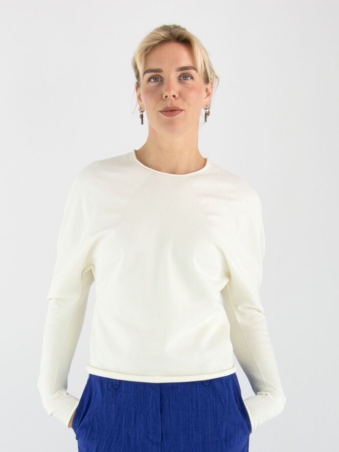 Annette Görtz pullover in a structured fabric in off-white. The edges of the round neckline, long sleeves, and hem are ruffled. From the neckline, several decorative topstitchings create a delicate smocked effect. This pullover should be hand washed.