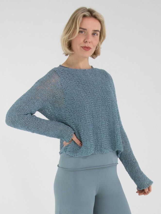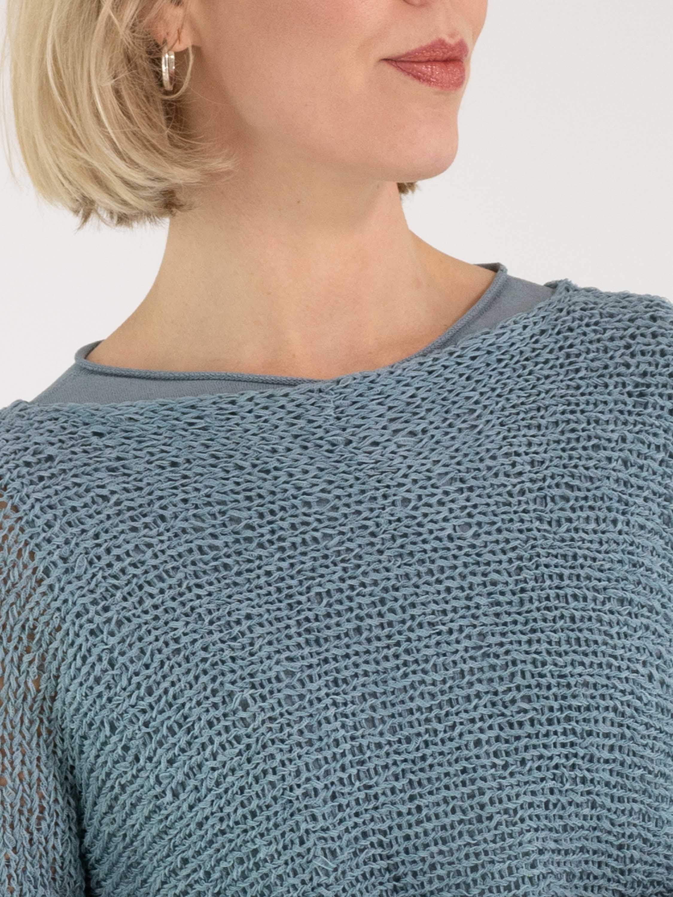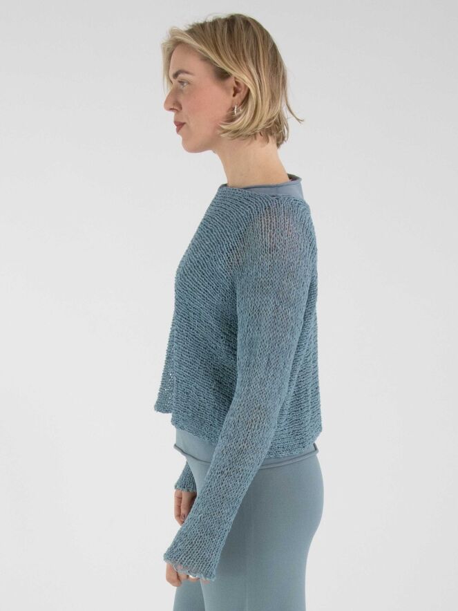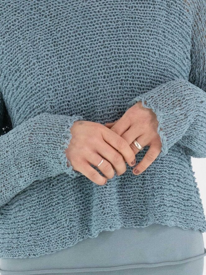 A pullover by Annette Görtz, open-knit in ribbon yarn in blue. The pullover features a round neckline and long sleeves and can be hand-washed.