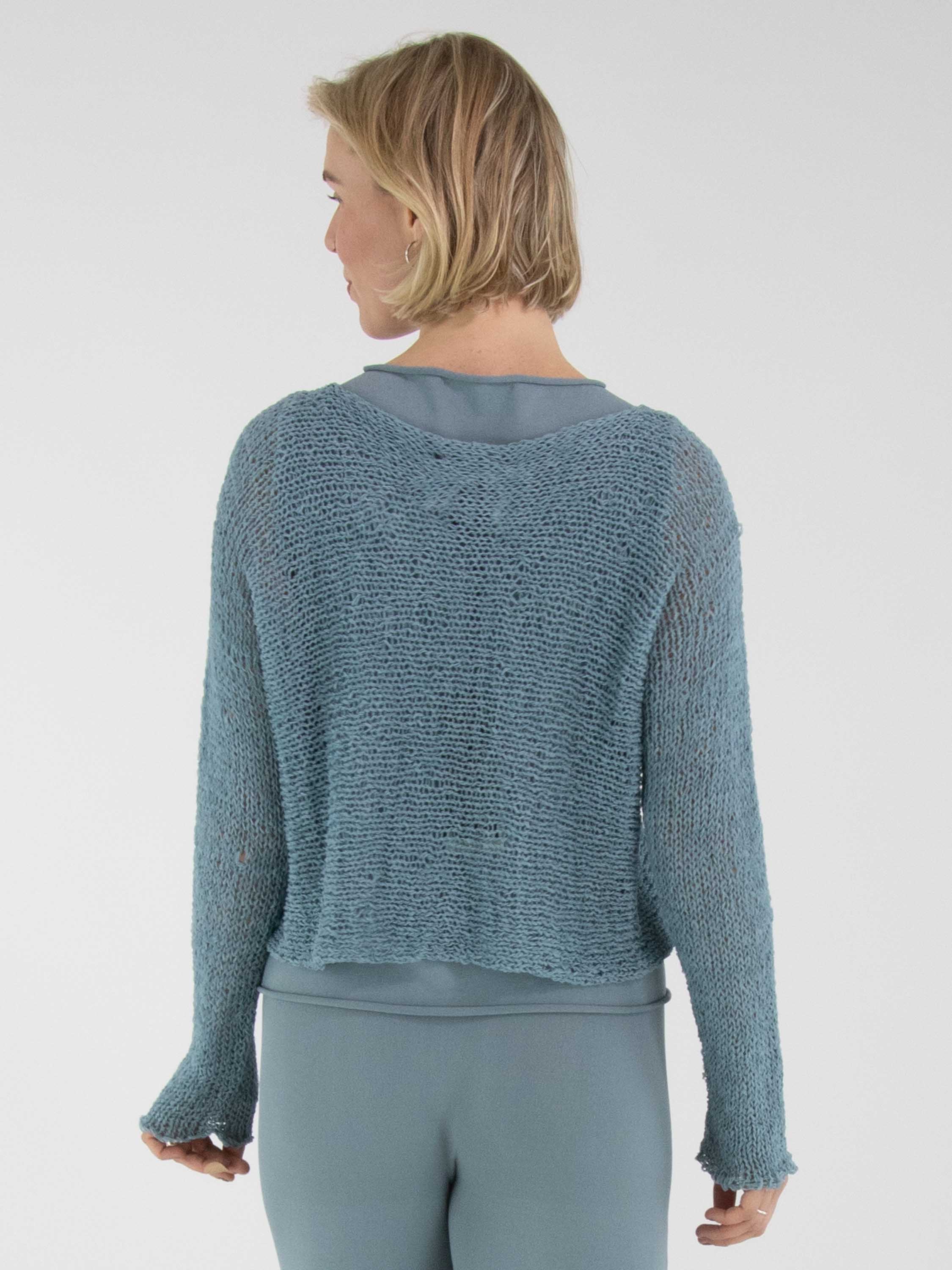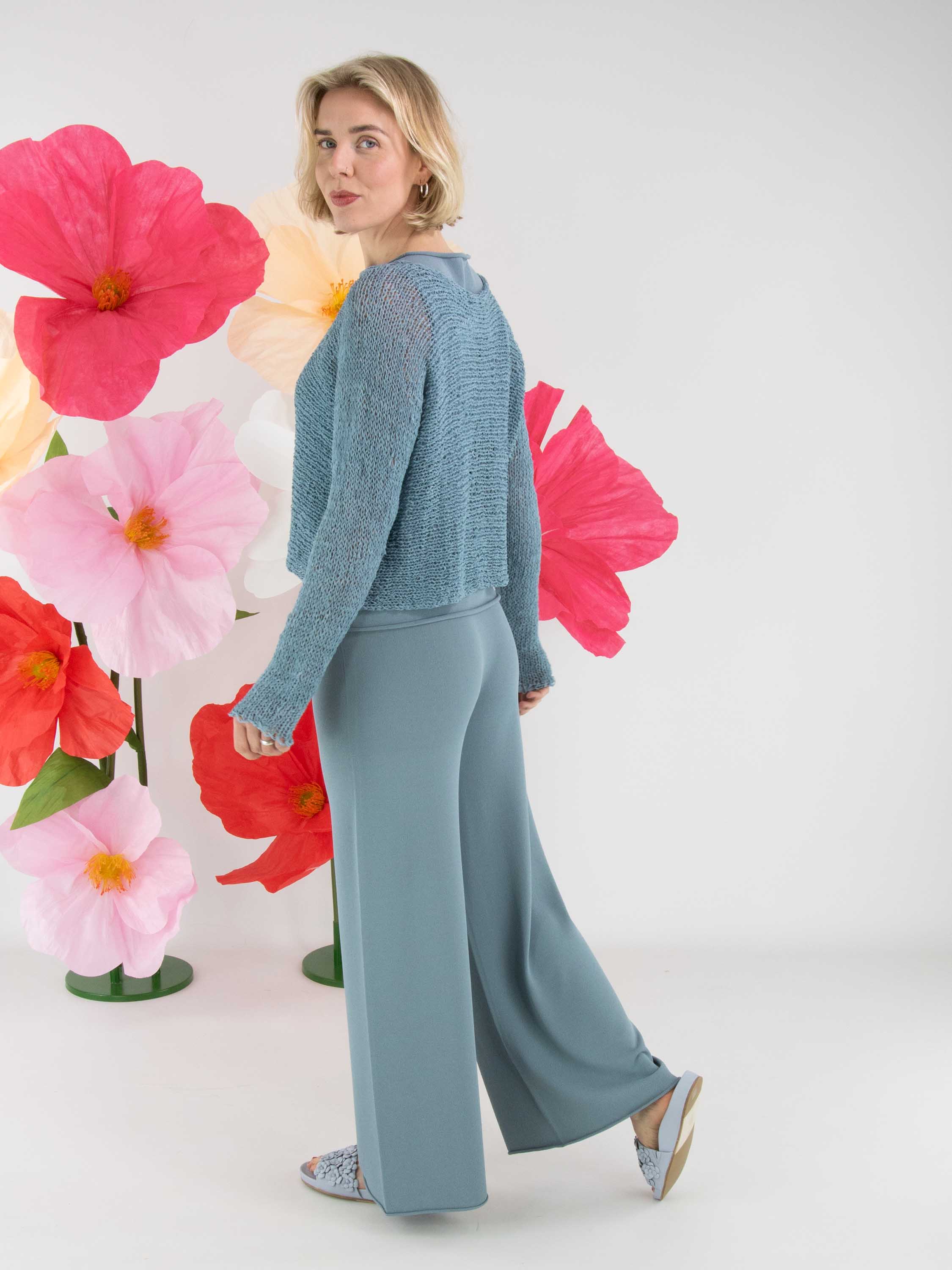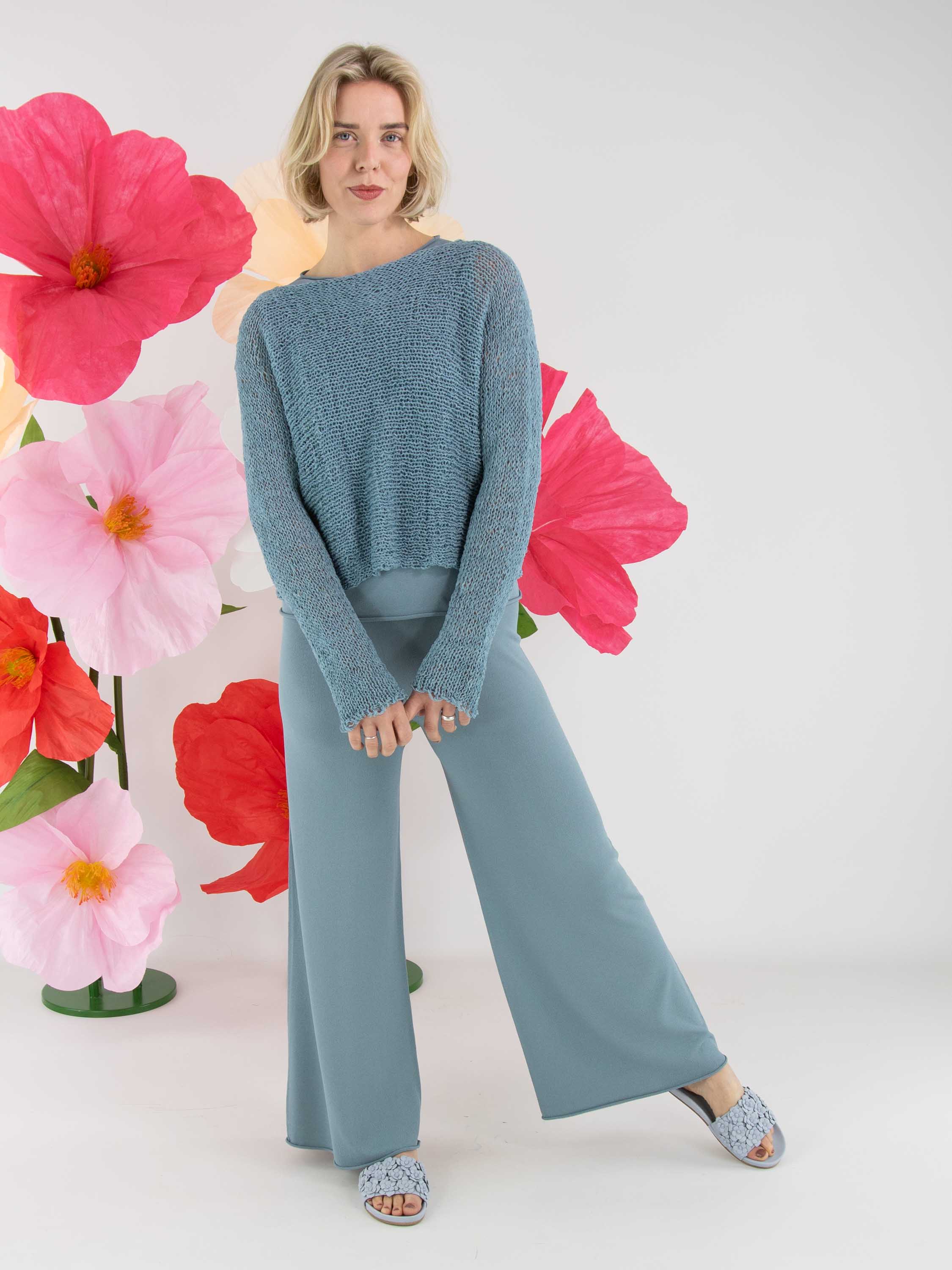 A pullover by Annette Görtz, open-knit in ribbon yarn in blue. The pullover features a round neckline and long sleeves and can be hand-washed.