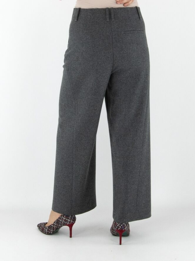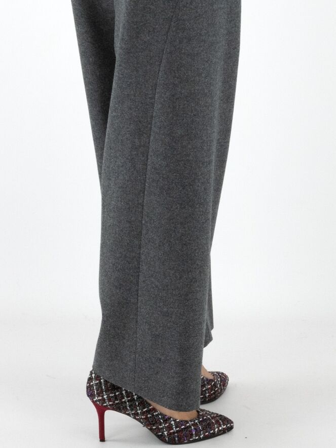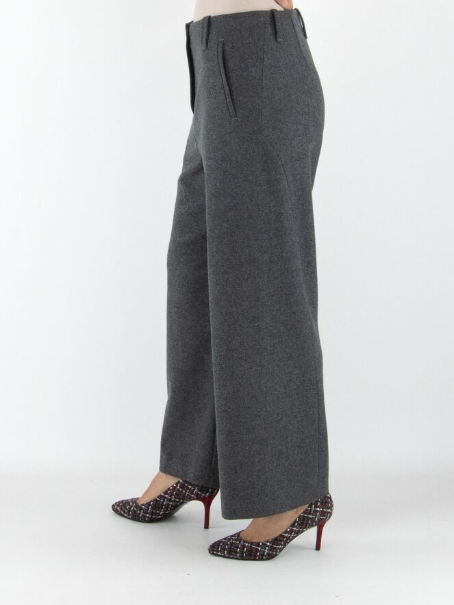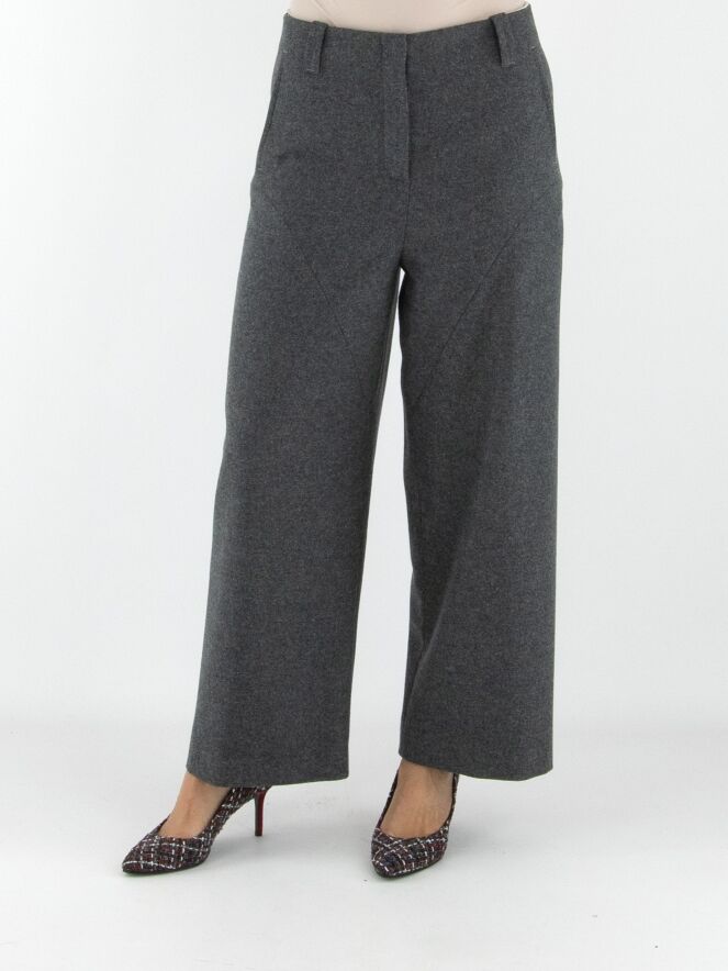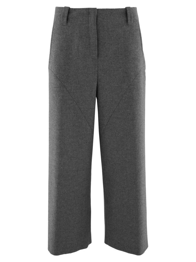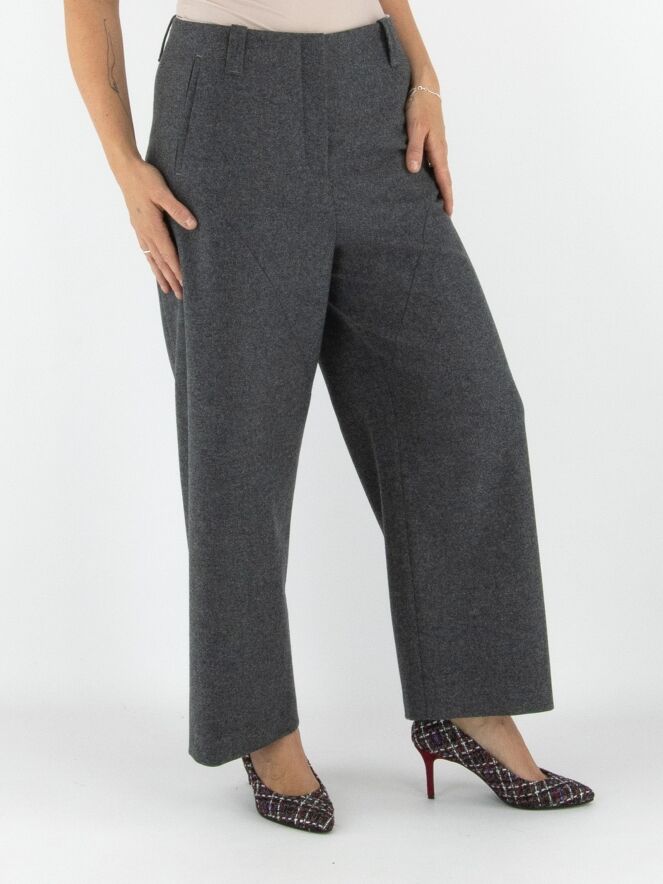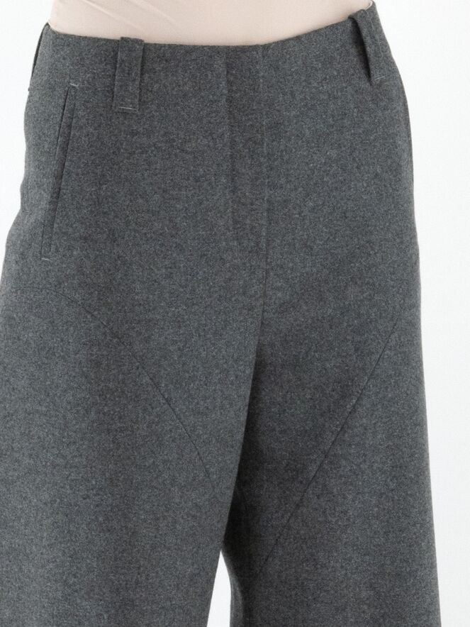 Annette Görtz trousers in grey. Featuring side pockets with a seam running in a parabolic line from the pocket base to the knees. The legs are cut straight. These trousers should be hand washed.