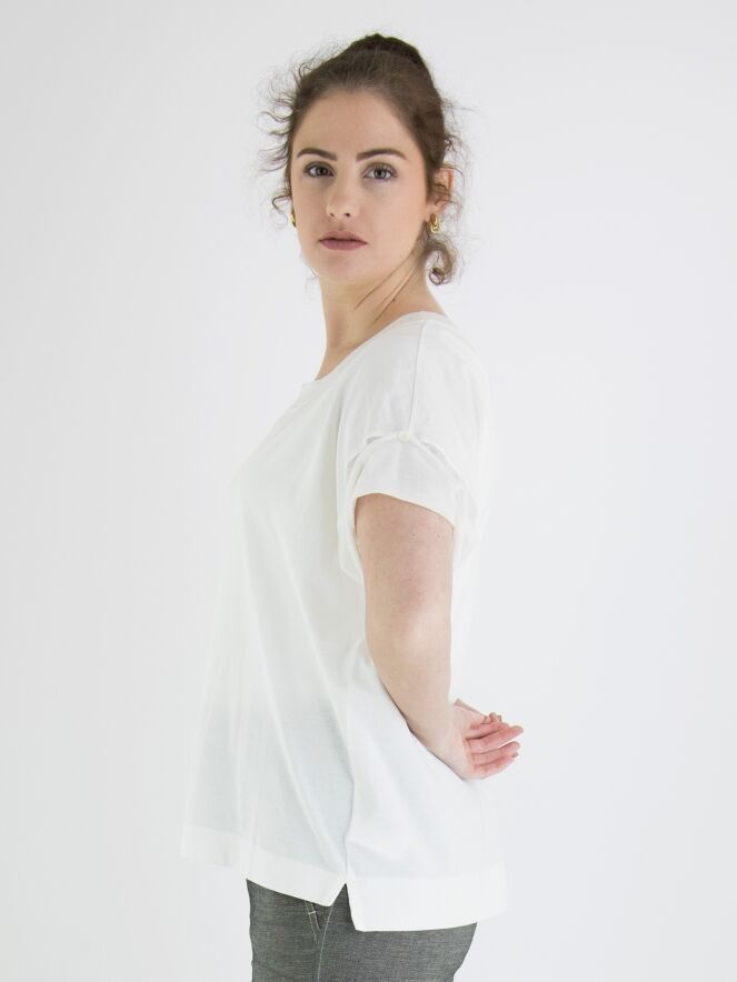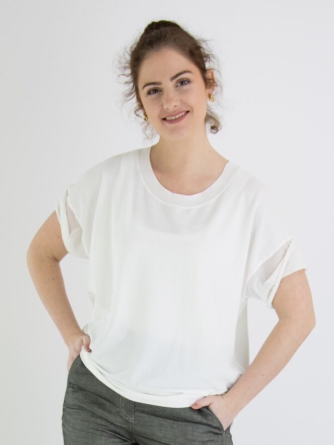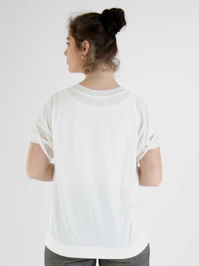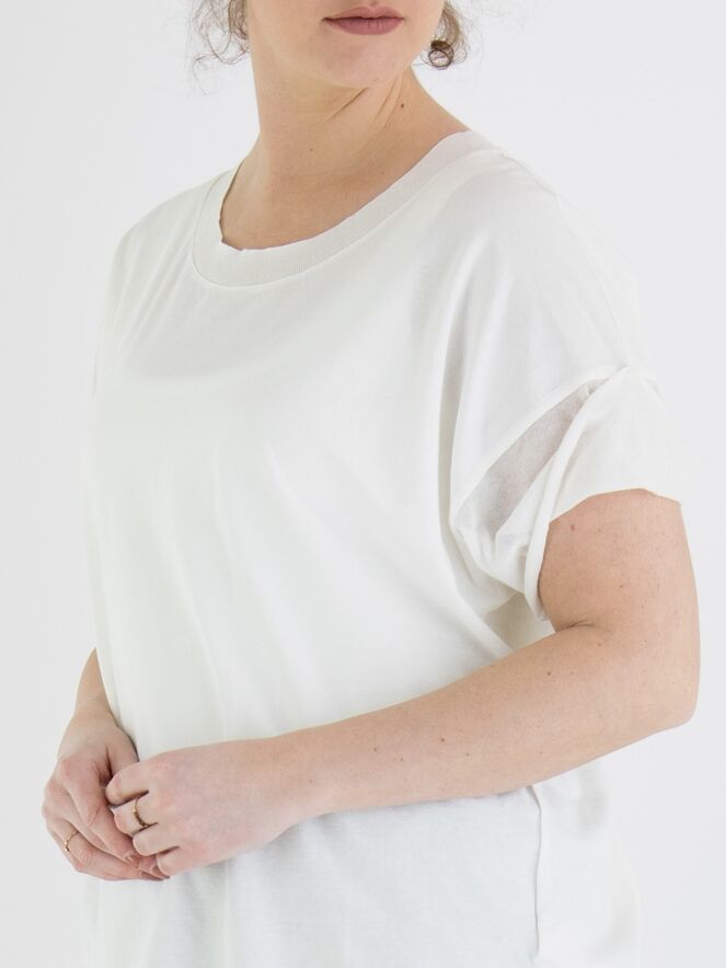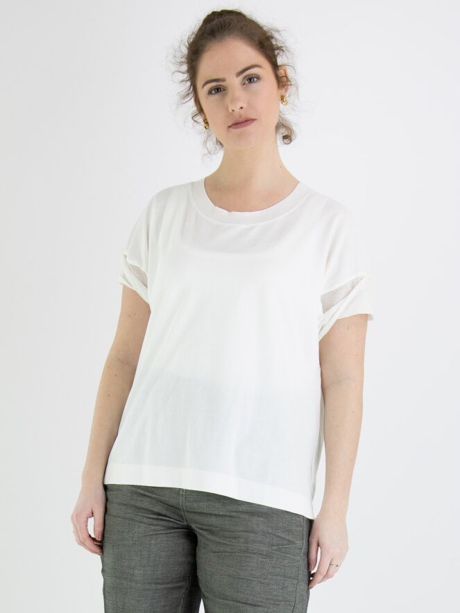 A shirt by Annette Görtz in cream white color. Along the edge of the round neck, there is a finely ribbed knit trim. The short sleeves are made of a voile transparent fabric. This shirt can be washed at 30 degrees.