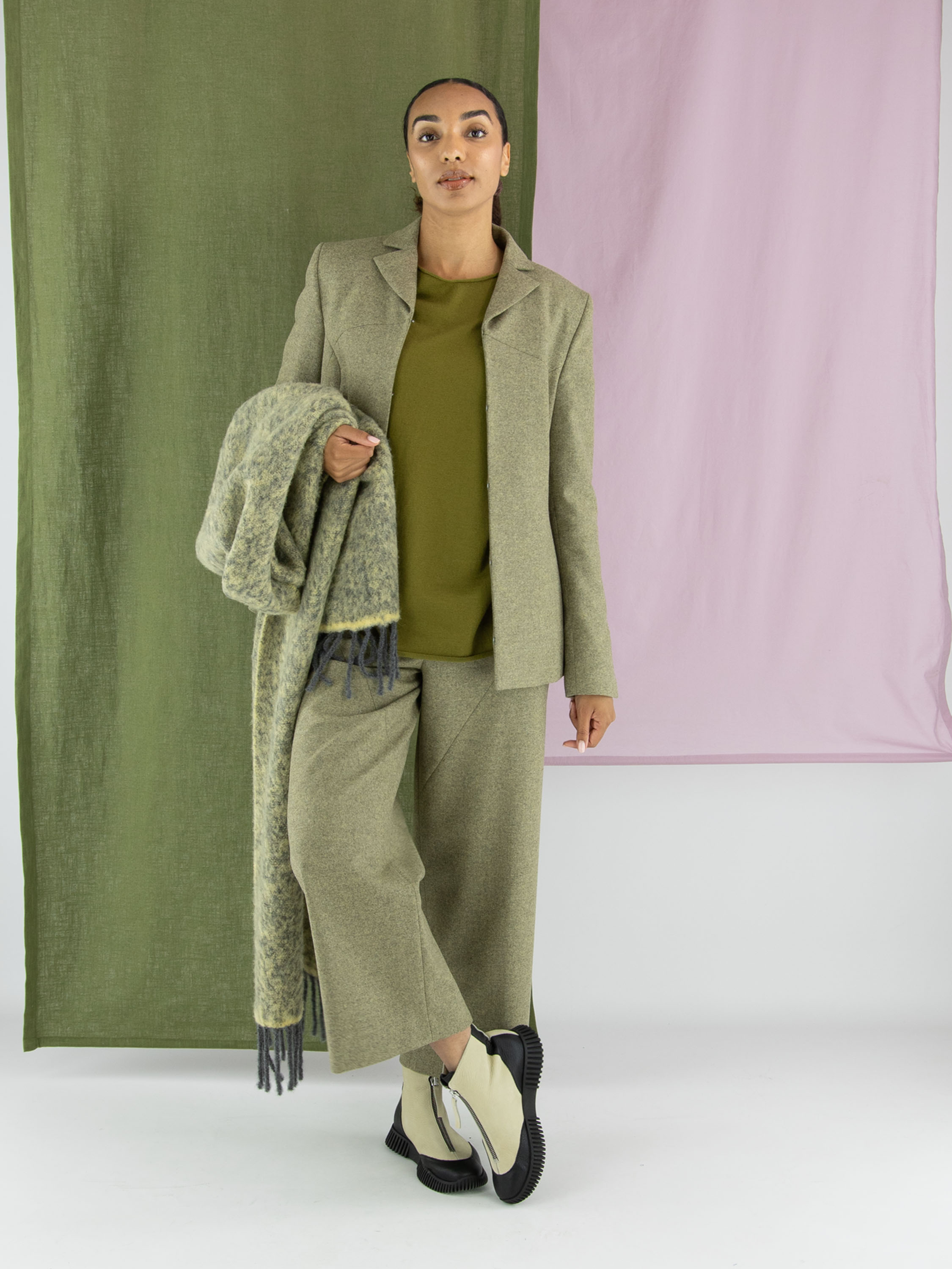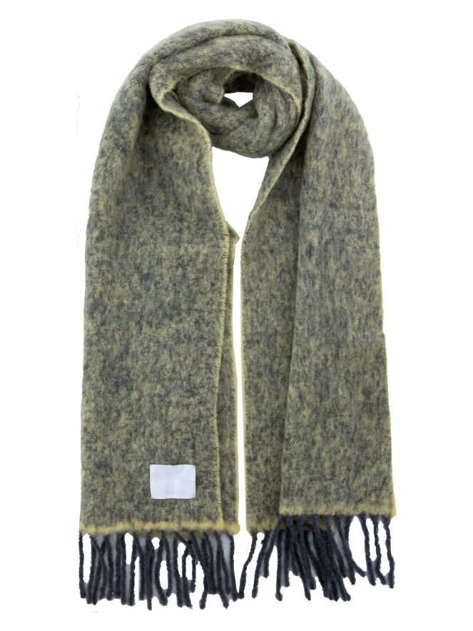 Luxurious Annette Görtz shawl in a mottled lime green mixed with grey. The ends of the shawl are finished with long grey fringes. This shawl should be hand washed.