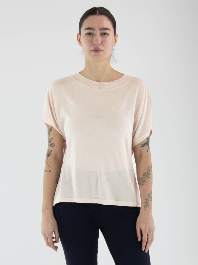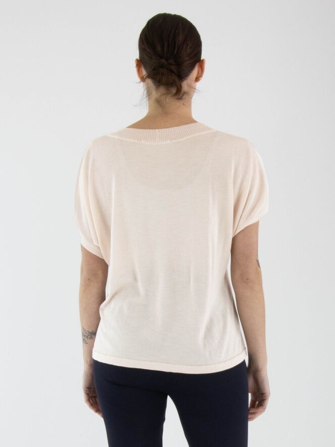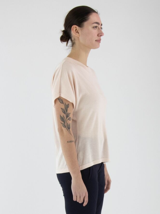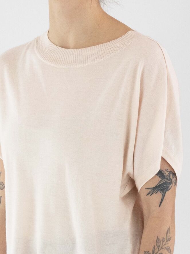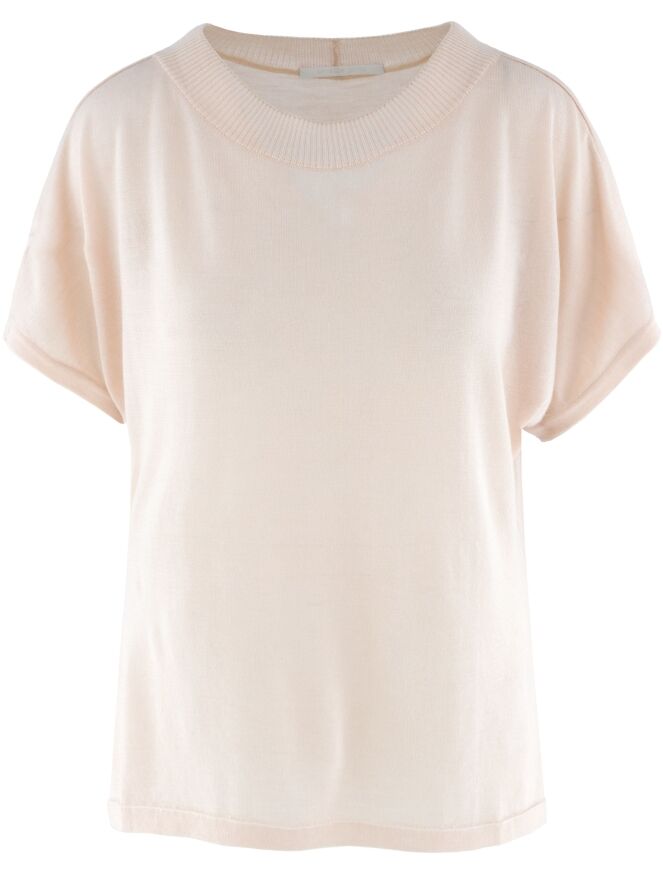 A semi-transparent, luxurious pullover by Annette Görtz in pastel pink. The round neckline is finished with a ribbed tricot trim. The pullover has short sleeves and should be hand-washed.