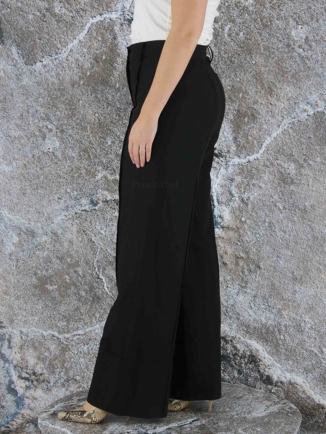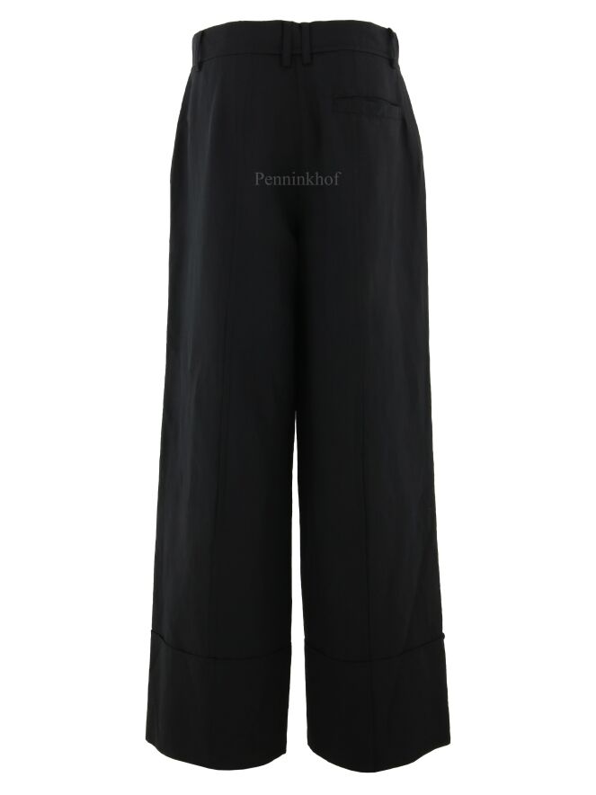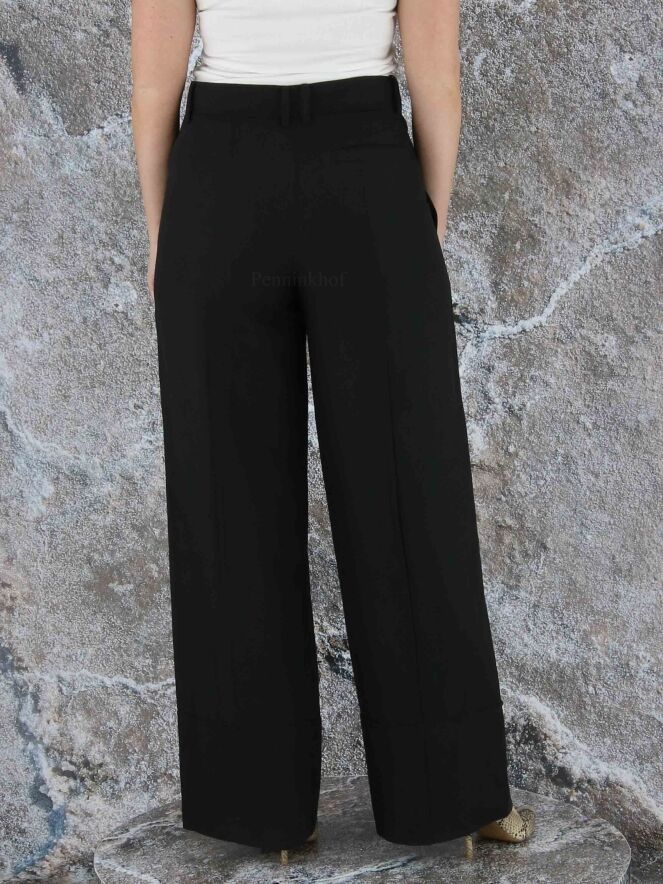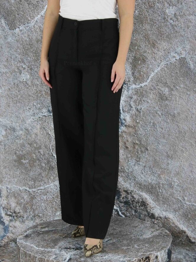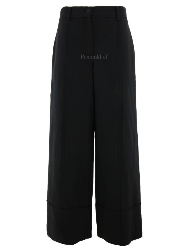 Wide pants by Annette Görtz in the color black. At the bottom of the legs is a horizontal stitching which creates a fake turn-up. Over the middle of the legs is a stitching seam on the front and back. These pants can be washed at 30 degrees.