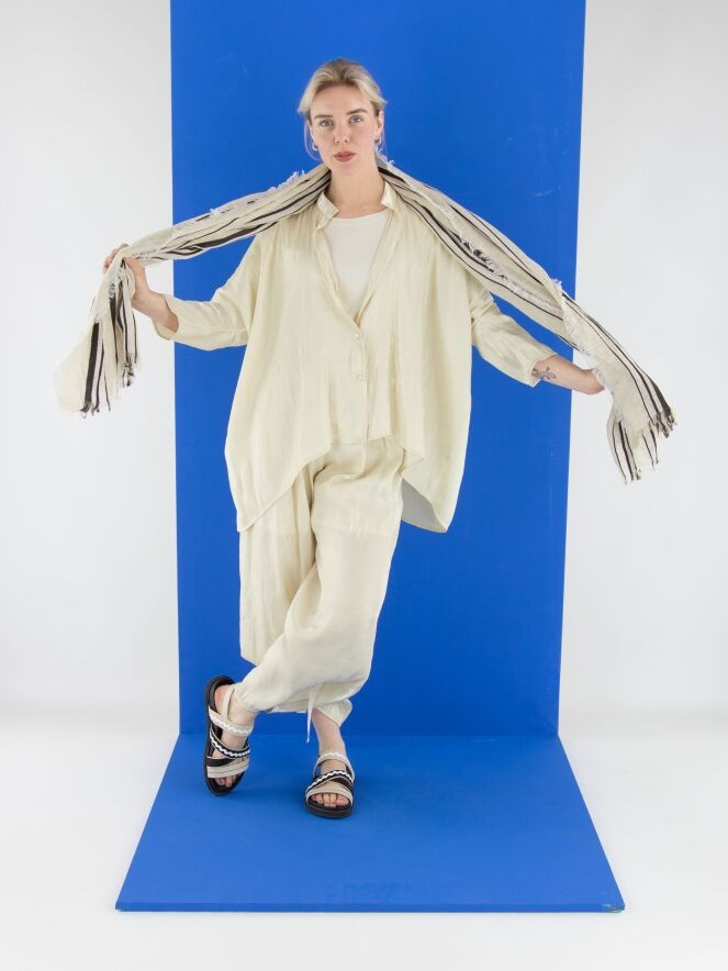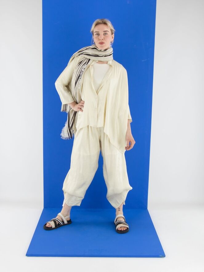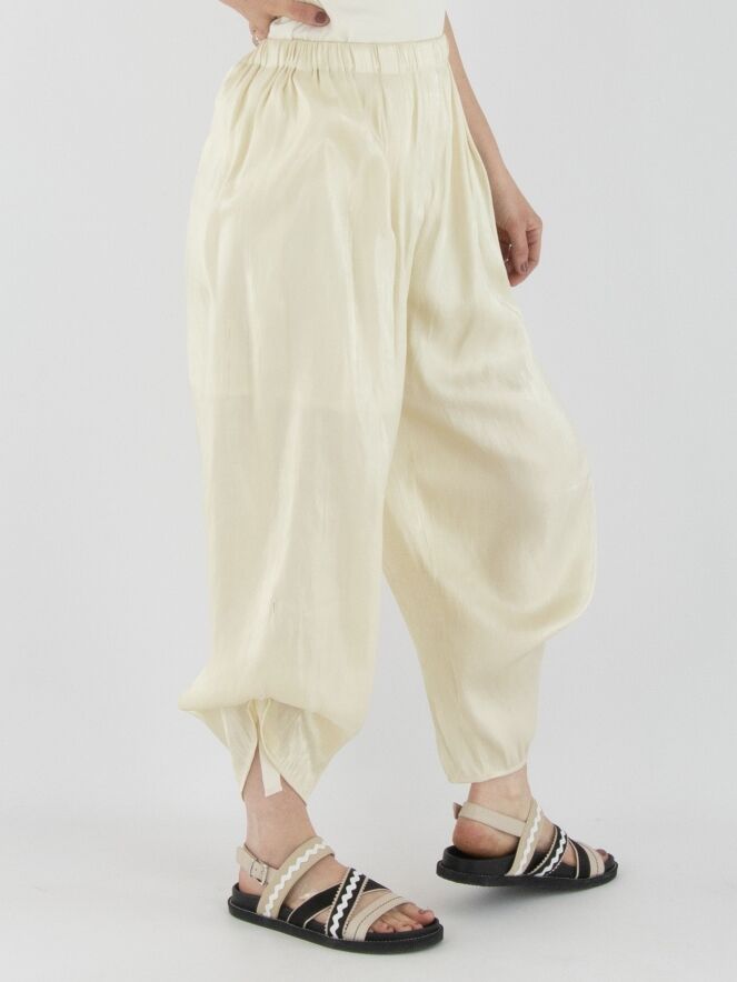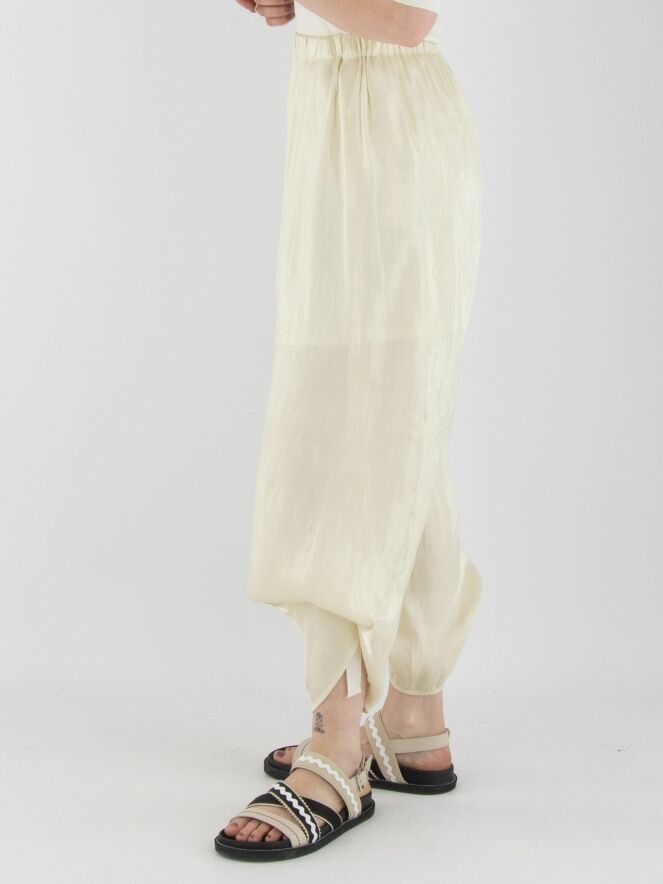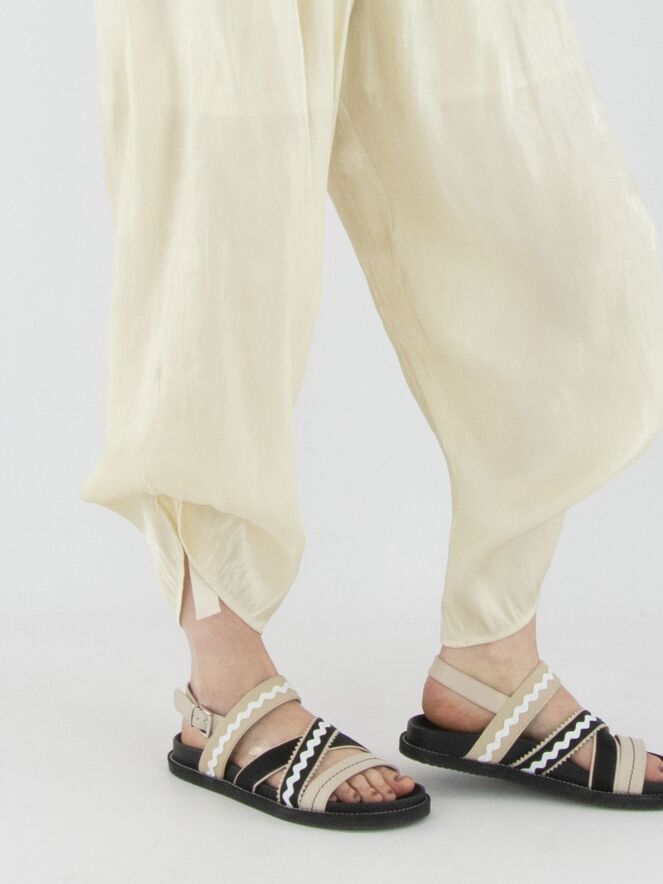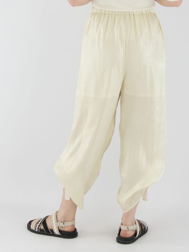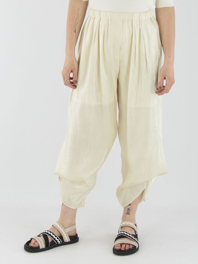 A pair of trousers from Annette Görtz in a matte satin fabric with a marled print in beige. The waistband features a finely pleated elastic band. Inside the trousers, a ribbon with buttons allows for the creation of pleated effects and different lengths. These trousers can be washed at 30 degrees.