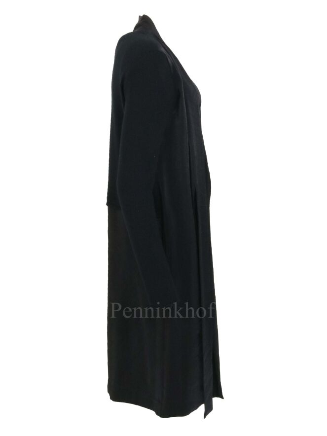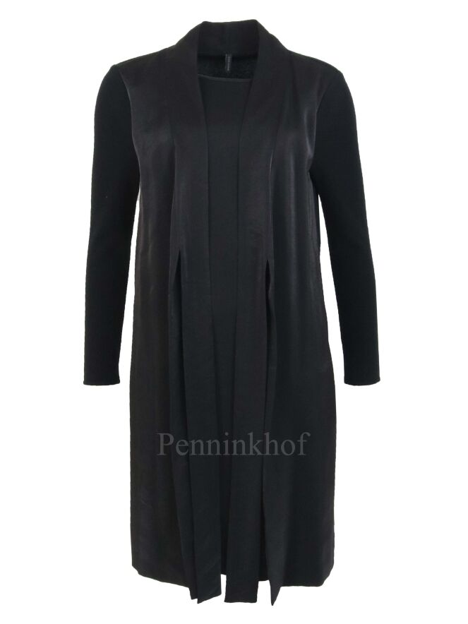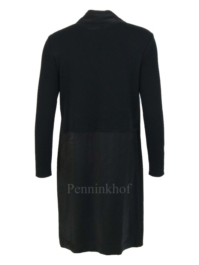 A dress by Annette Görtz with a matte satin fabric on the front in the color black. The back to the waist and the sleeves are in a black jersey fabric. At the front, the dress has a vest style in a matte satin fabric with a ribbon belt closure. This dress can be hand washed.