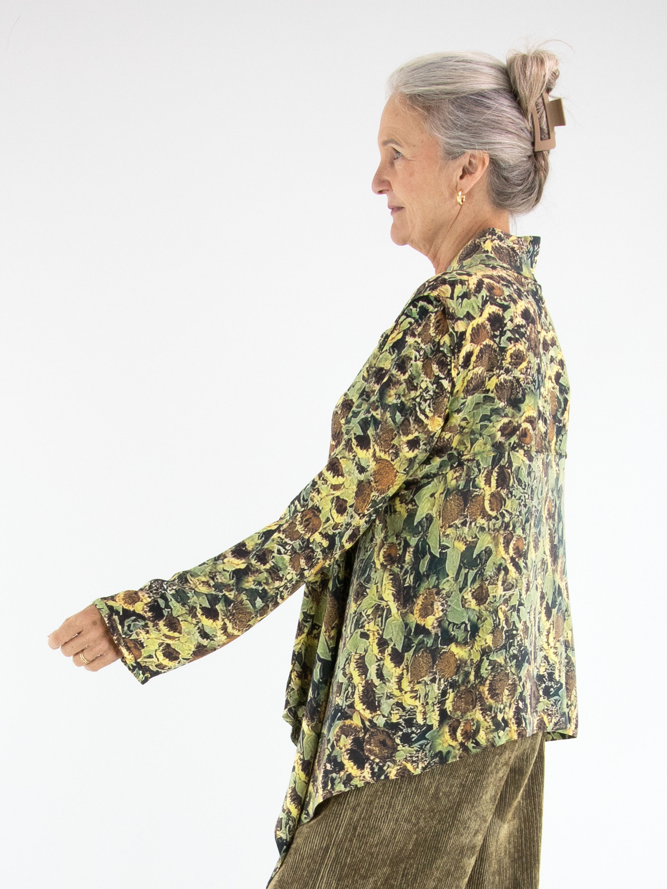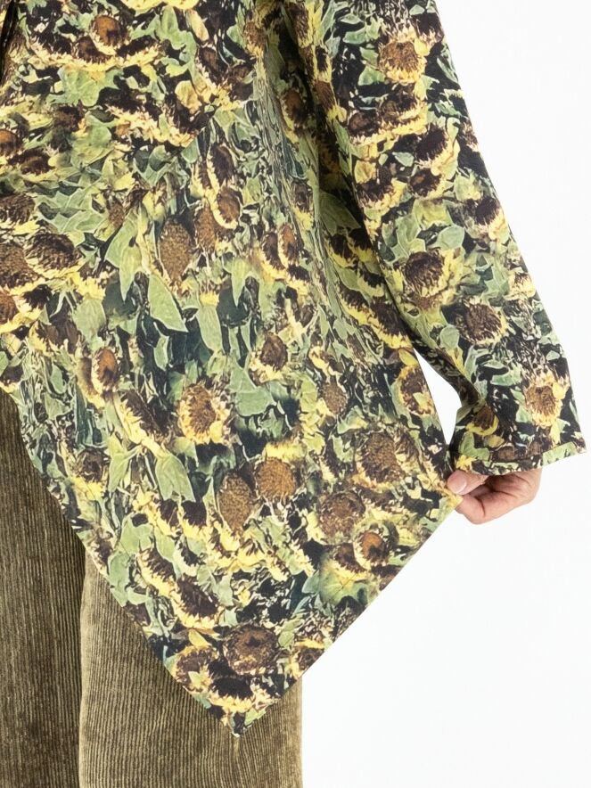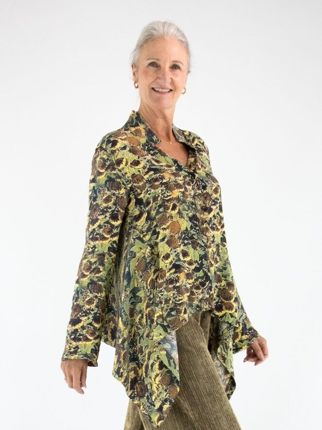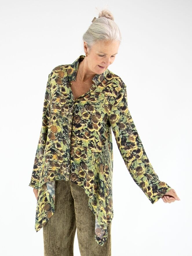 Blouse by Annette Görtz featuring an artistic print of faded sunflowers in shades of yellow, olive green, brown, and black. Designed with a concealed button placket, this elegant piece has extra fabric at the sides, creating a refined draped effect with subtle pointed details. This exclusive designer blouse can be hand-washed.