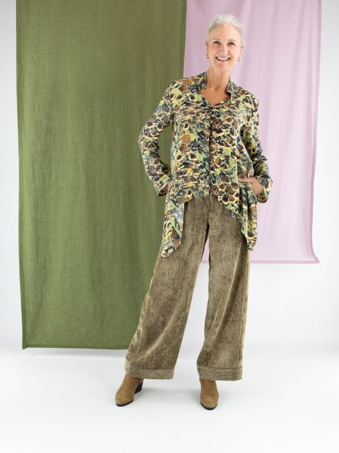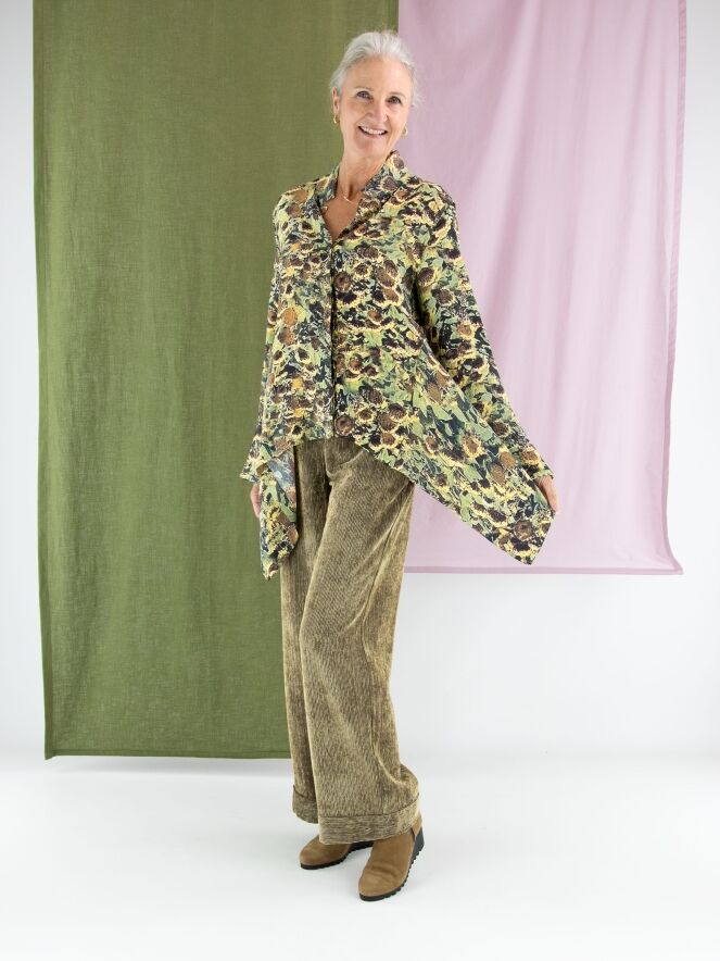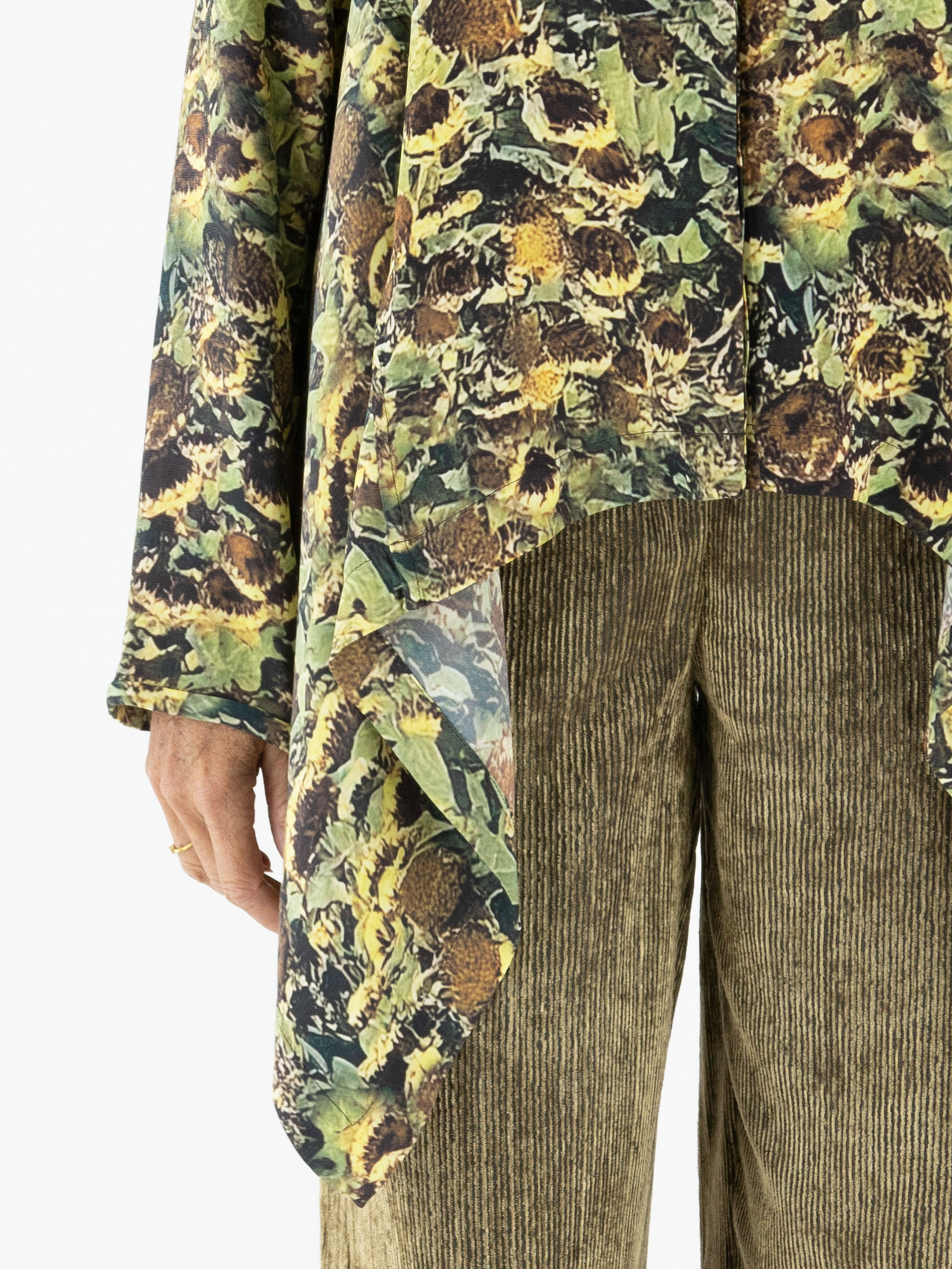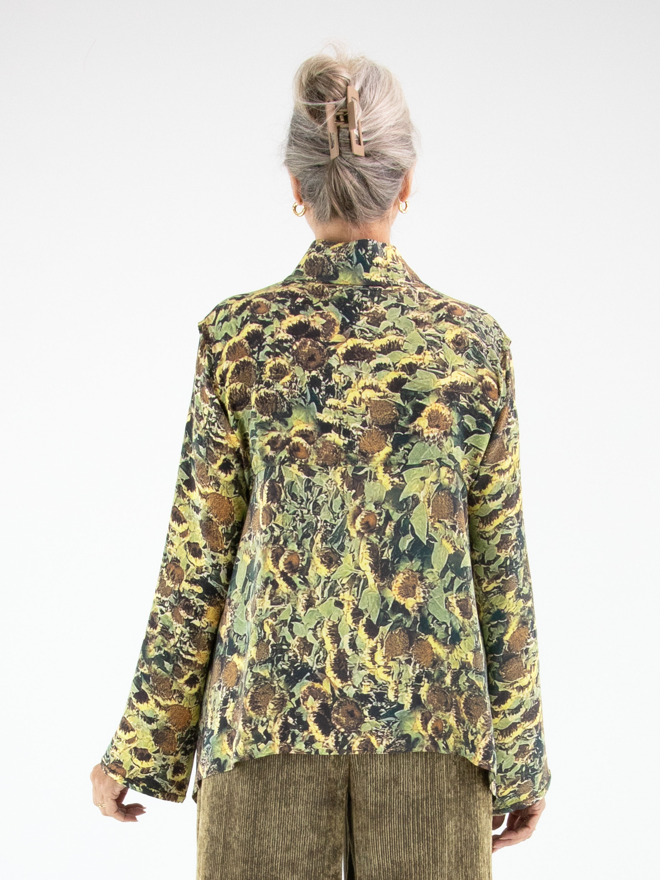 Blouse by Annette Görtz featuring an artistic print of faded sunflowers in shades of yellow, olive green, brown, and black. Designed with a concealed button placket, this elegant piece has extra fabric at the sides, creating a refined draped effect with subtle pointed details. This exclusive designer blouse can be hand-washed.