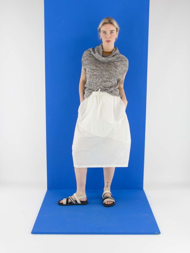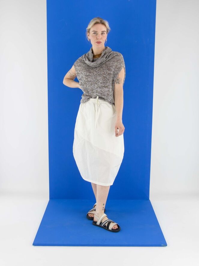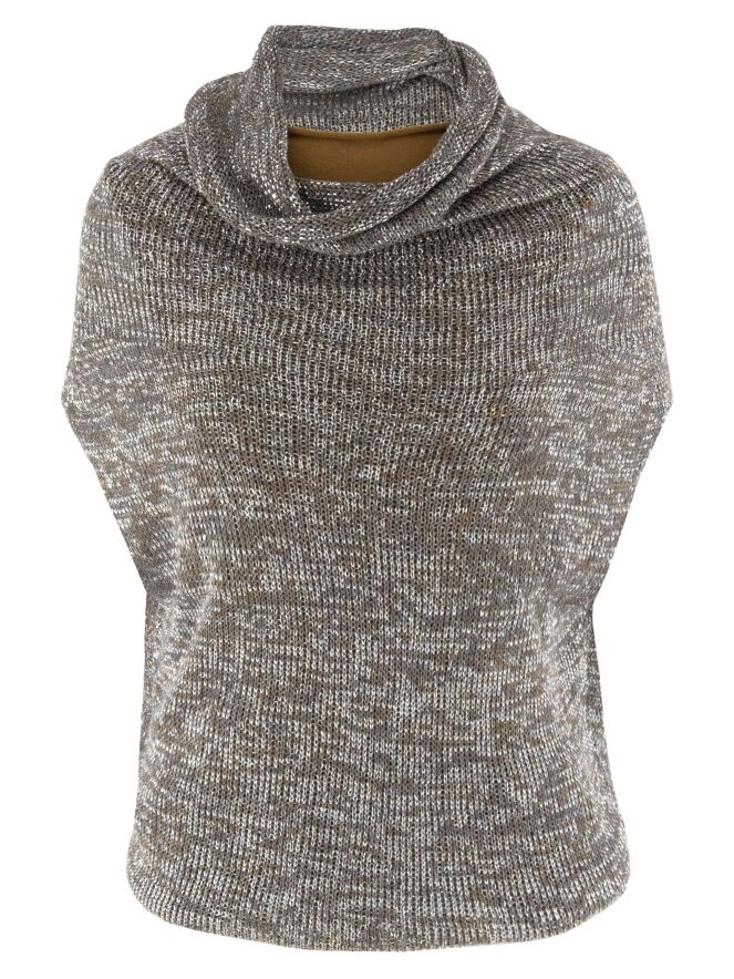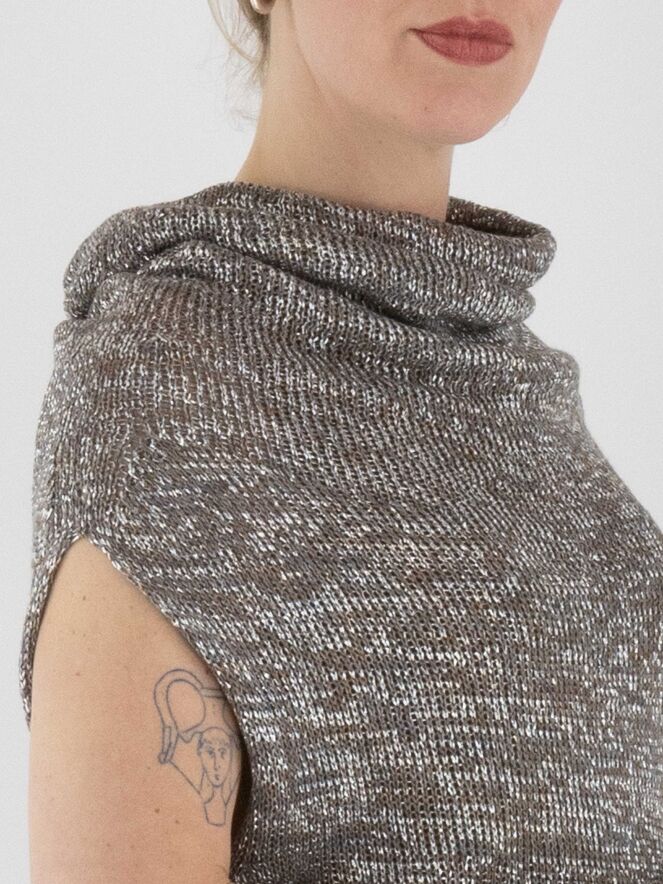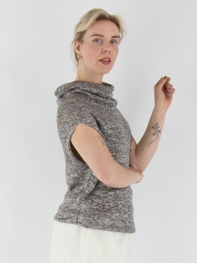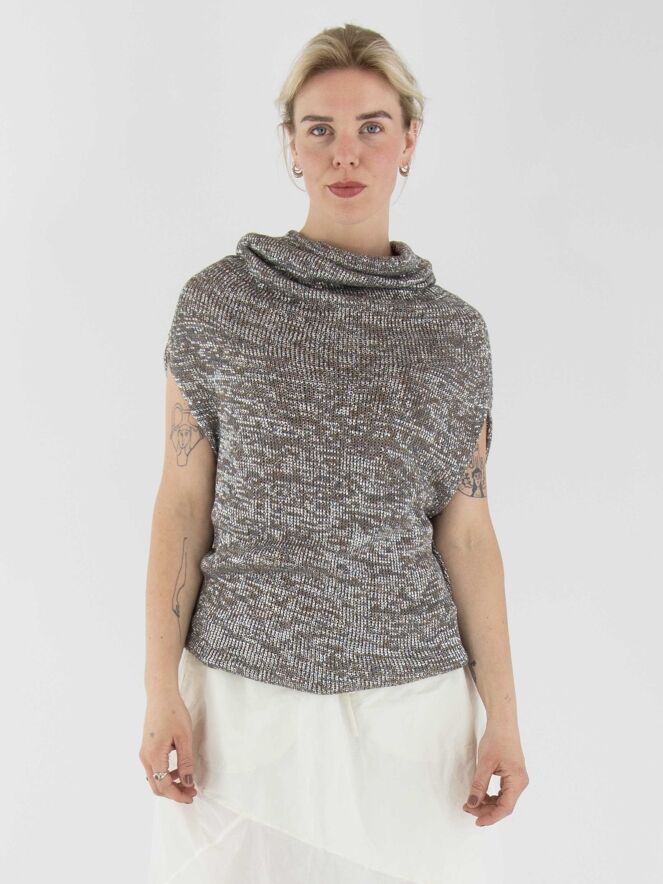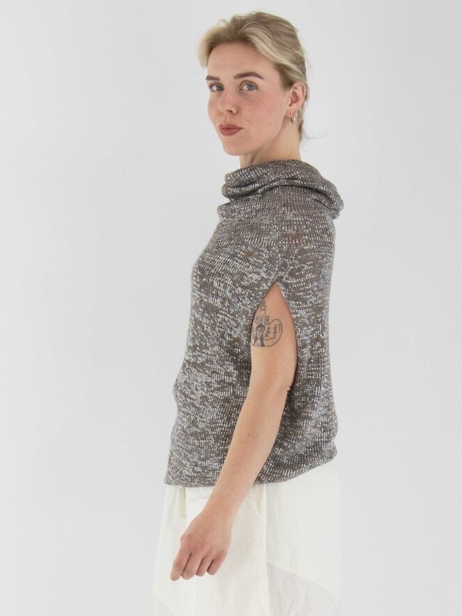 A marled vest, knitted in a textured bobble pattern with shades of taupe, grey, and silver. The top includes an underlayer in a cognac color. It features a draped neckline and should be hand-washed.