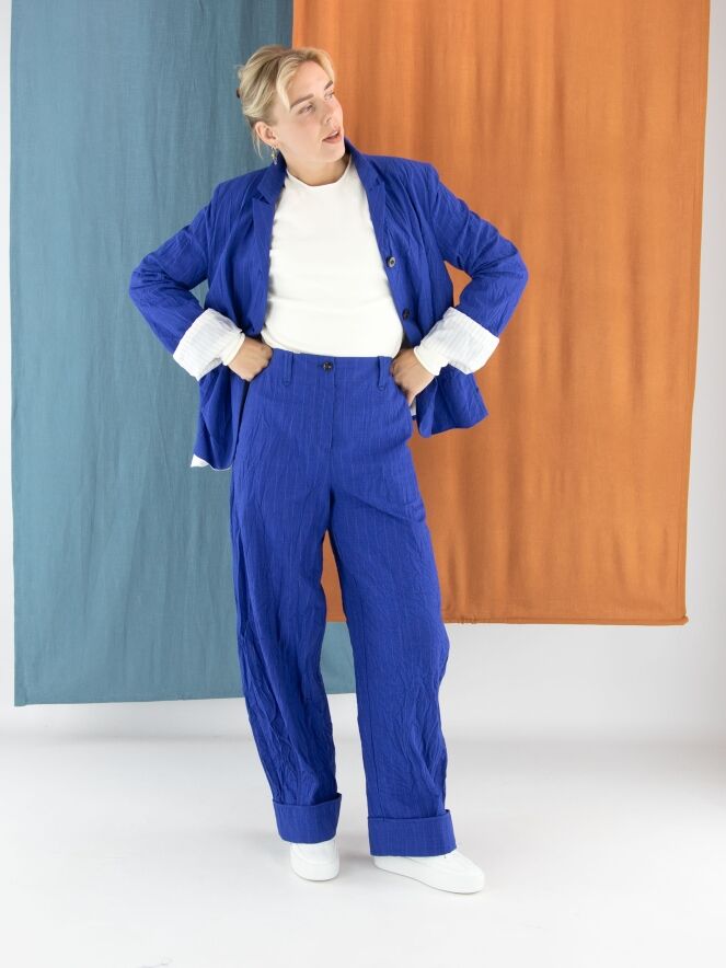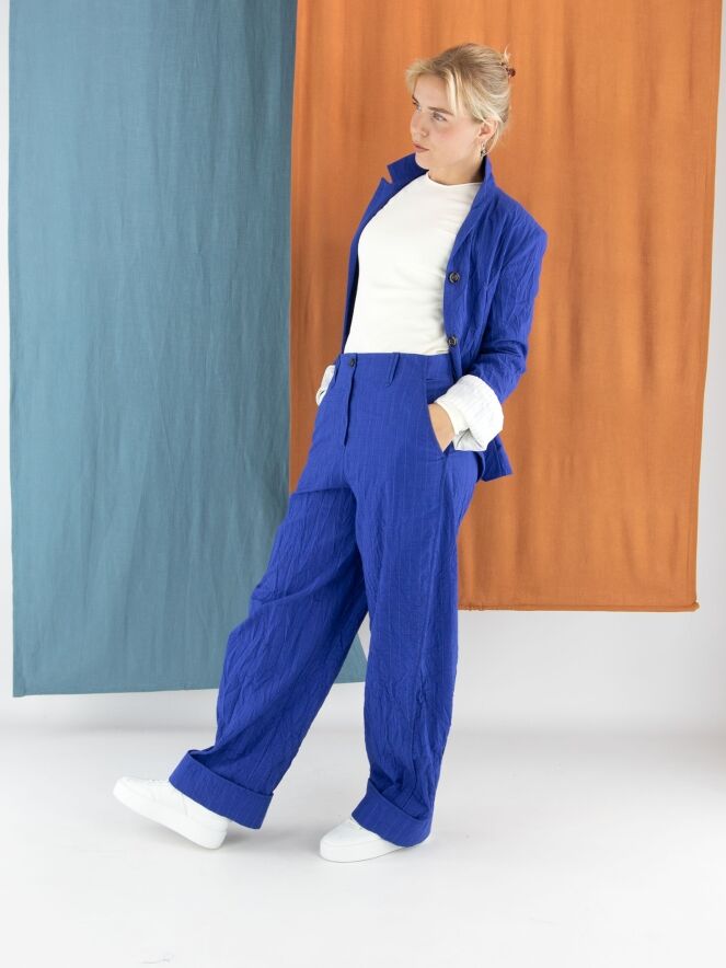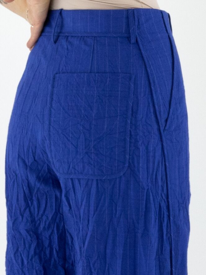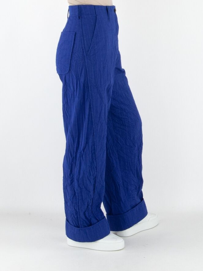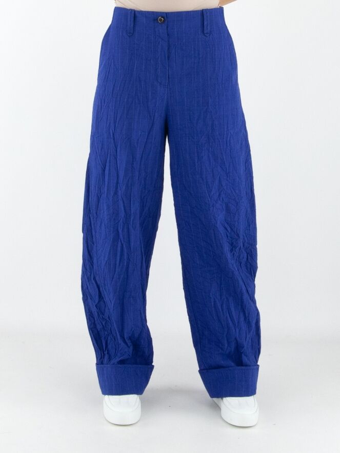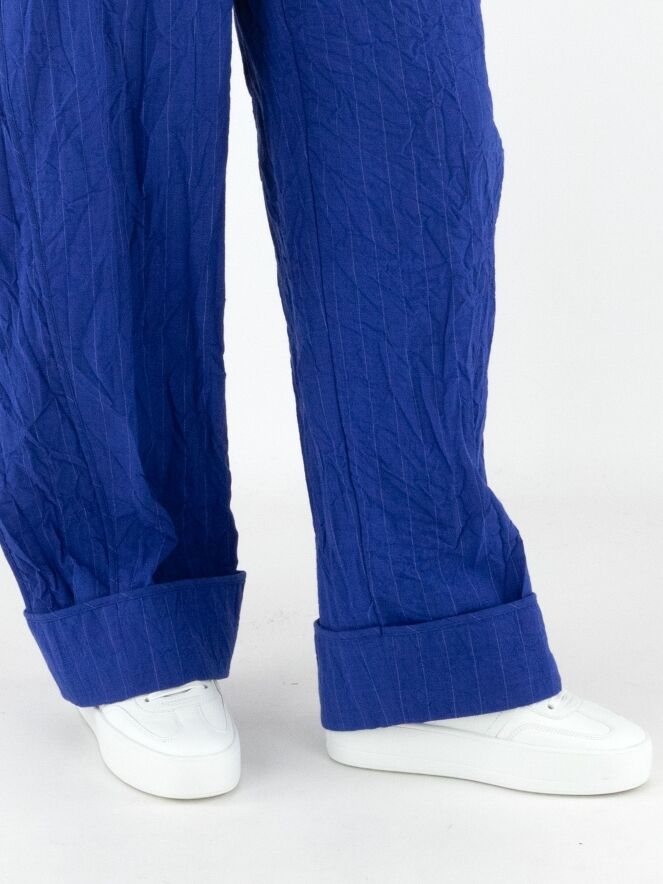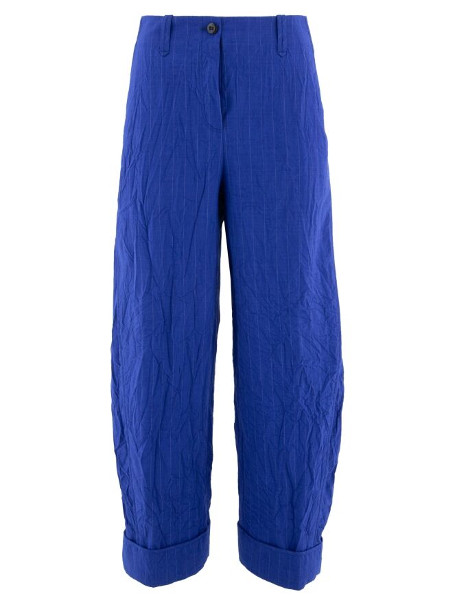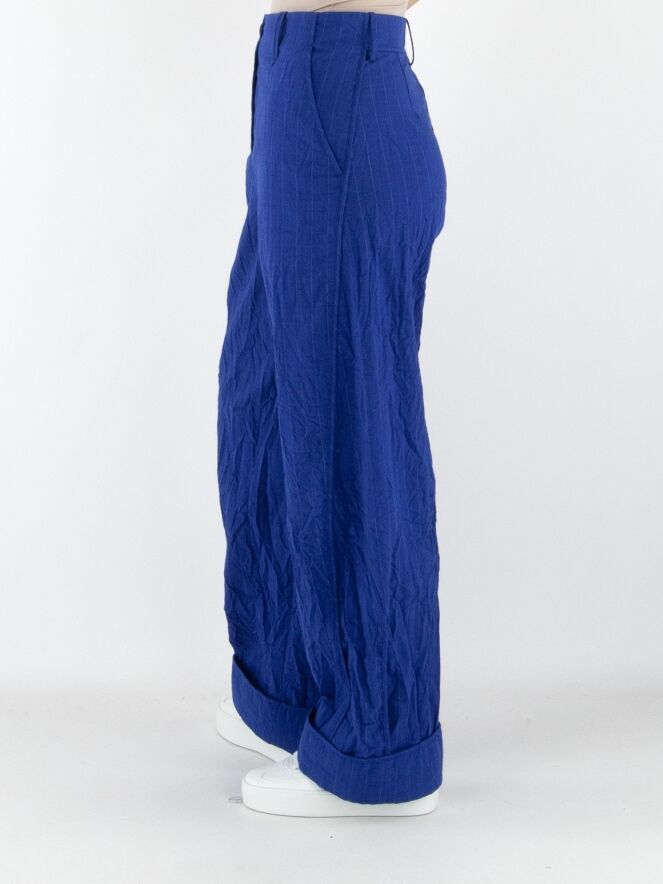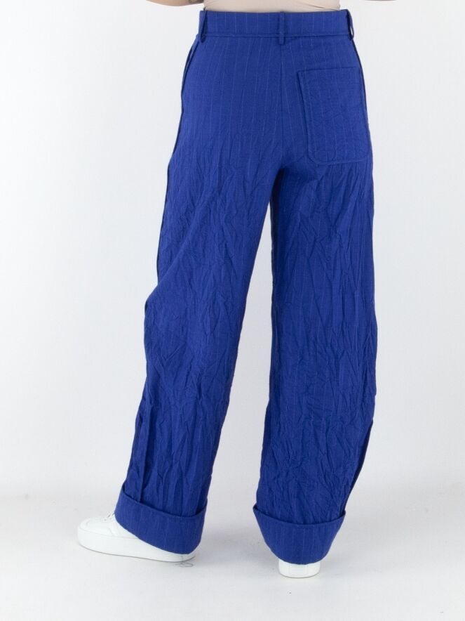 Trousers by Annette Görtz in a pinstripe pattern in royal blue and off-white. The fabric has a crinkled texture. The design features side slit pockets and a wide turn-up at the hem. This piece is hand wash only.