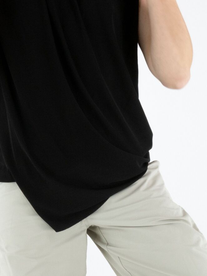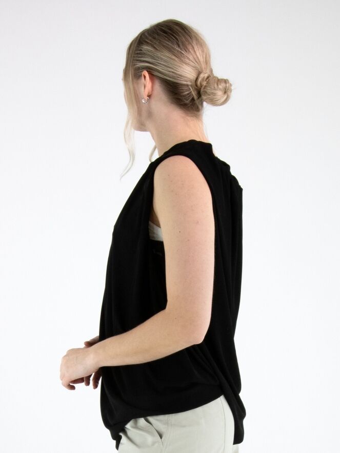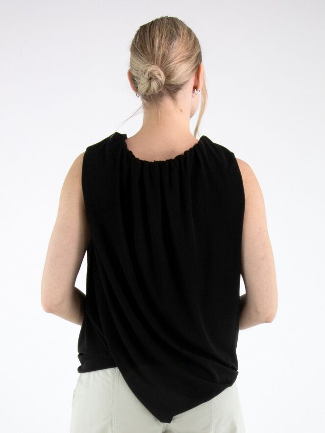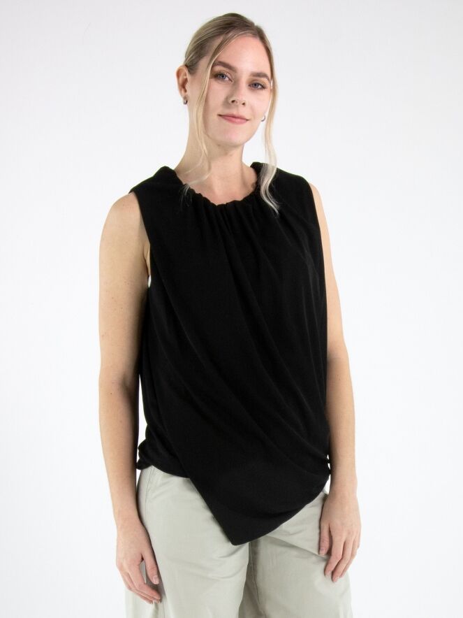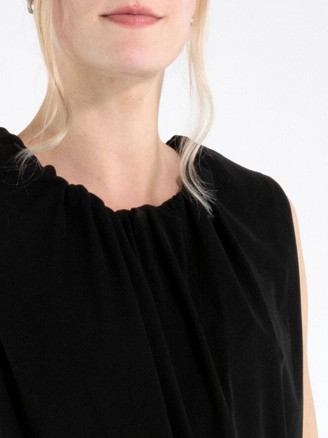 A top by Annette Görtz in black, crafted from a finely ribbed fabric. The top features a double-layer construction with a twisted design that creates a slimming effect. The edge of the round neckline is delicately pleated. This top can be washed at 30 degrees.