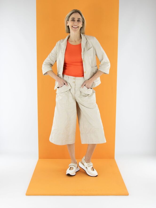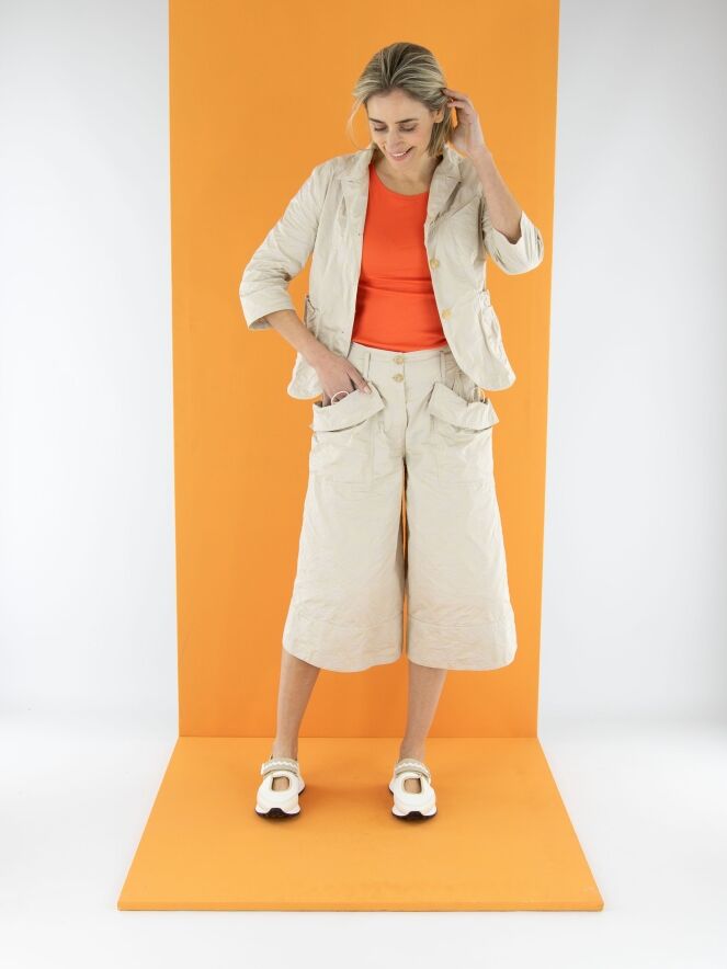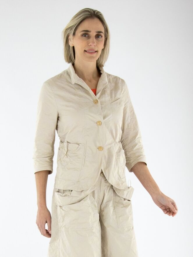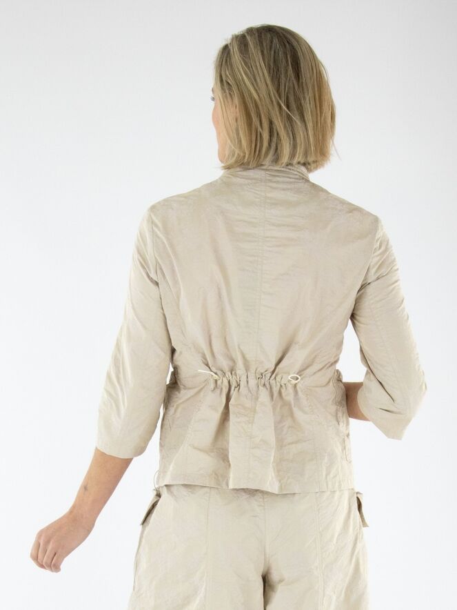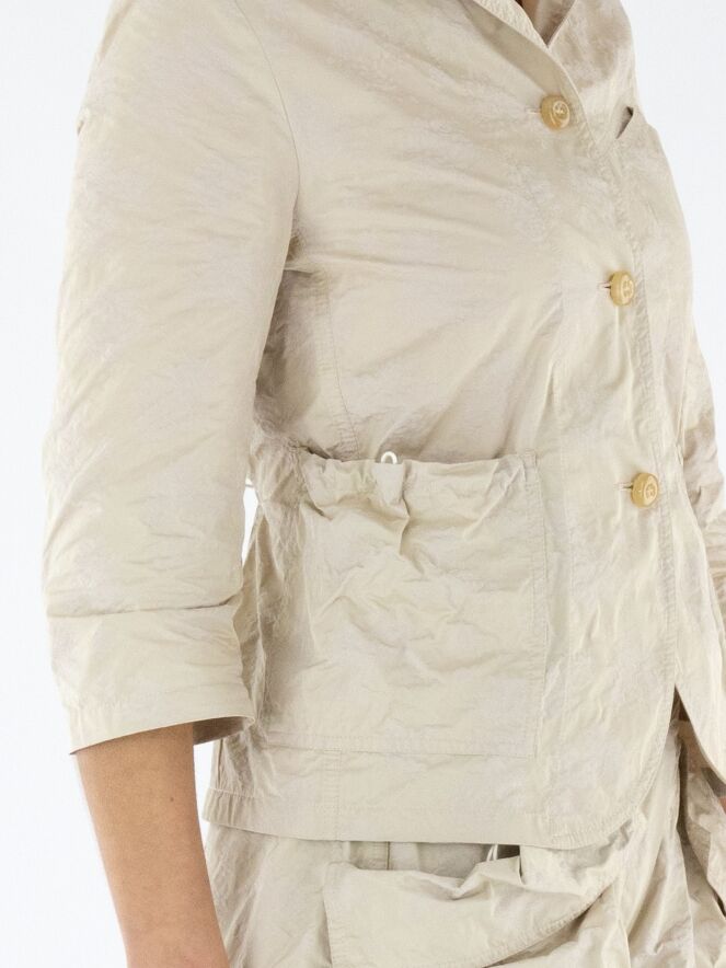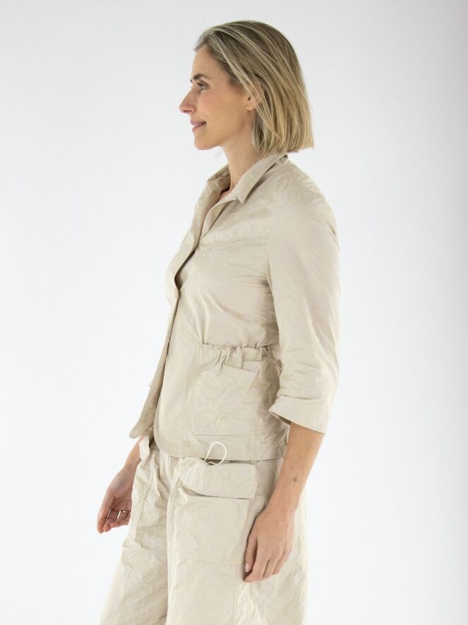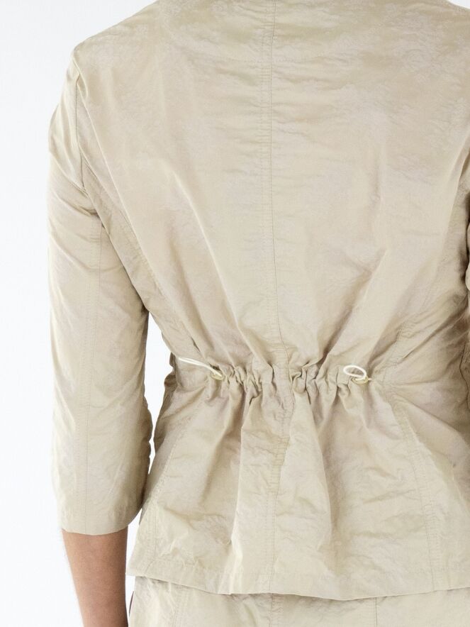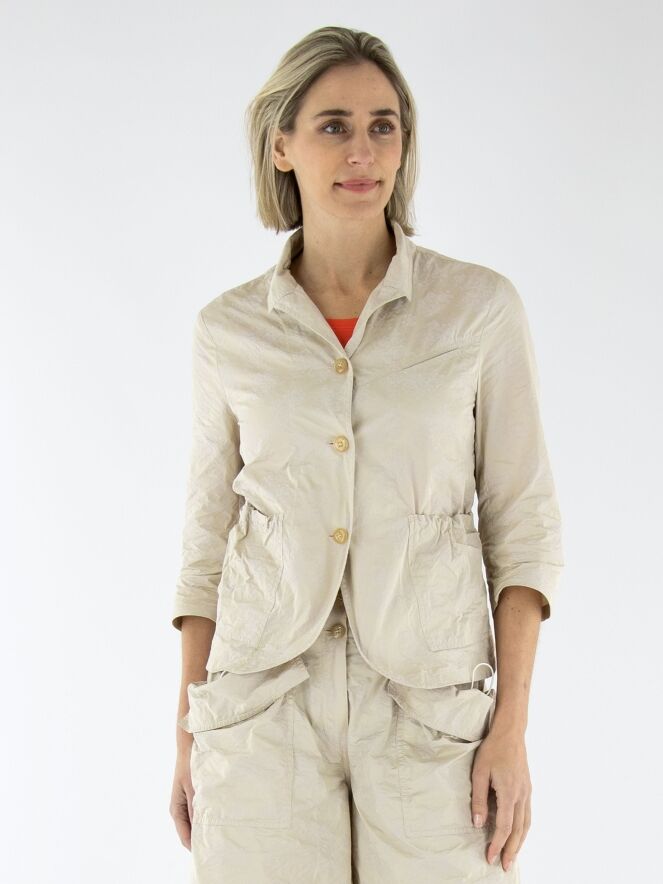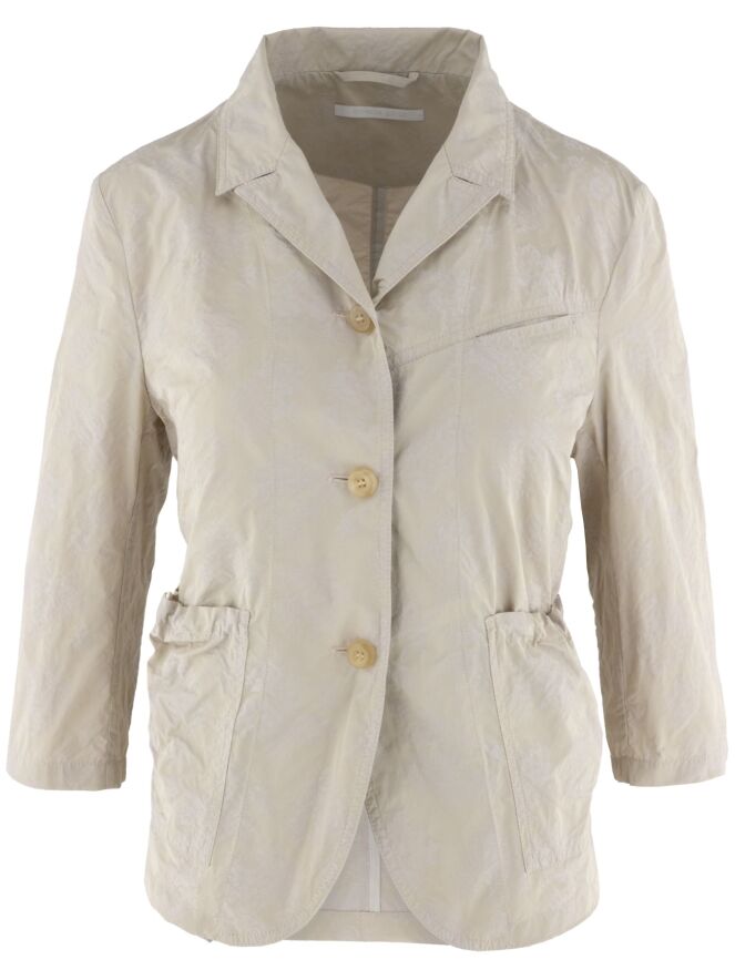 A blazer by Annette Görtz featuring a jacquard print in sand and beige. The blazer has half-length sleeves and a three-button closure. At the back, a drawstring in a tunnel finish at the waist allows for a pleated effect. This decorative detail is mirrored in the trim of the front pockets. The blazer is unlined and can be washed at 30 degrees.