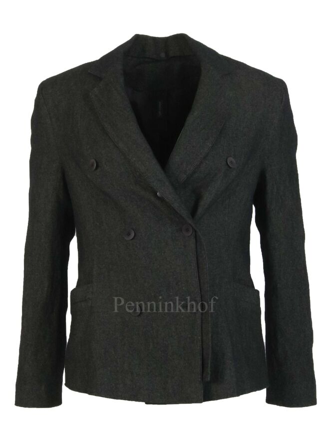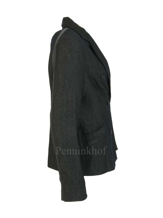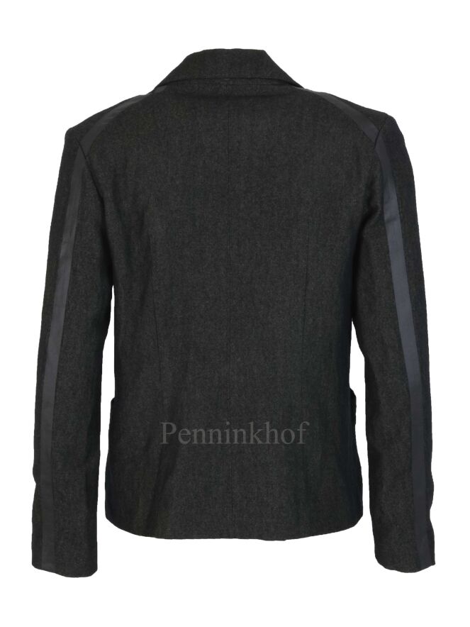 A double brazzed blazer from Annette Görtz in a mixed anthracite color. From the shoulders at the top of the sleeves is a matte shiny black trim. The blazer is lined and should not be washed.