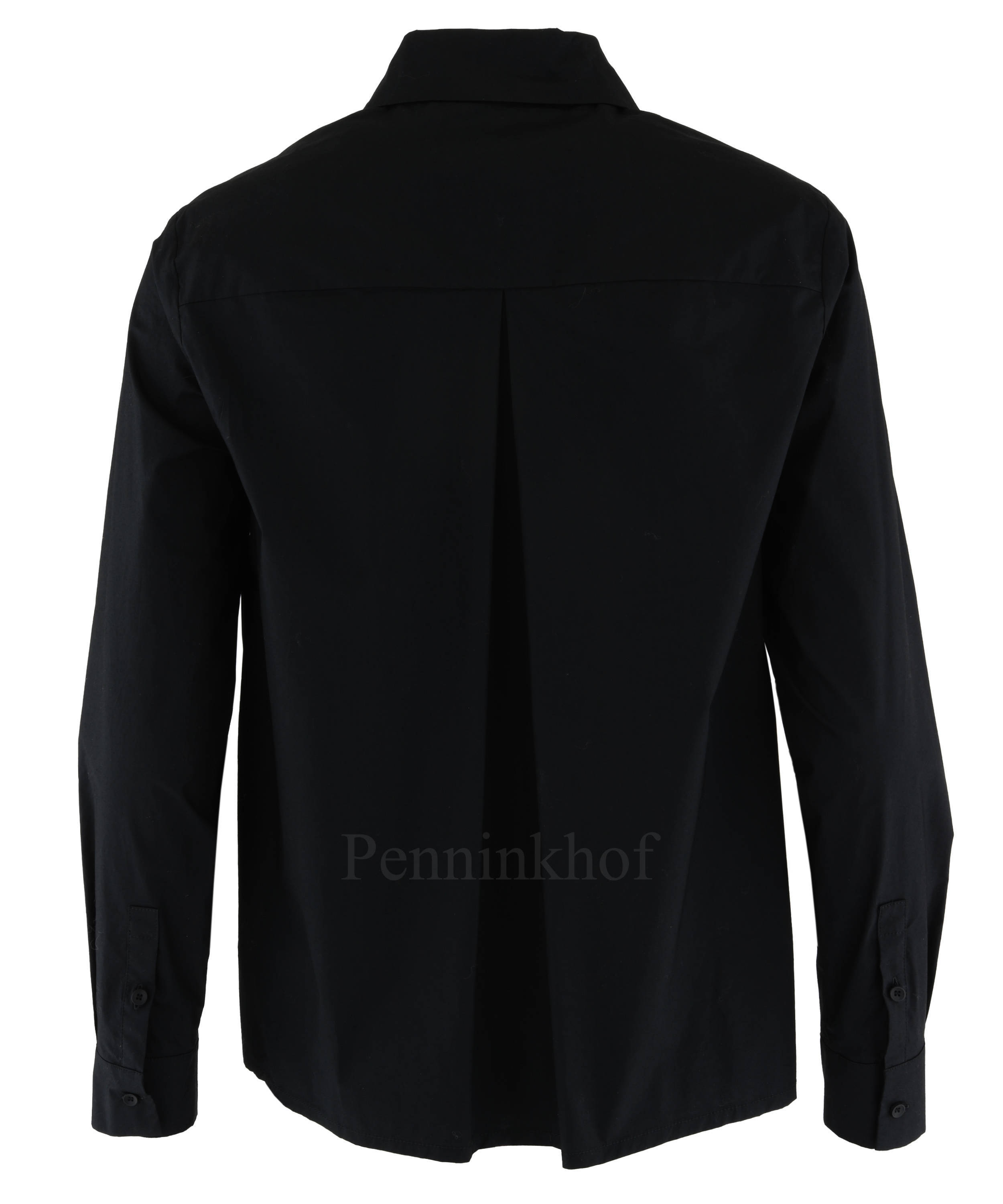 A blouse by Annette Görtz in the color black. The front has a checkered pattern with fine stitching. At the back, the fabric is uni with a pleat in the middle at the height of the shoulder blades. This blouse can be washed at 30 degrees.