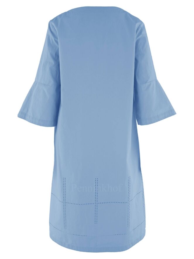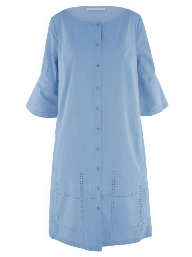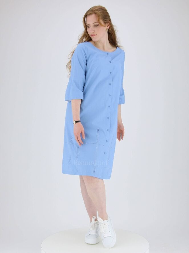 A button down dress by Annette Görtz in a soft blue color. The dress has a round neckline and half-length sleeves. Below the knee height, the dress is perforated in a block pattern. This dress can be washed at 30 degrees.