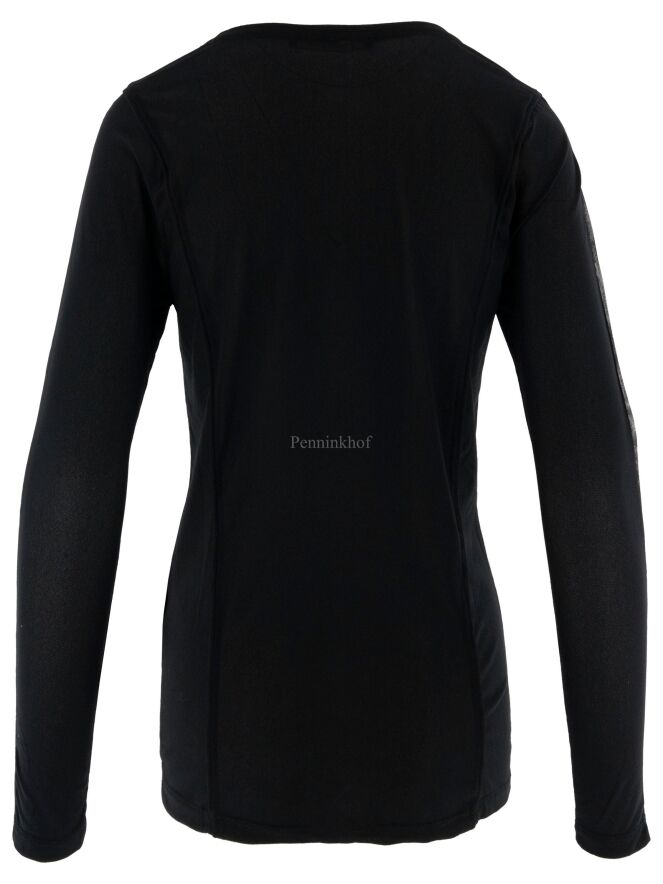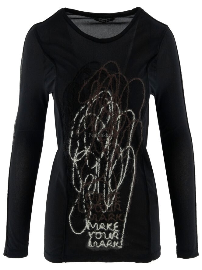 A shirt from Annette Görtz in black with a stitched-on design of stitching in cream white and mocha brown. The shirt has a round neck and may be washed at 30 degrees.