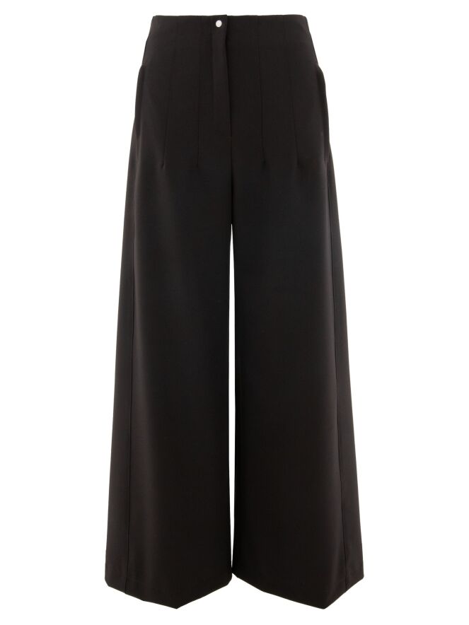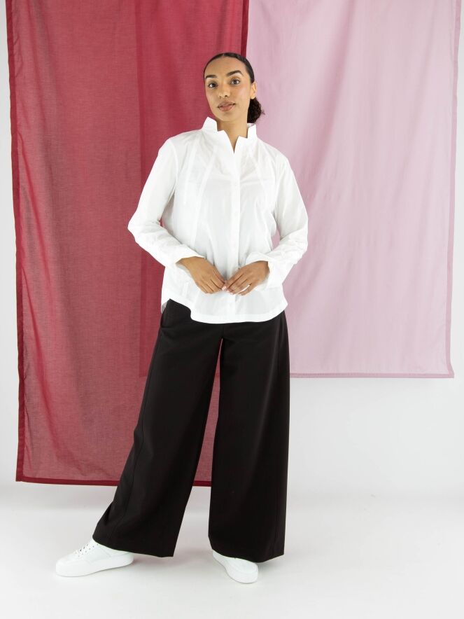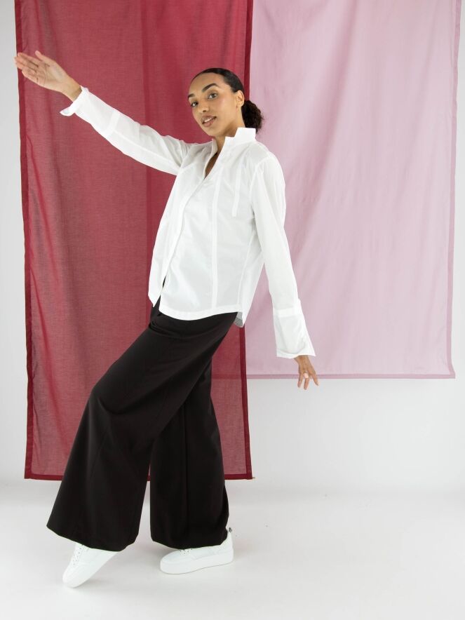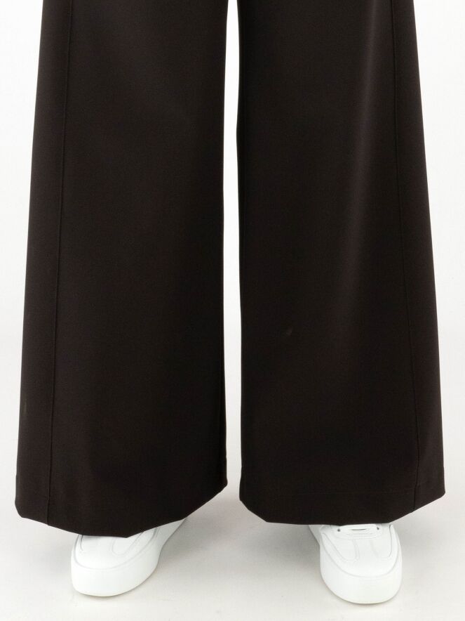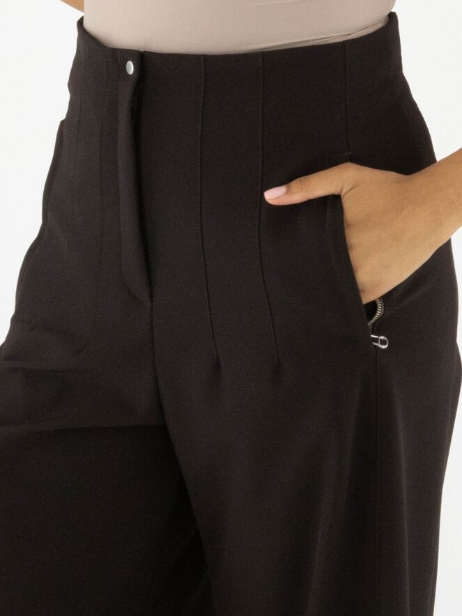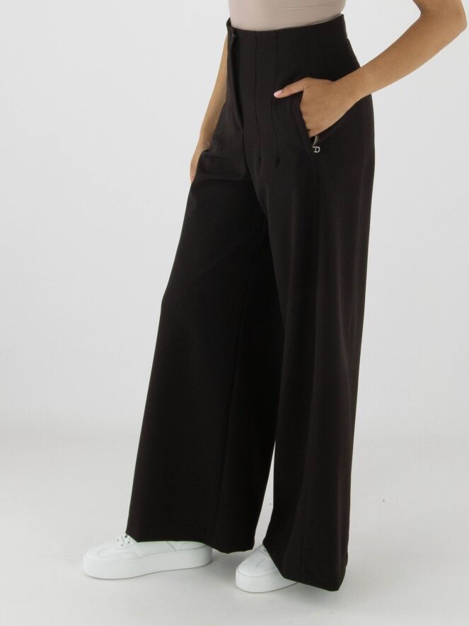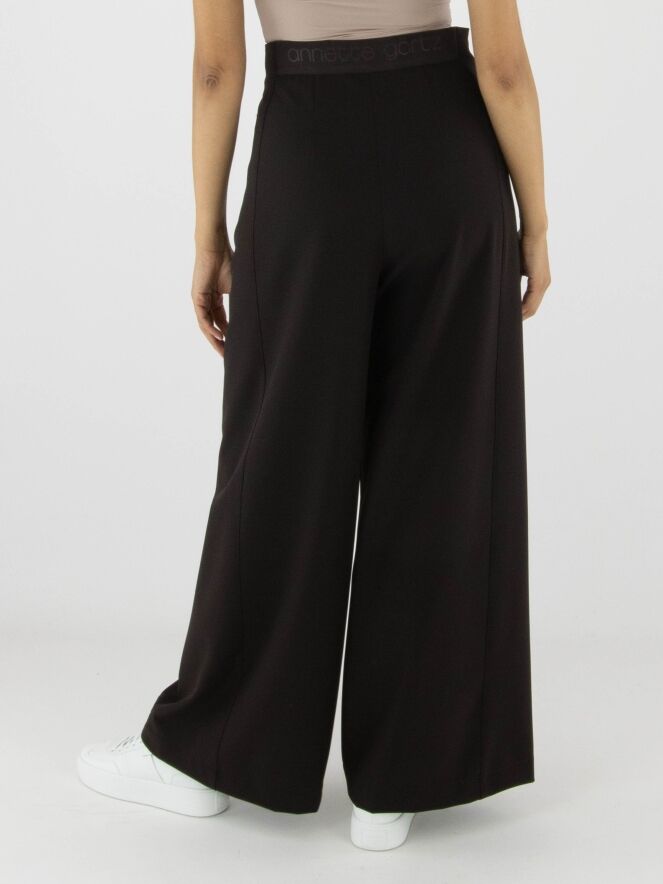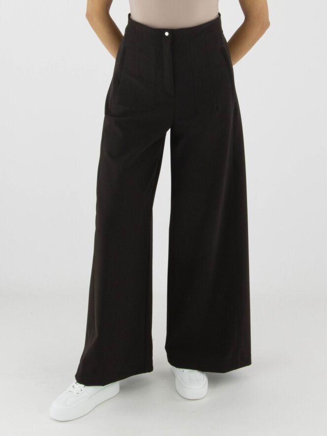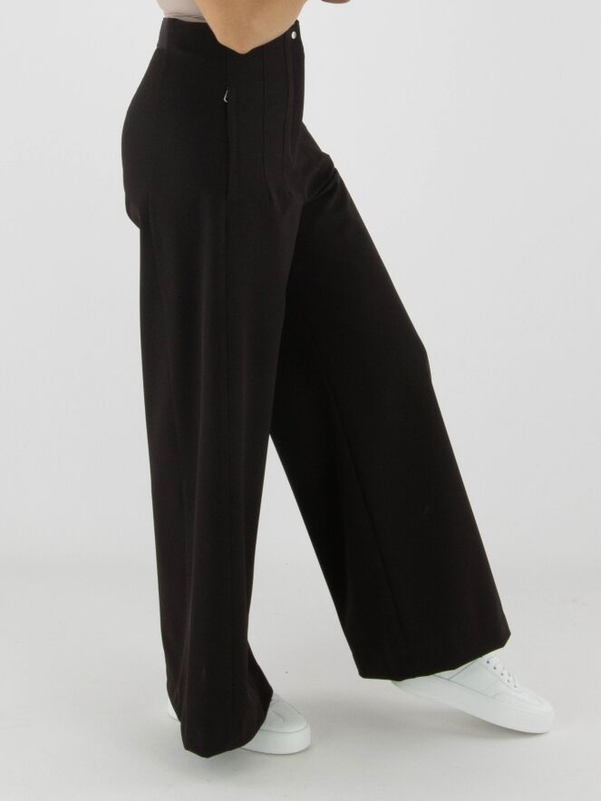 A wide-leg trouser by Annette Görtz in a mocha brown shade. From the waistband, several darts extend to below the hip. The side pockets feature zip closures. These trousers can be washed at 30 degrees.