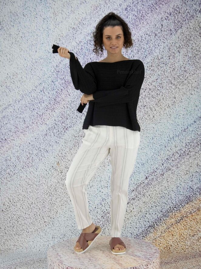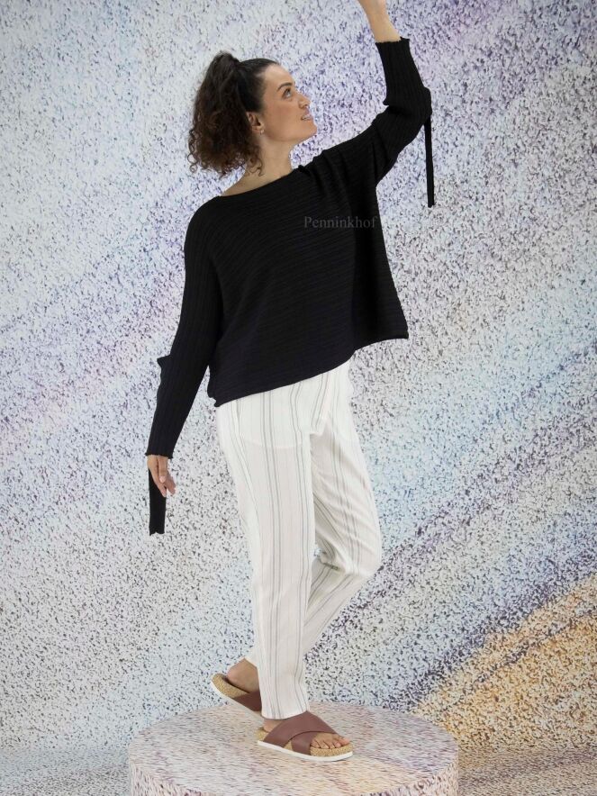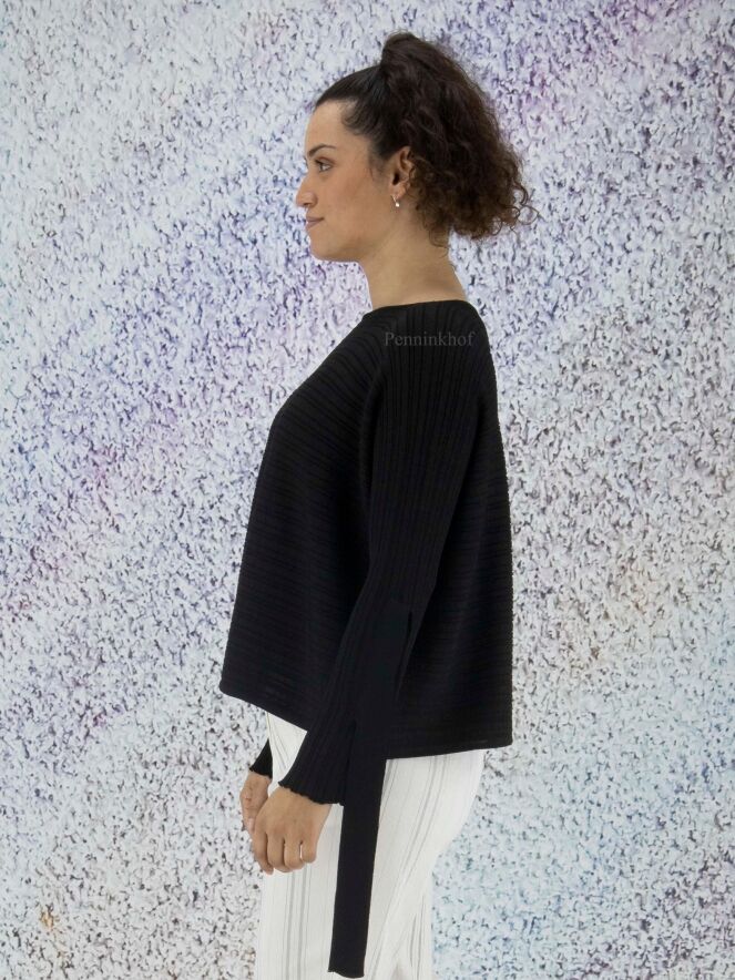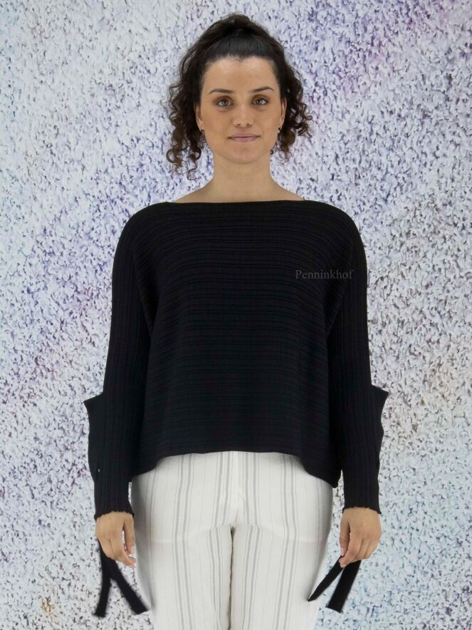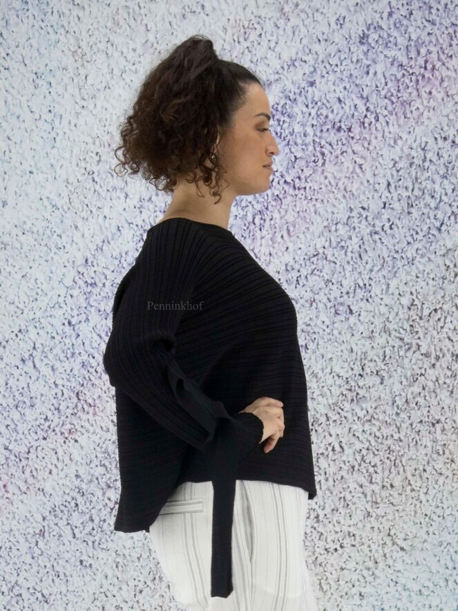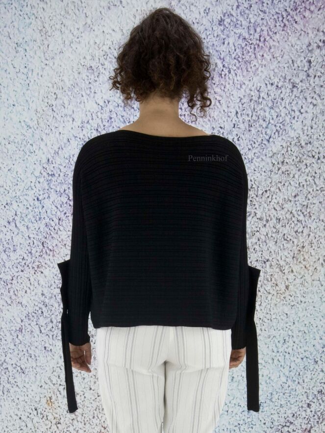 A luxurious short pullover from Annette Görtz in the color black. The pullover has a horizontal stripes structure. At the end of the long sleeves is an opening with 2 ribbons with which the sleeve can be fastened. The pullover has a wide round neck and can be washed by hand.