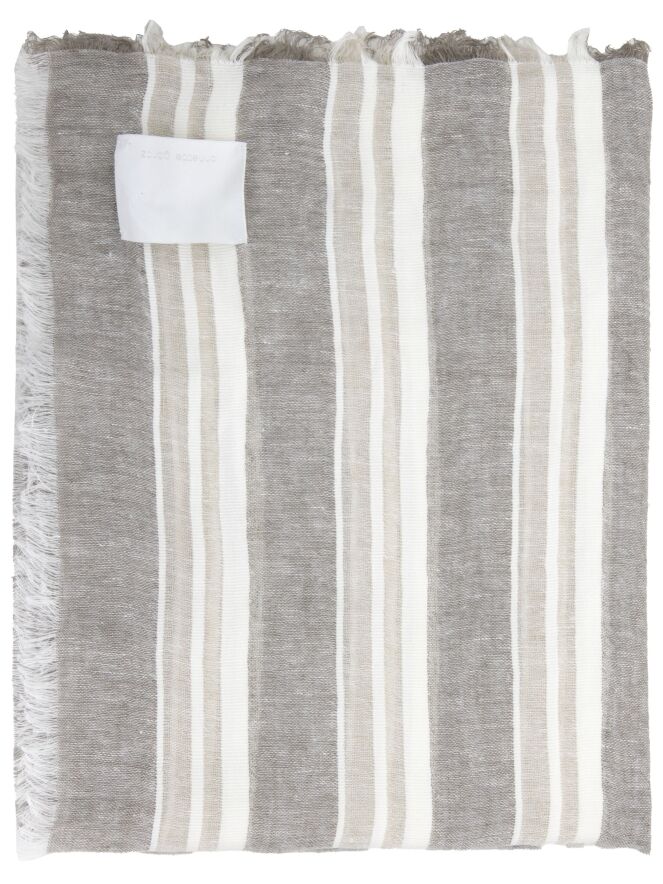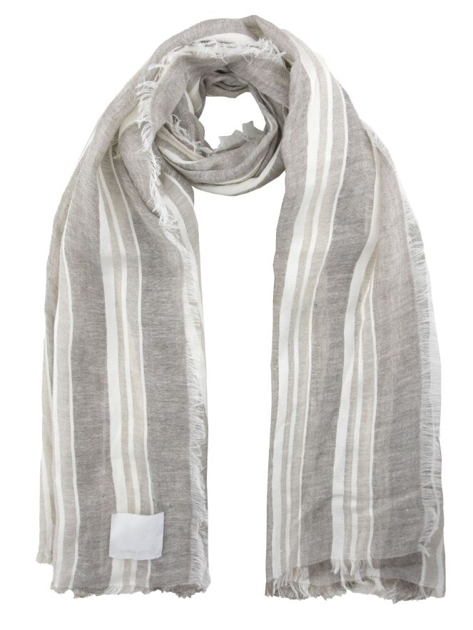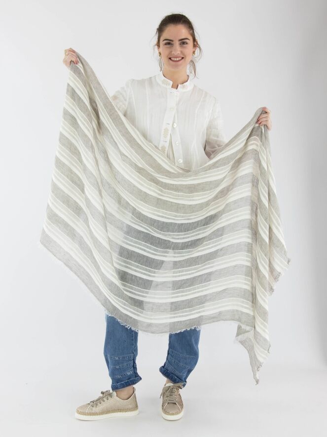 A semi-transparent shawl by Annette Görtz featuring a striped pattern in various shades of beige and off-white. The edges of the shawl are delicately frayed. This shawl should be hand-washed.