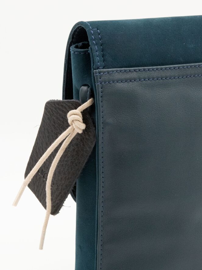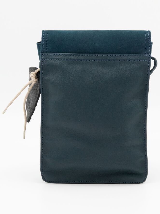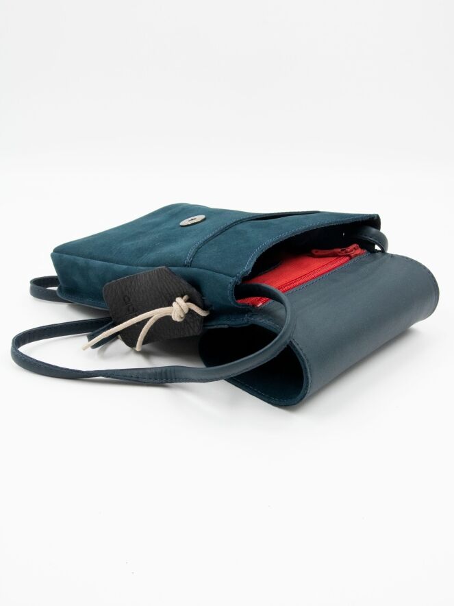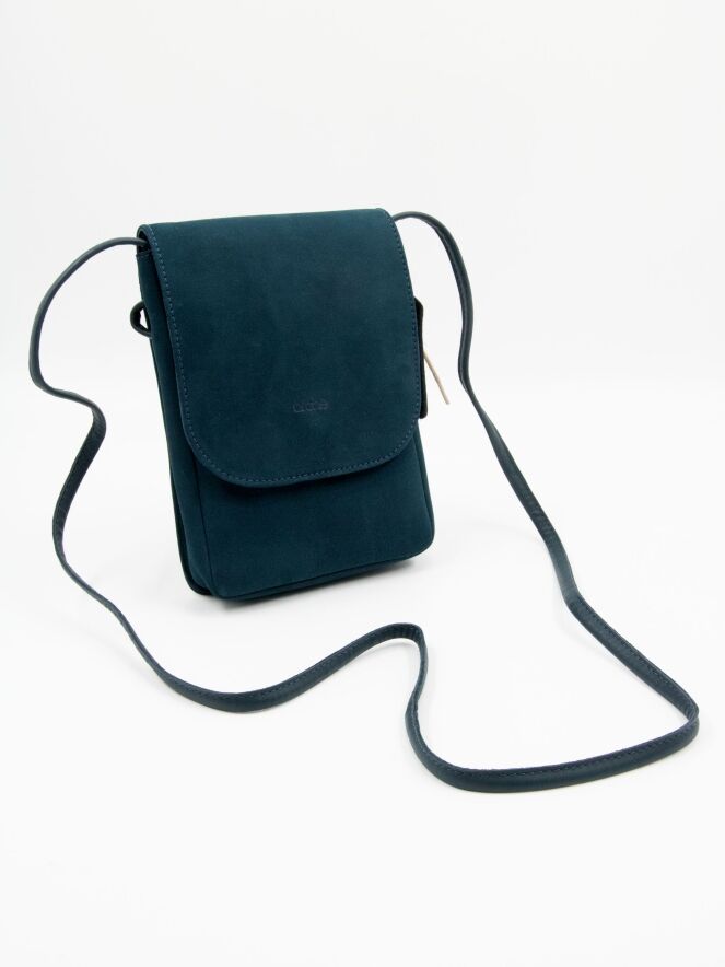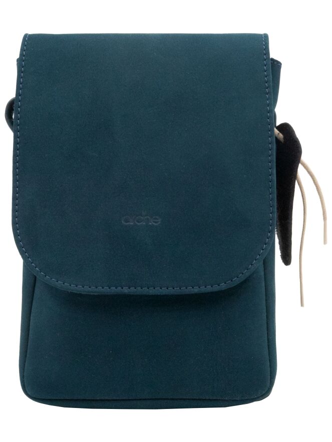 Bag by Arche, made of suede in petrol blue. The bag features a long shoulder strap and a small zippered pocket inside.