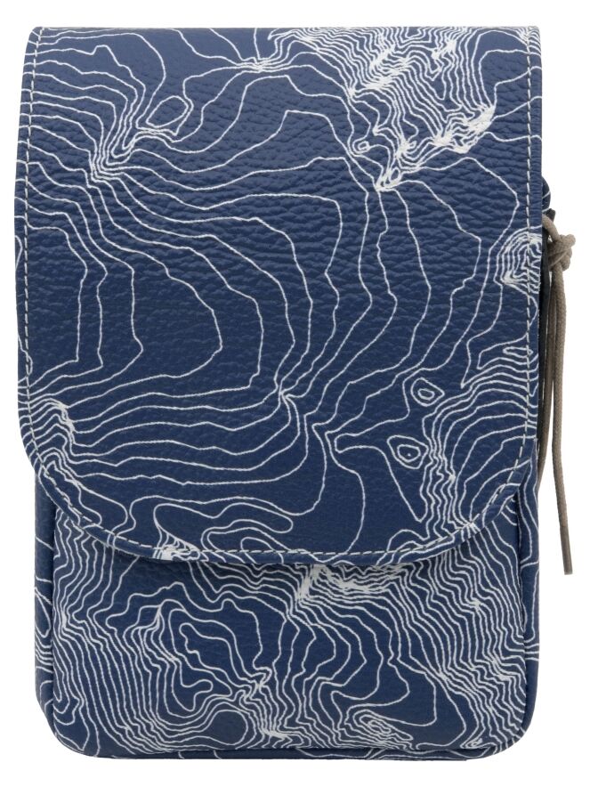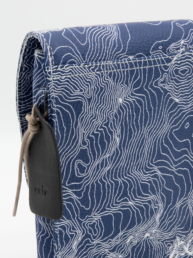 A bag by Arche, made of leather with a graphic print of white lines on a blue background. The bag features a long shoulder strap and a small zipped pocket inside.