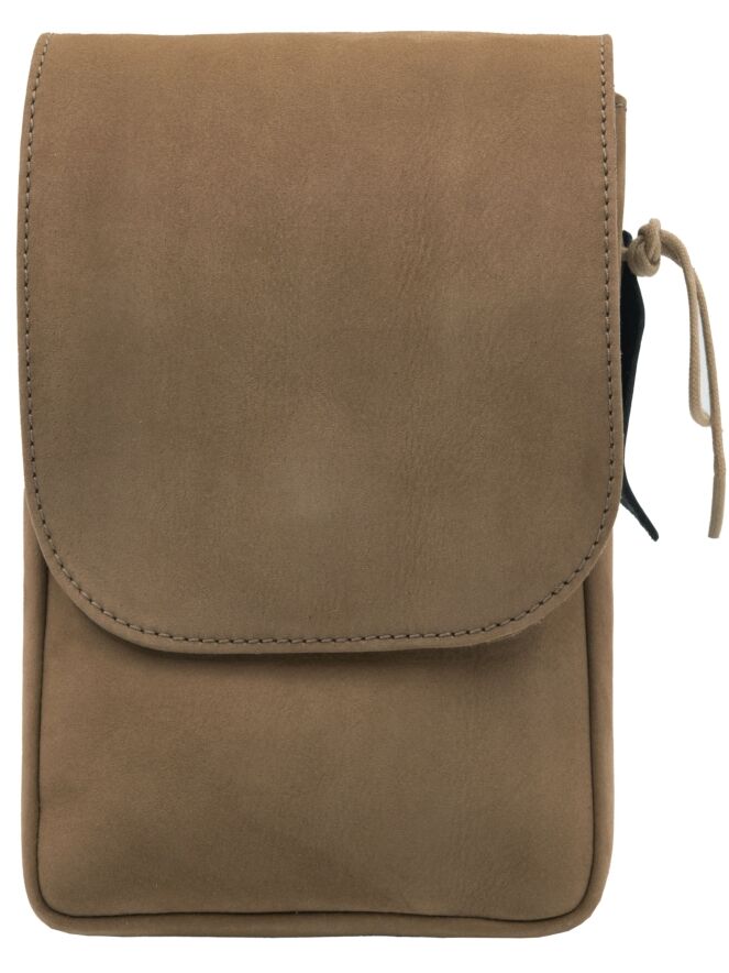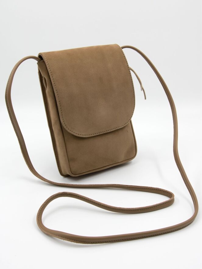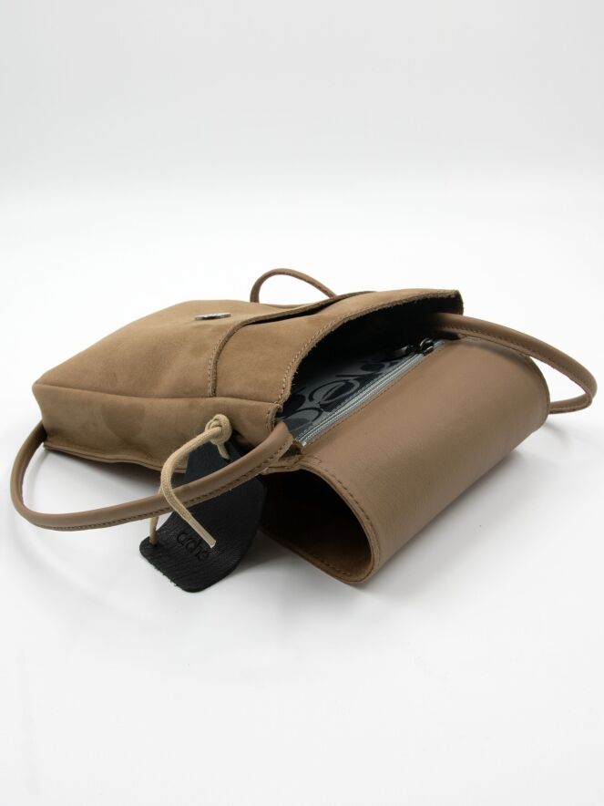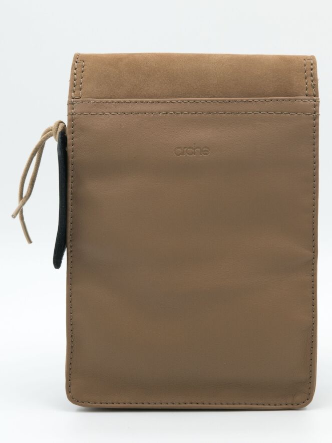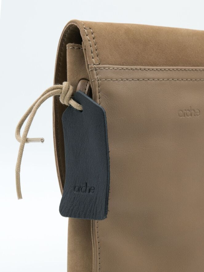 A bag by Arche, made of leather in a sand color. The bag features a long shoulder strap and a small zipped pocket inside.