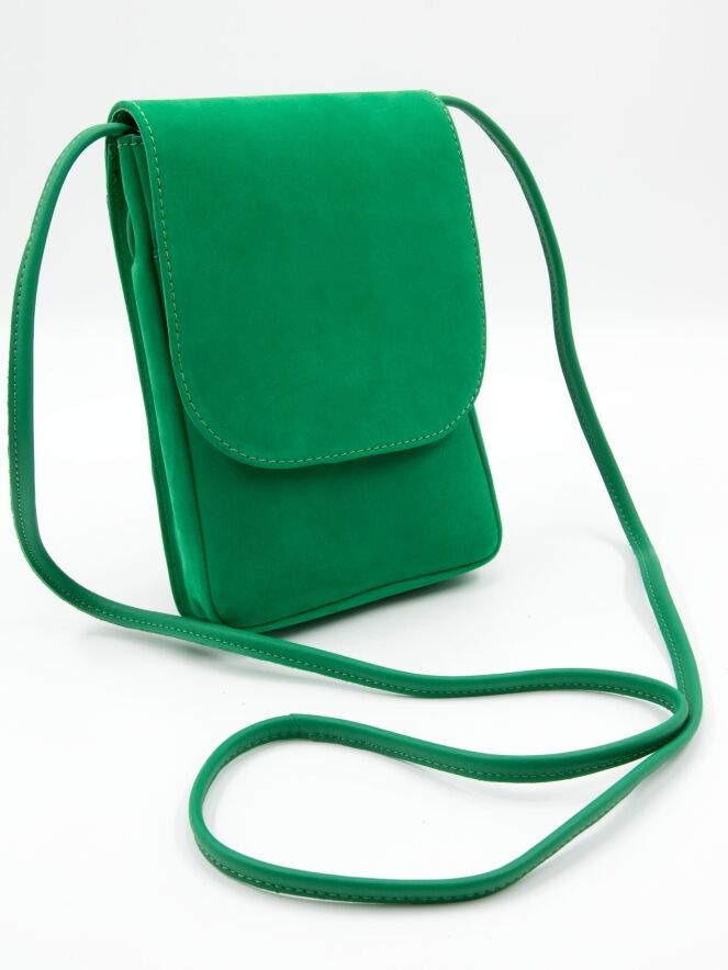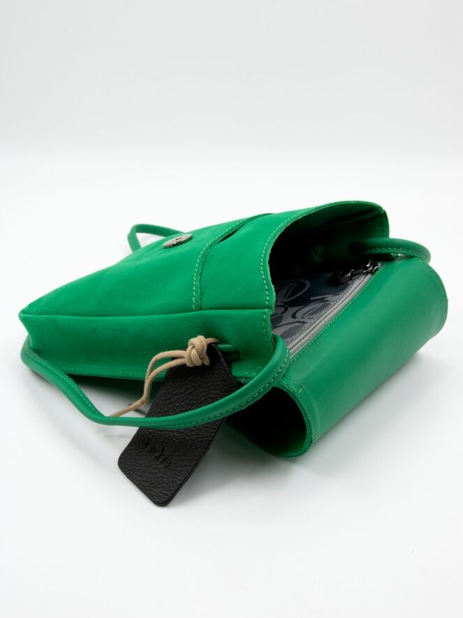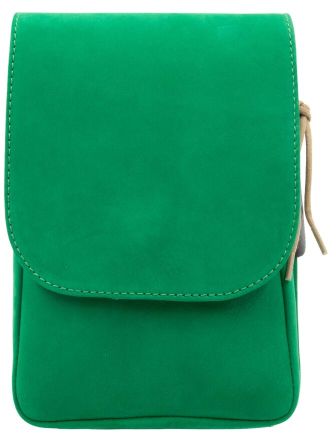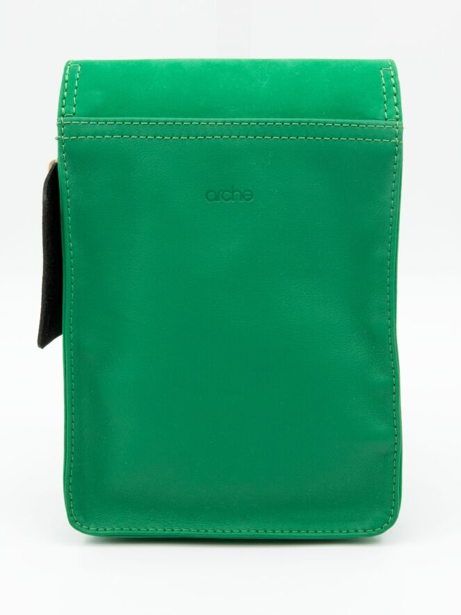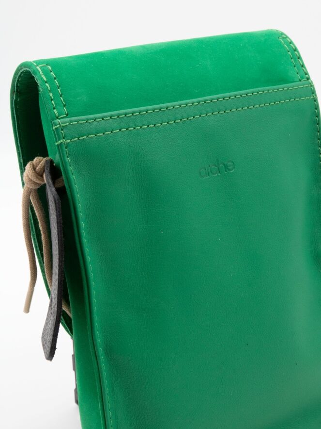 A bag by Arche, made of leather in emerald green. The bag features a long shoulder strap and a small zipped pocket inside.