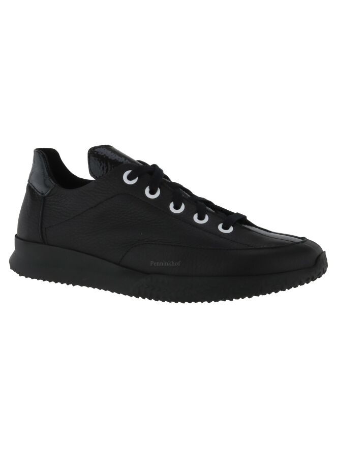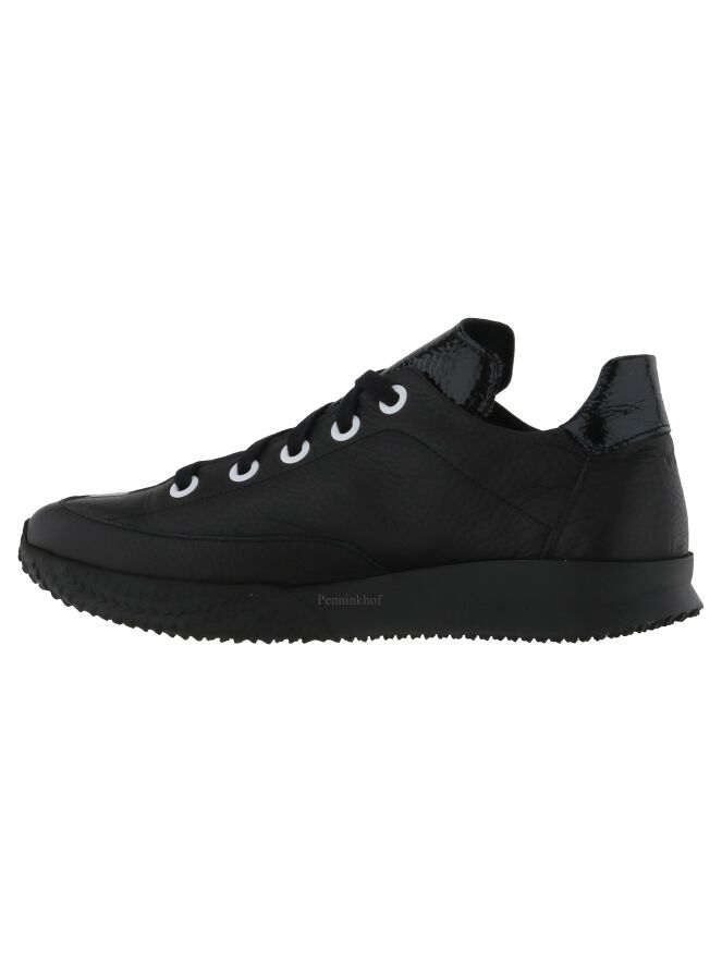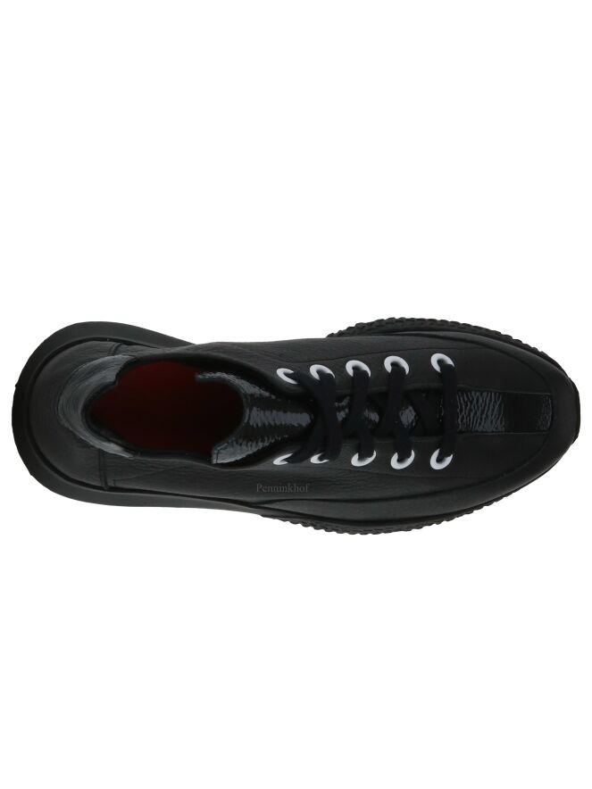 A sneaker from Arche in the color black. From the nose of the sneaker to the tongue is a wide black lacquer trim. This color detail is reflected on the heel. The inside is lined with leather.