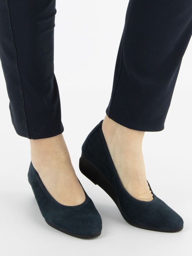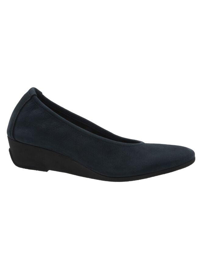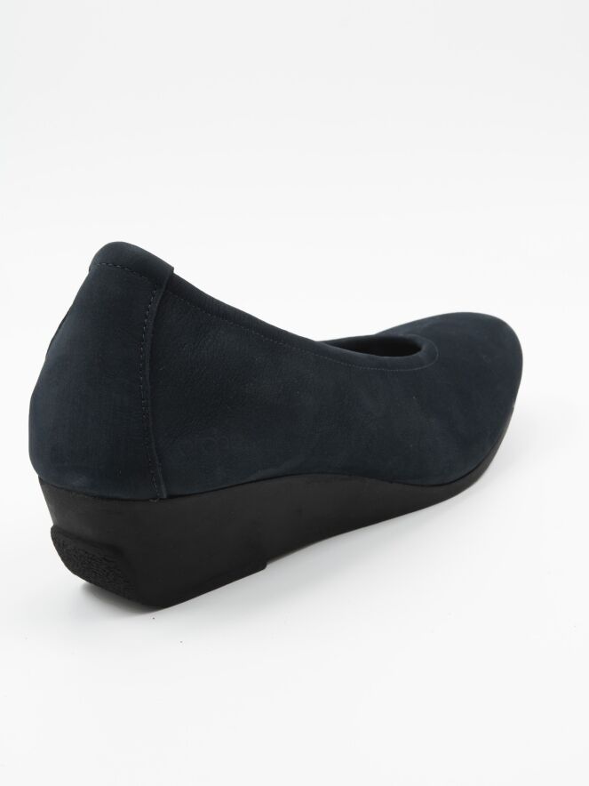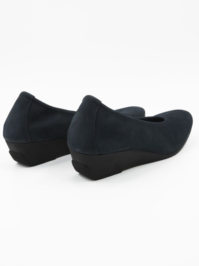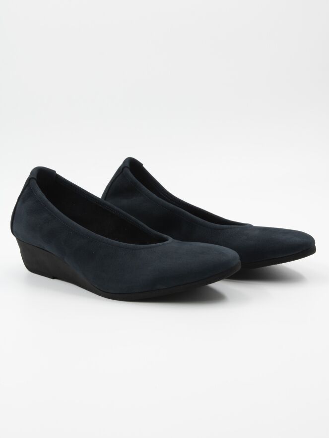 A loafer from Arche in a navy blue colour. The loafer has a latex wedge heel and a slim toe. The inside is unlined.