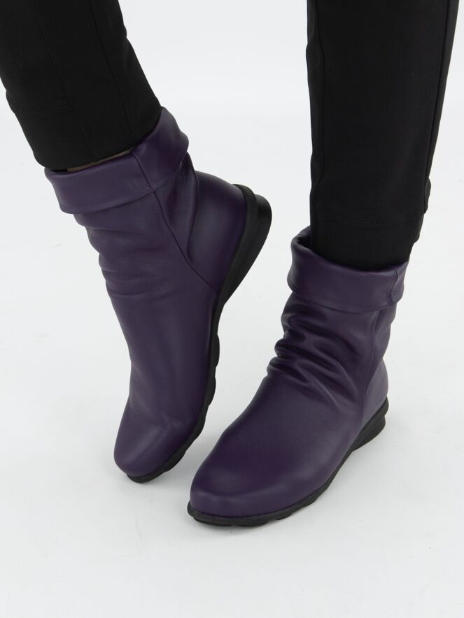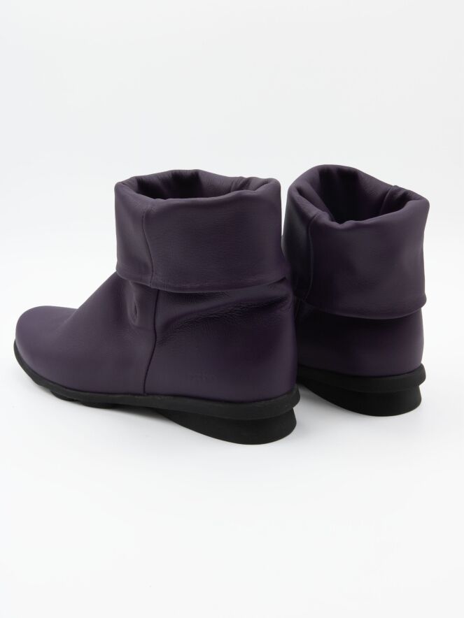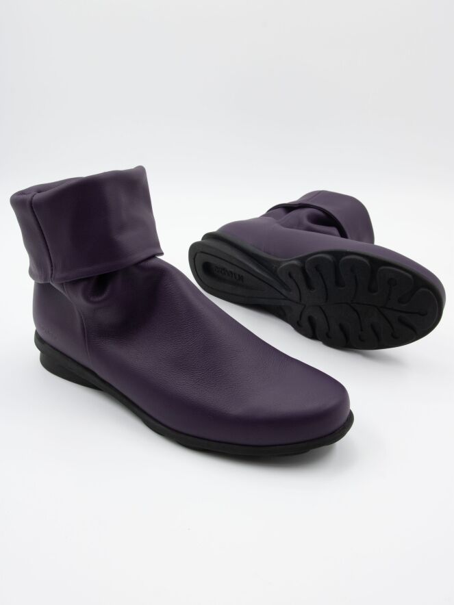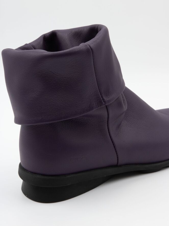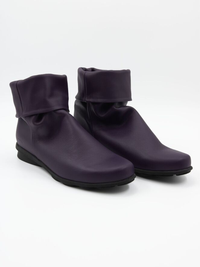 An ankle boot from Arche in a dark purple color. The shaft features a wide cuff. The sole is slightly elevated at the heel. The interior is unlined.