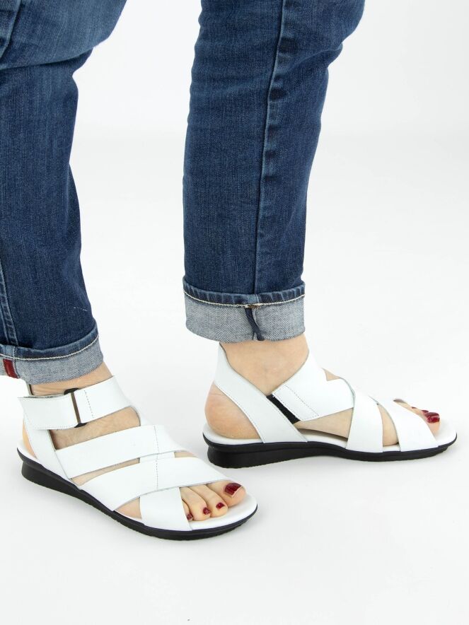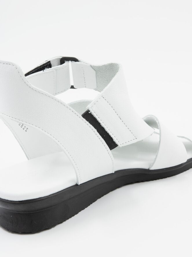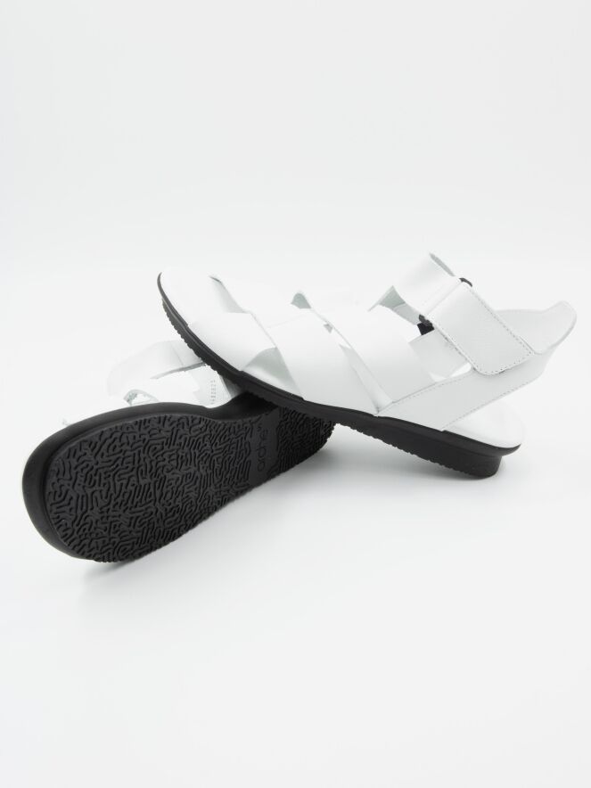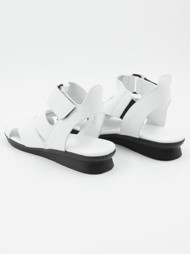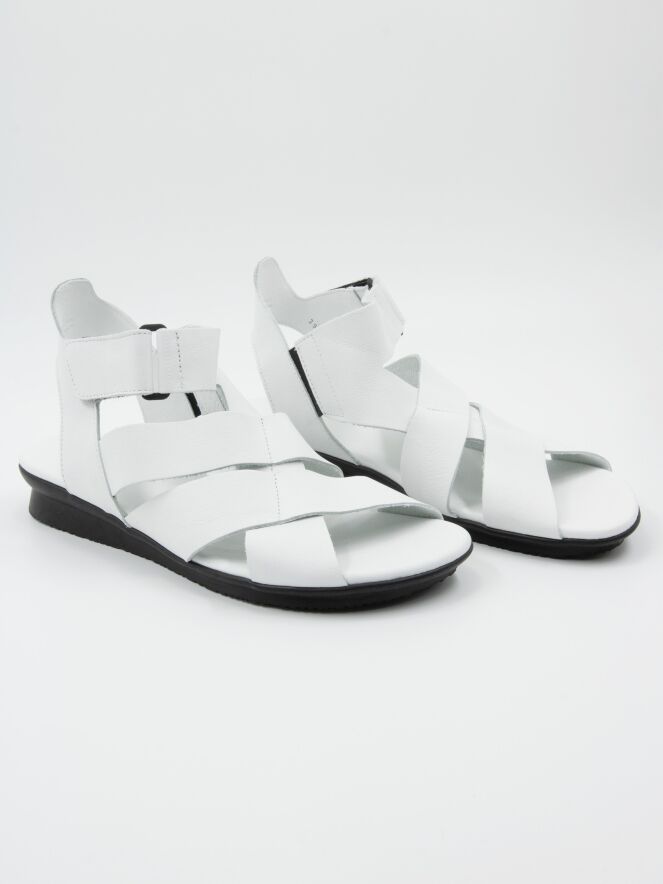A sandal from Arche in the color white. The leather crosses over the forefoot, and the strap to the heel is adjustable with Velcro. The footbed is made of the same leather as the sandal.