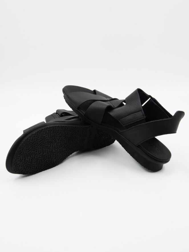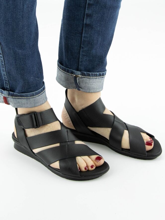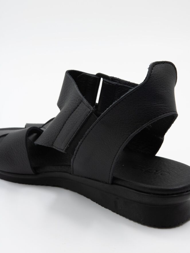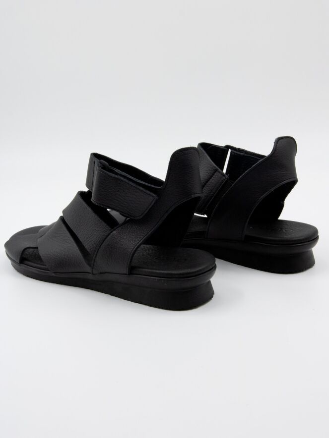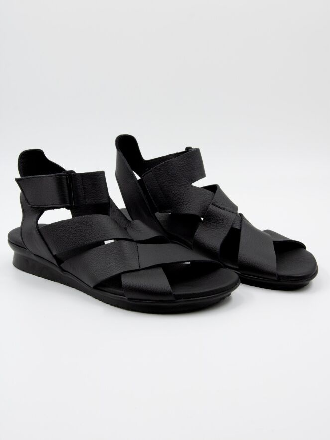A sandal from Arche in the color black. The leather crosses over the forefoot, and the strap to the heel is adjustable with Velcro. The footbed is made of the same leather as the sandal.