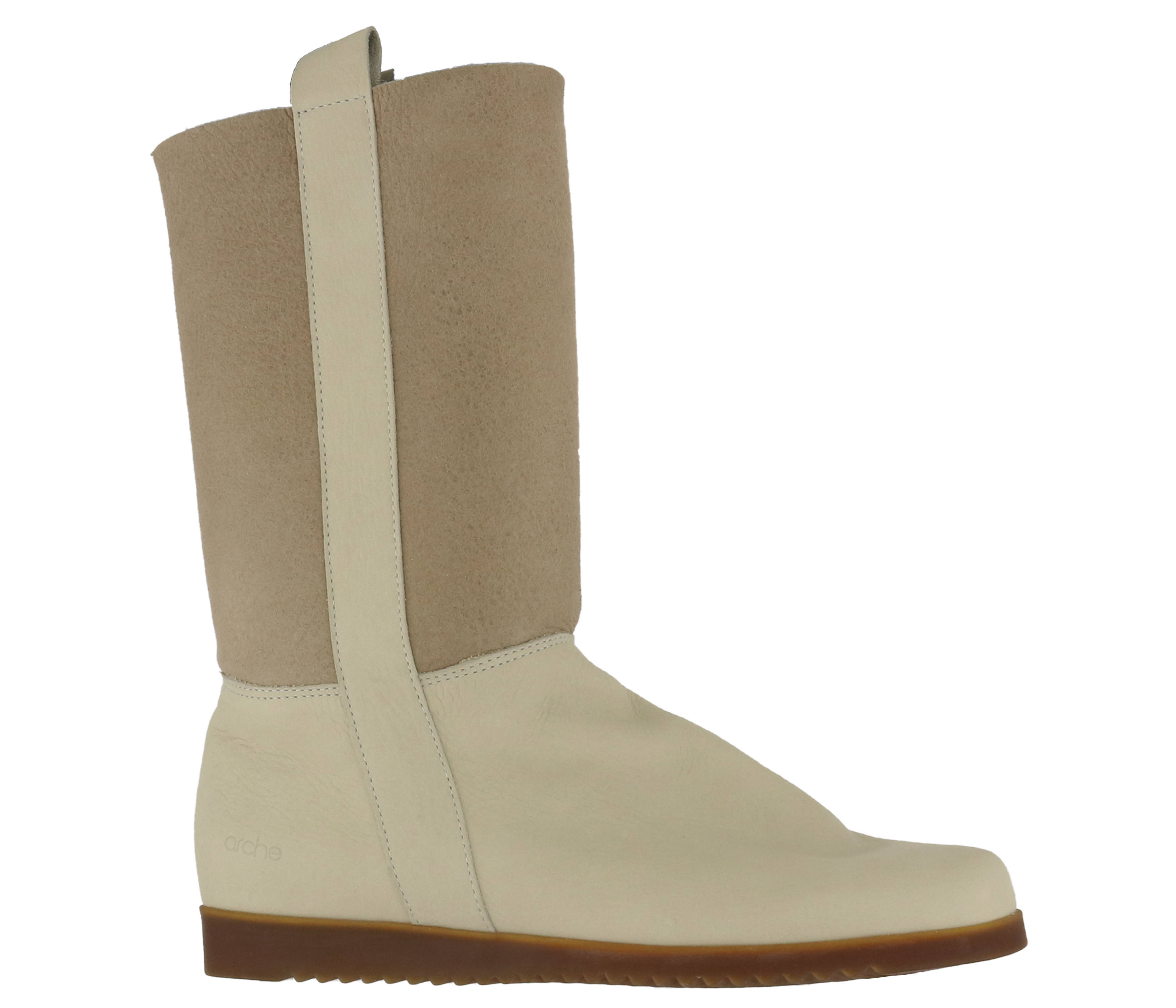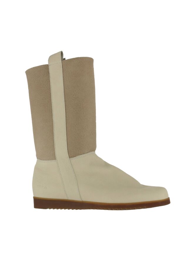 A half high boot from Arche in the color cream white. The shaft is in a soft taupe color. There is a creamy white trim on both sides of the shaft. The latex sole is in a cognac color. The boot has a round toe and the inside is made of fur.