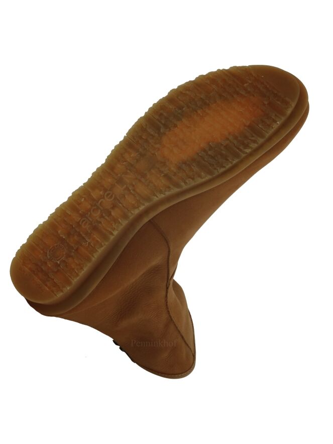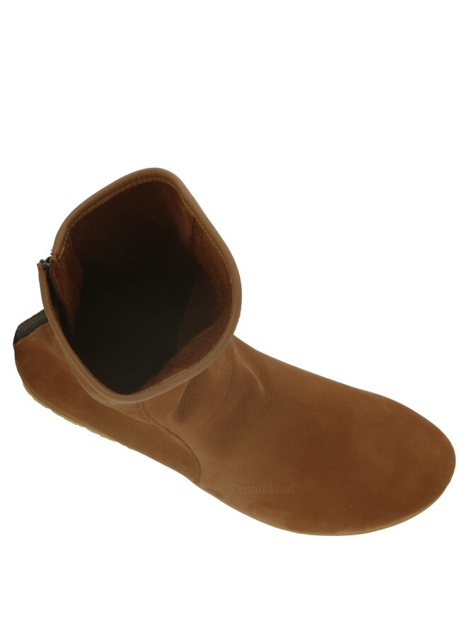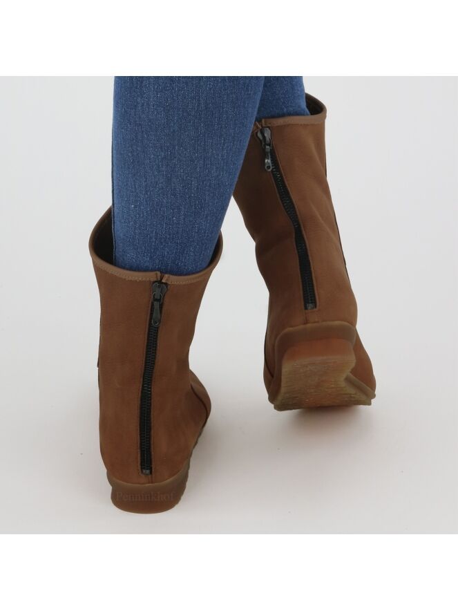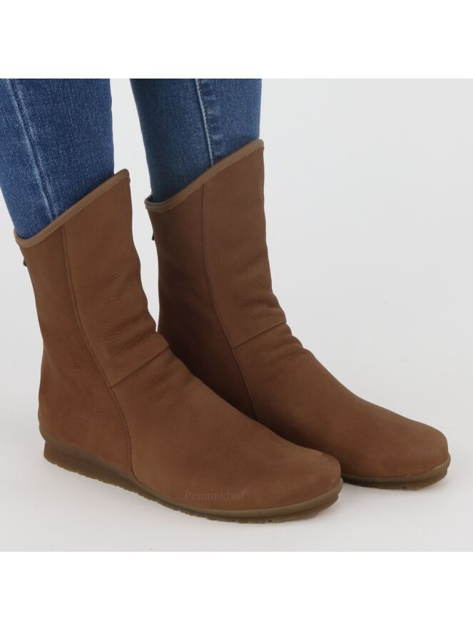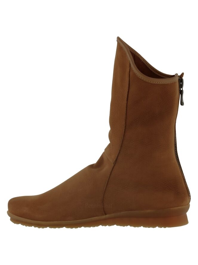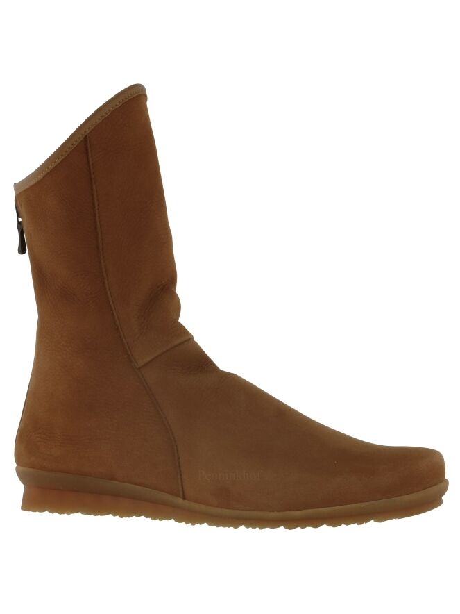 A boot from Arche in the color cognac. The shaft is 5 cm higher at the front than at the back. At the back of the shaft is a black zipper. The boot has a round toe and the inside is unlined.