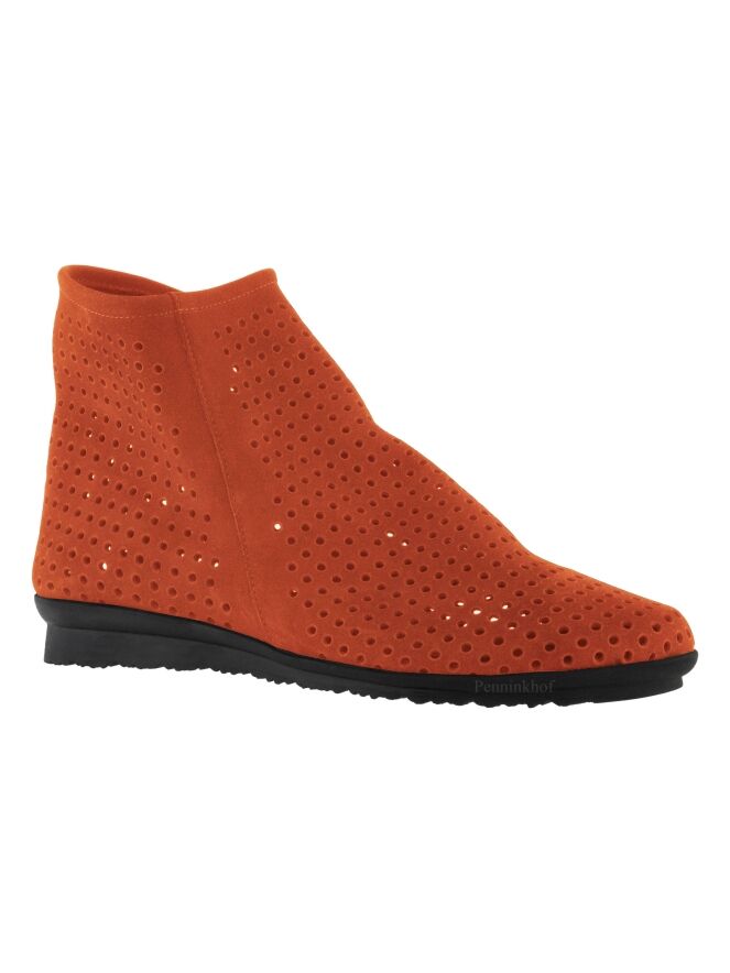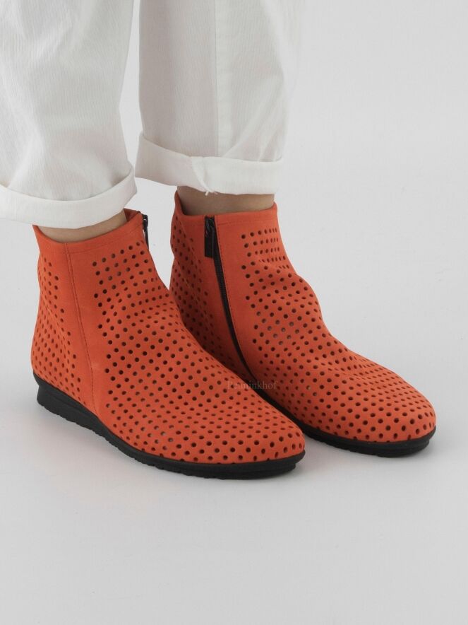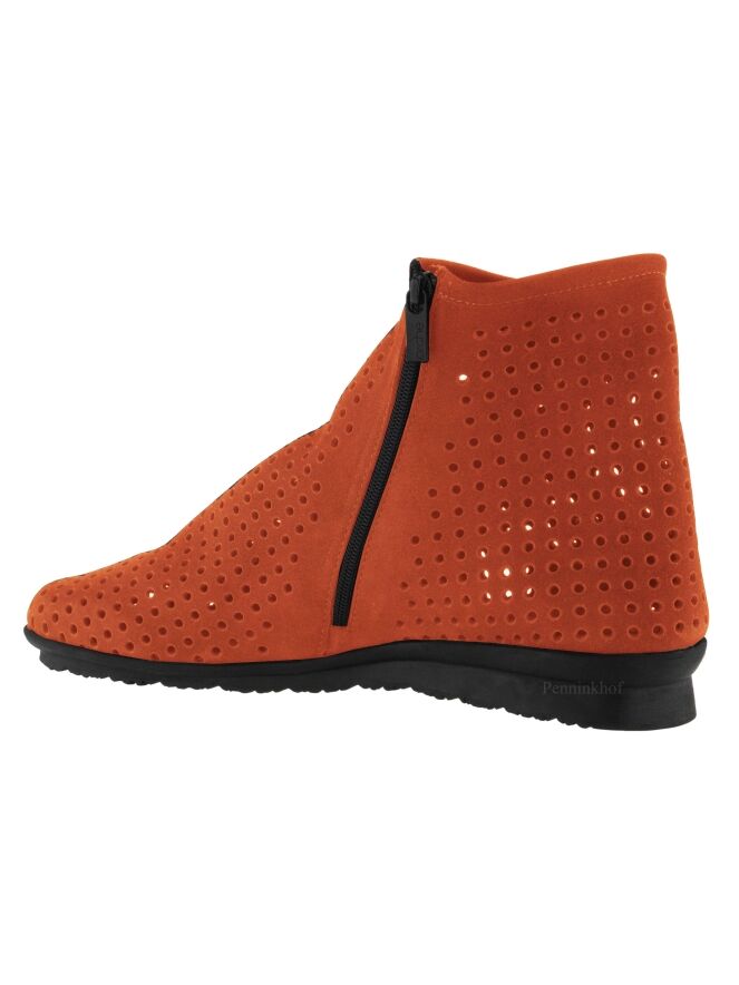 A short boot from Arche in the color orange. The nubuck suede is finely perforated. There is a zipper on the inside and the boot has a round toe.